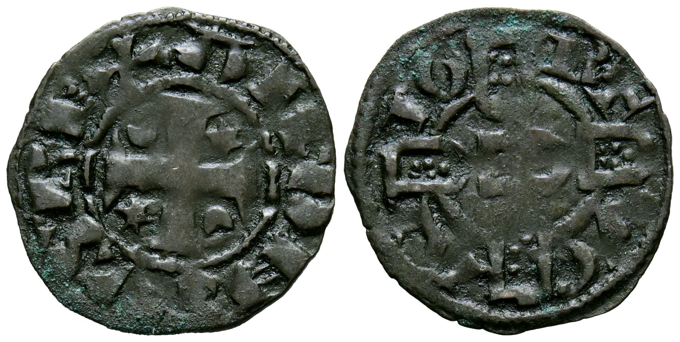 PORTUGAL, D. Alfonso III (1248-1279). Dinero. (Ve. 0,62g/17mm). S/D. (Gomes 01.12). Anv: Cruz patada con crecientes en el 1º y 4º cuadrante y estrellas en el 2º y 3º, todo dentro de gráfilar circular, alrededor leyenda: ALFONSVS REX. Rev: Armas de portugal, alrededor en los cuadrantes: PO RT VG AL. MBC. Verdín.
