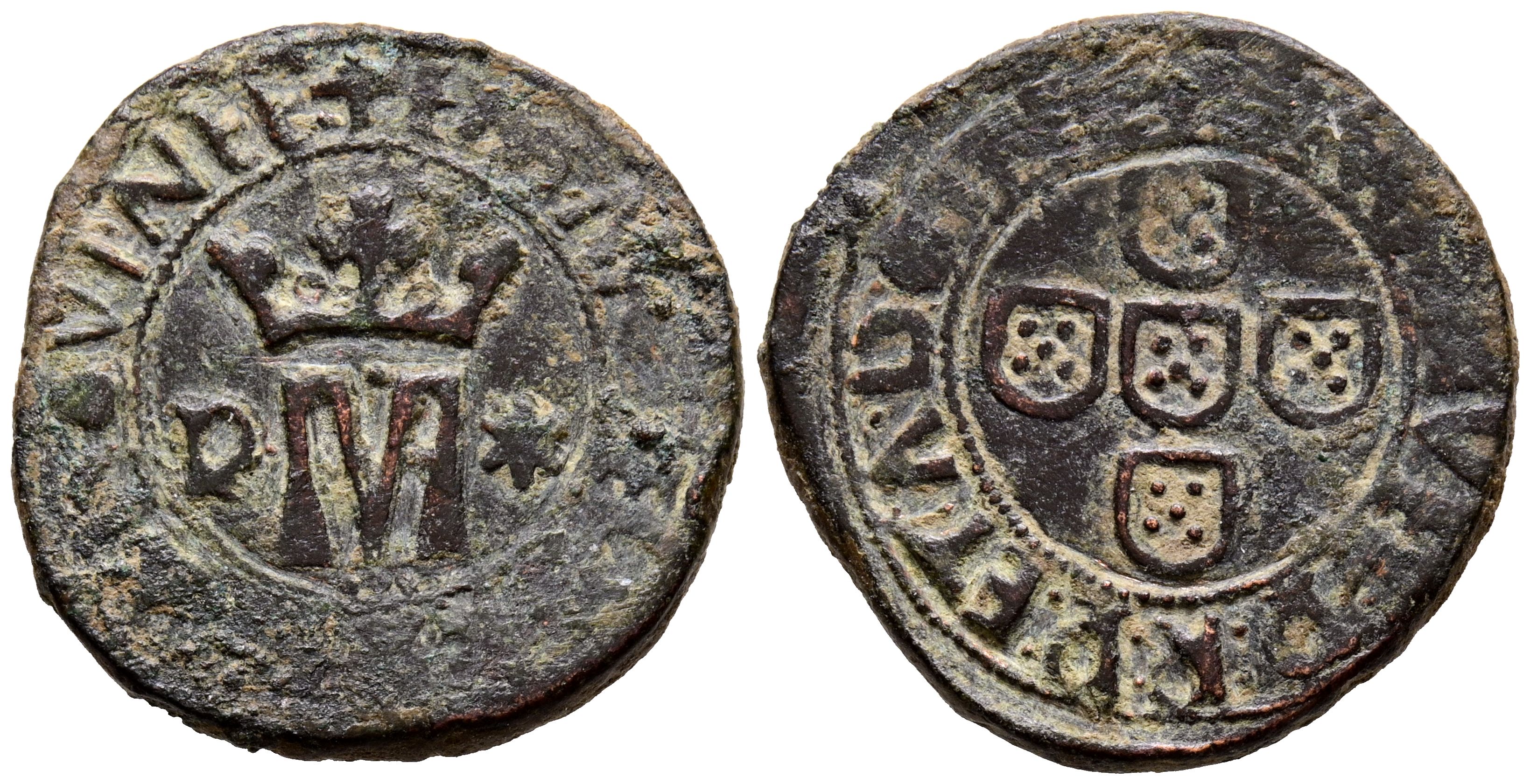 PORTUGAL. Manuel I. 1/2 Real. (Ae. 5,72g/23mm). 1511. Porto. (Gomes 07.03). Anv: M coronada, a los lados P y estrella, todo dentro de gráfila circular, alrededor leyenda: EMANVEL P R ET A D GVINEE. Rev: Armas de portugal dentro de gráfila circular, alrededor leyenda: EMANVEL P R ET A D GVINE. MBC.