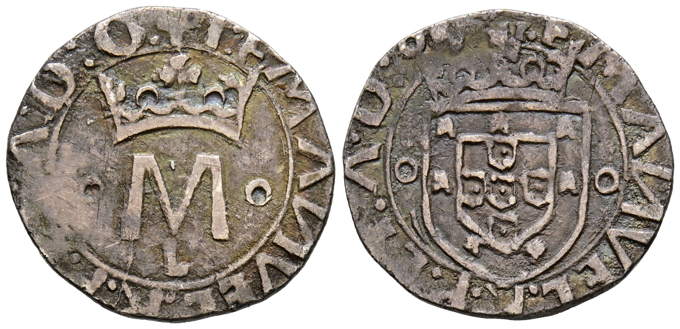 MANUEL I (1495-1521). Vintém. (Ar. 1,73g/18mm). Lisboa. (Gomes 30.01). Anv: M coronada entre roeles, debajo L, todo dentro de gráfila circular, alrededor leyenda: I EMANVEL R P ET A D G. Rev: Armas de Portugal entre roeles dentro de gráfila circular, alrededor leyenda: I EMANVEL R P ET A D G. MBC.