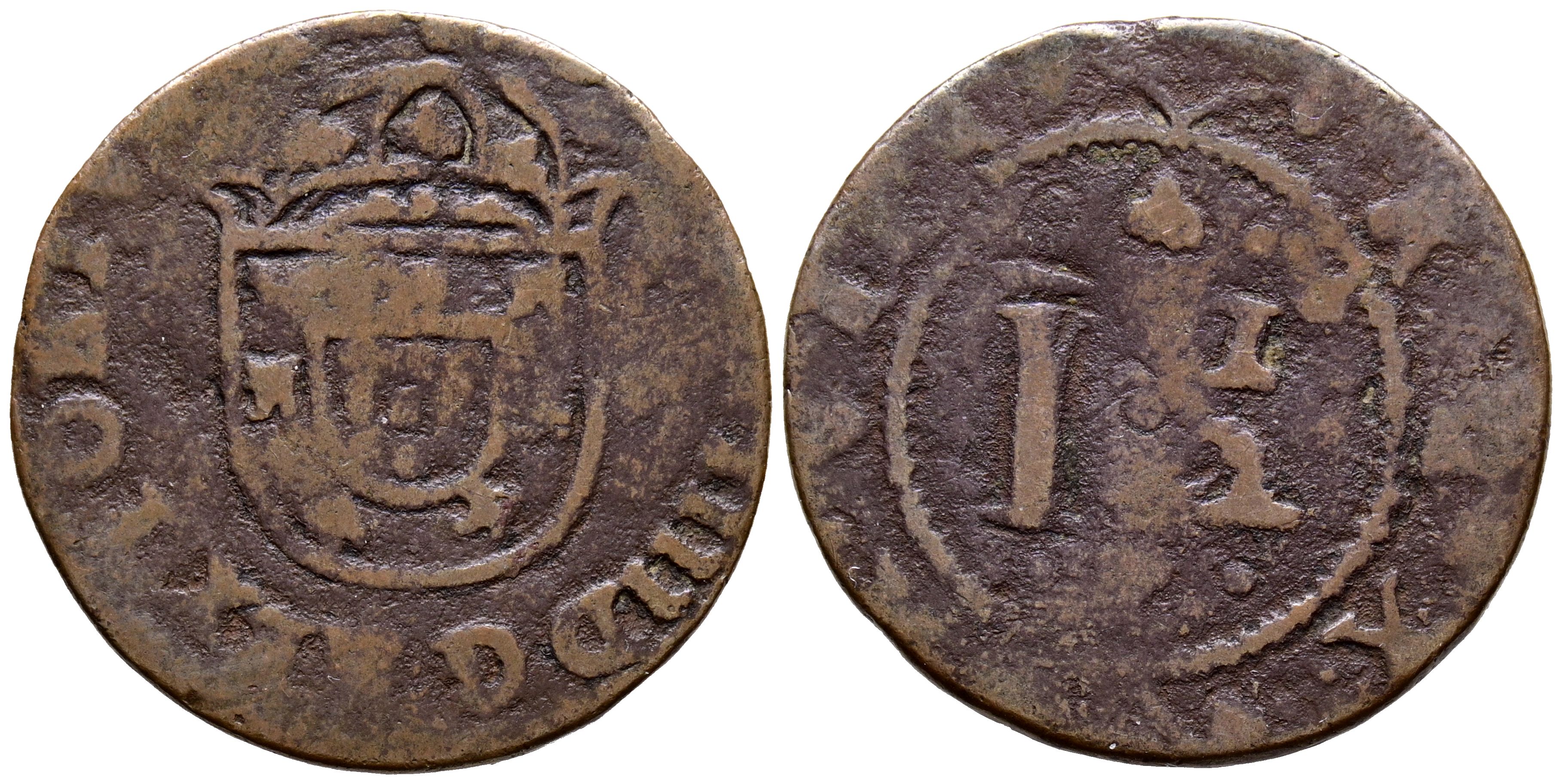 PORTUGAL, D. João IV (1640-1656). 1 1/2 Real de cobre. (Ae. 4,26g/26mm). Lisboa. Anv: Escudo de Portugal, alrededor leyenda: IOANNES IIII D REX PORTVGALI. Rev: 1 1/2, alrededor leyenda: REX XVIII. BC+.