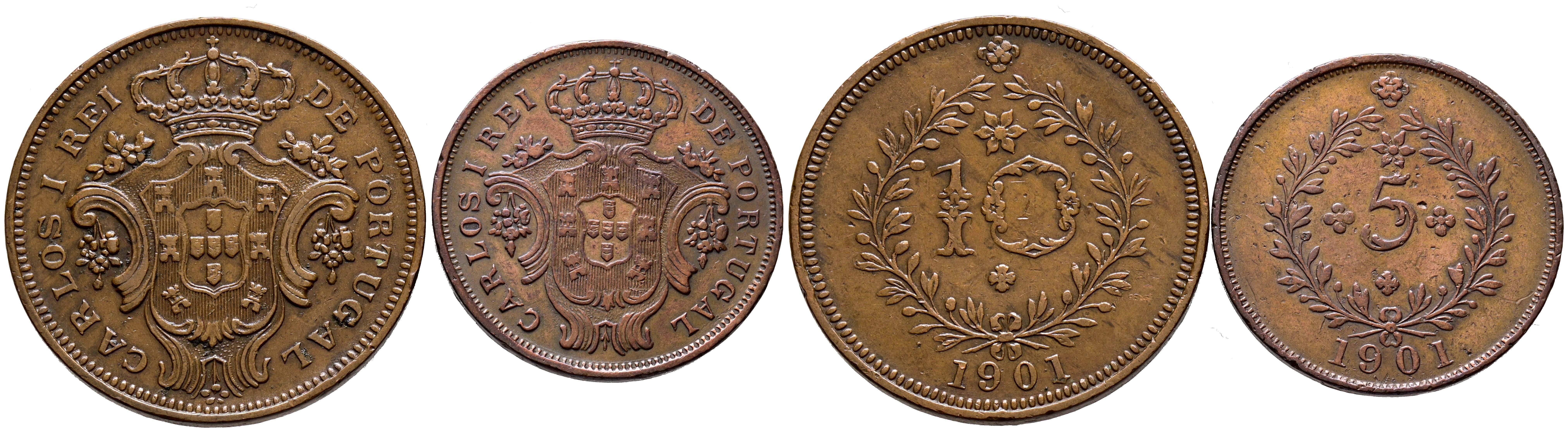 PORTUGAL. Bonita pareja de 5 y 10 Reis acuñados para Azores en 1901 durante el reinado de Carlos I. Diferentes estados de conservación. A EXAMINAR.