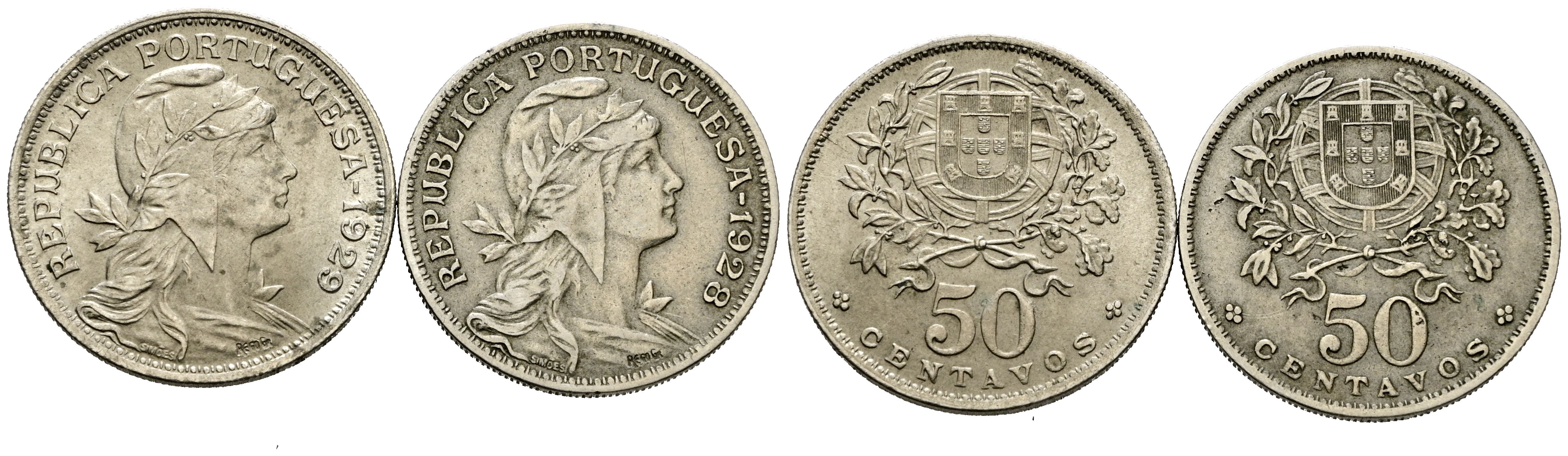 PORTUGAL. Pareja de 50 Centavos acuñados en 1928 y 1929. (Gomes 20.02-03). Diferentes estados de conservación. A EXAMINAR.