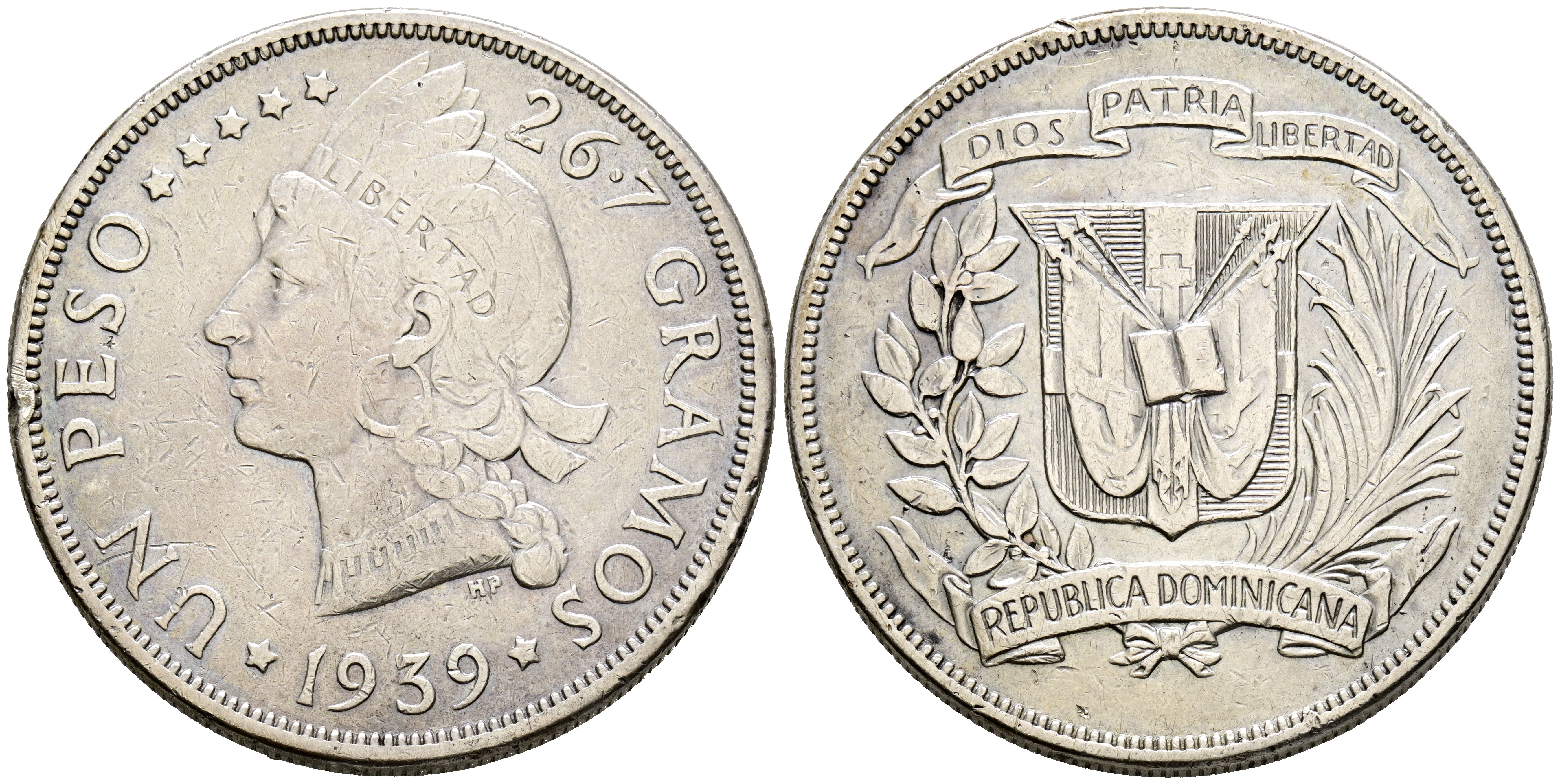 REPÚBLICA DOMINICANA. 1 Peso. (Ar. 26,50g/38mm). 1939. (Km#22). MBC.