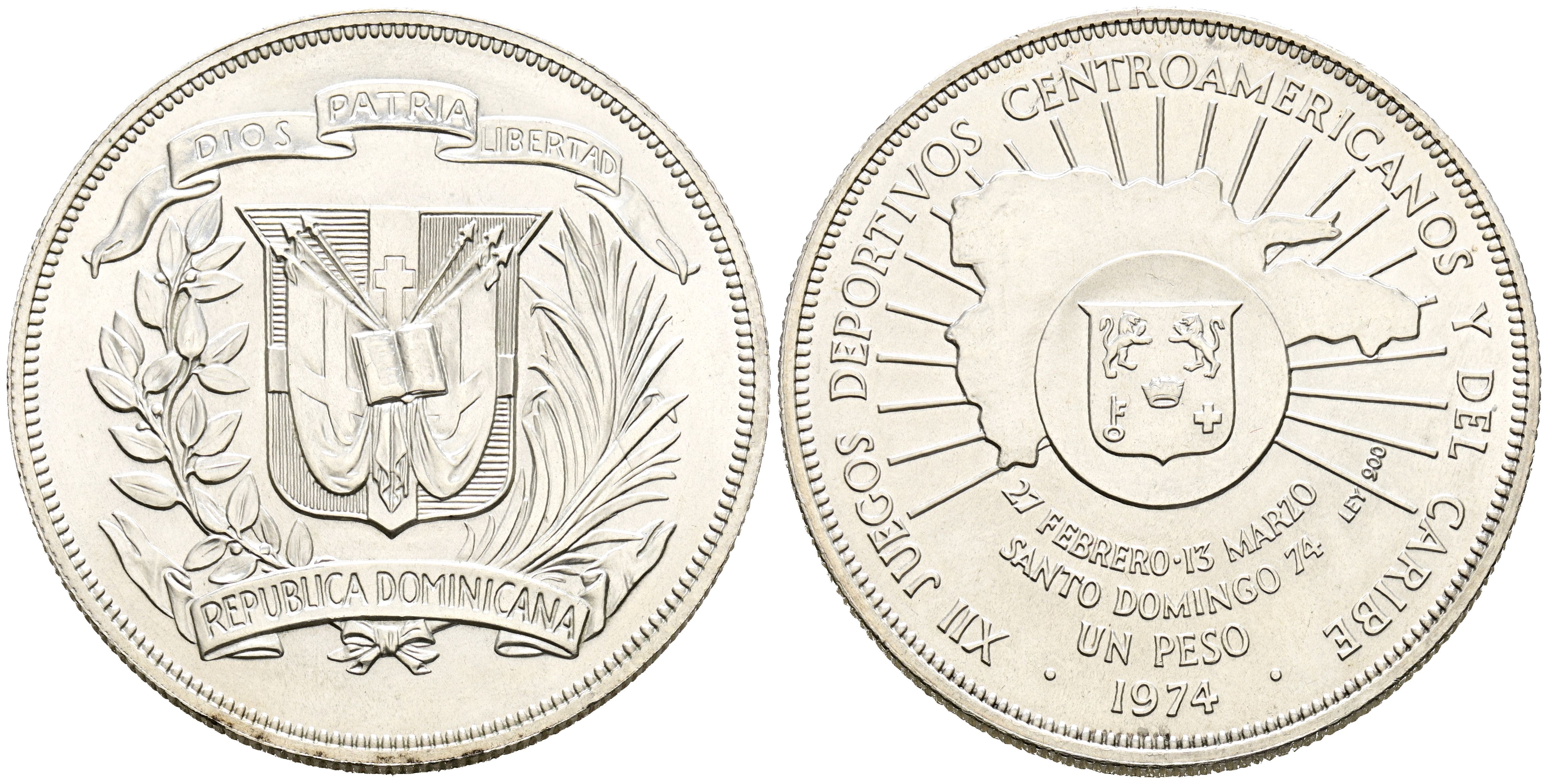 REPÚBLICA DOMINICANA. 1 Peso. (Ar. 26,95g/38mm). 1974. XII Juegos de América Central y Caribe. (Km#35). SC-.
