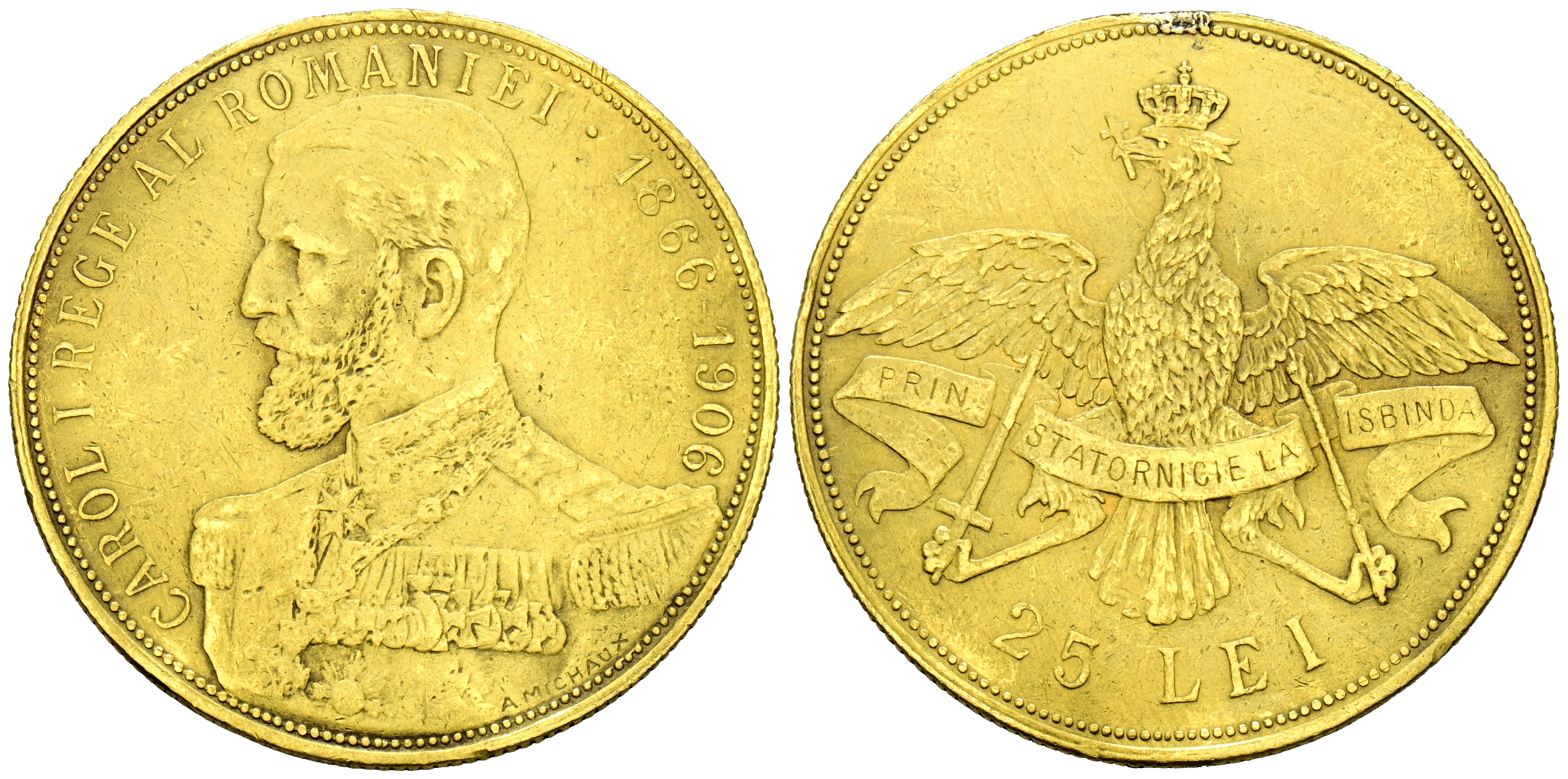 RUMANÍA. 25 Lei (Au. 8,03g/30mm). S/D (1906). Carol I. 40 Aniversario de su reinado. (Km#38). MBC. Marcas de engarce. Muy escasa.