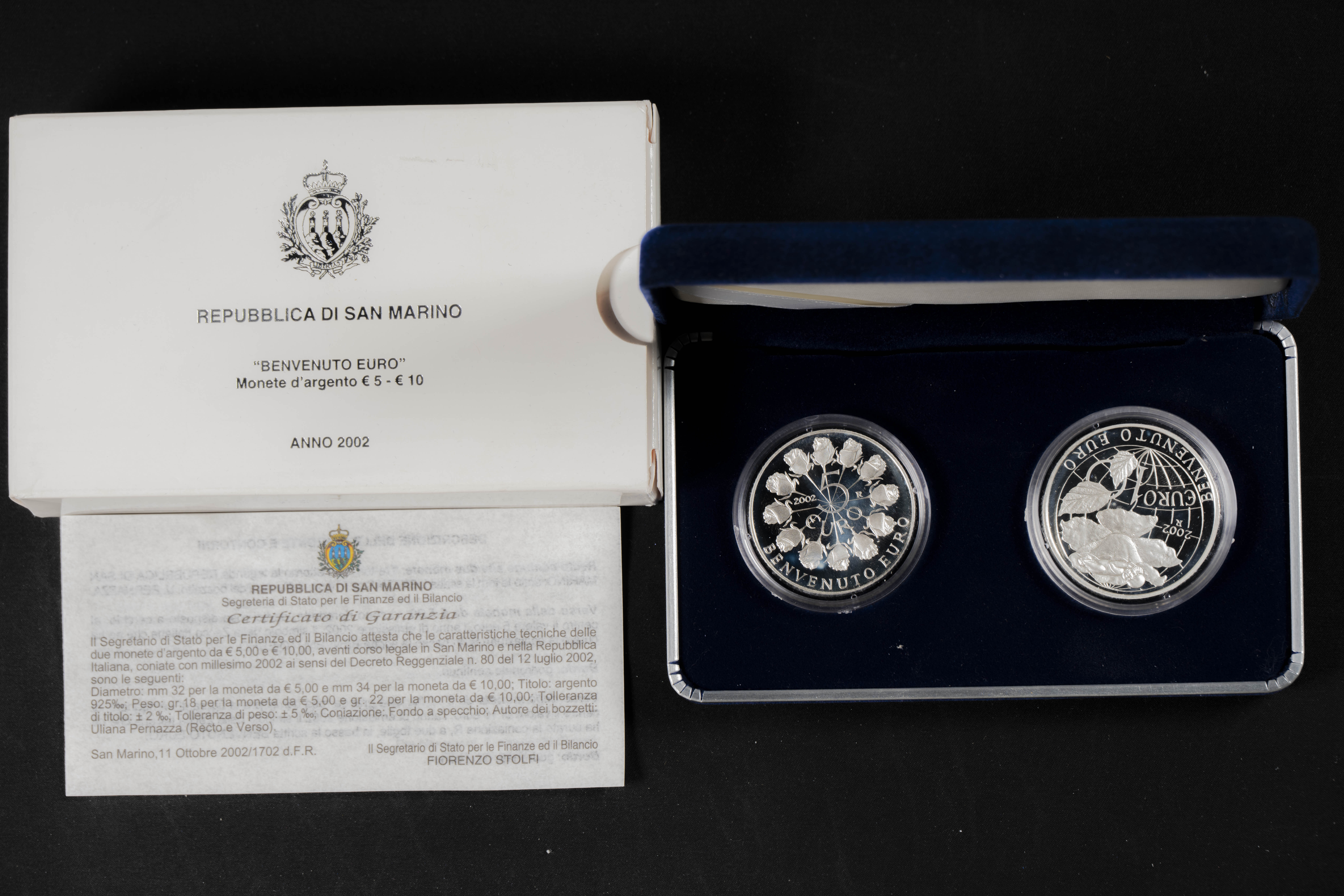 SAN MARINO. Set completo y compuesto por 2 valores en plata de 5 y 10 Euros. 2002. Bienvenido Euro. PROOF. Incluye estuche original y certificado de autenticidad.