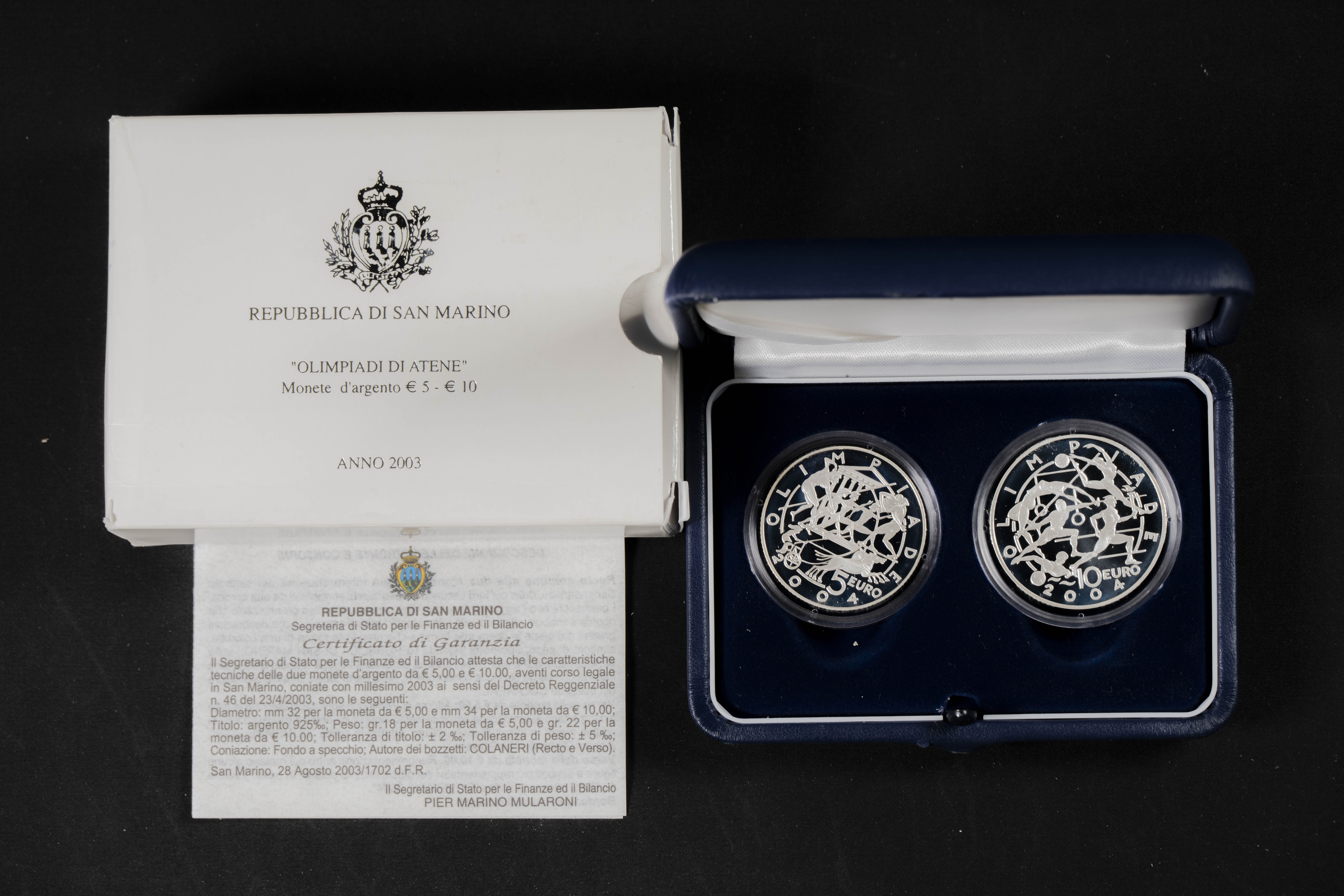 SAN MARINO. Set completo y compuesto por 2 valores en plata de 5 y 10 Euros. 2003. Olimpiadas de Atenas 2004 PROOF. Incluye estuche original y certificado de autenticidad.