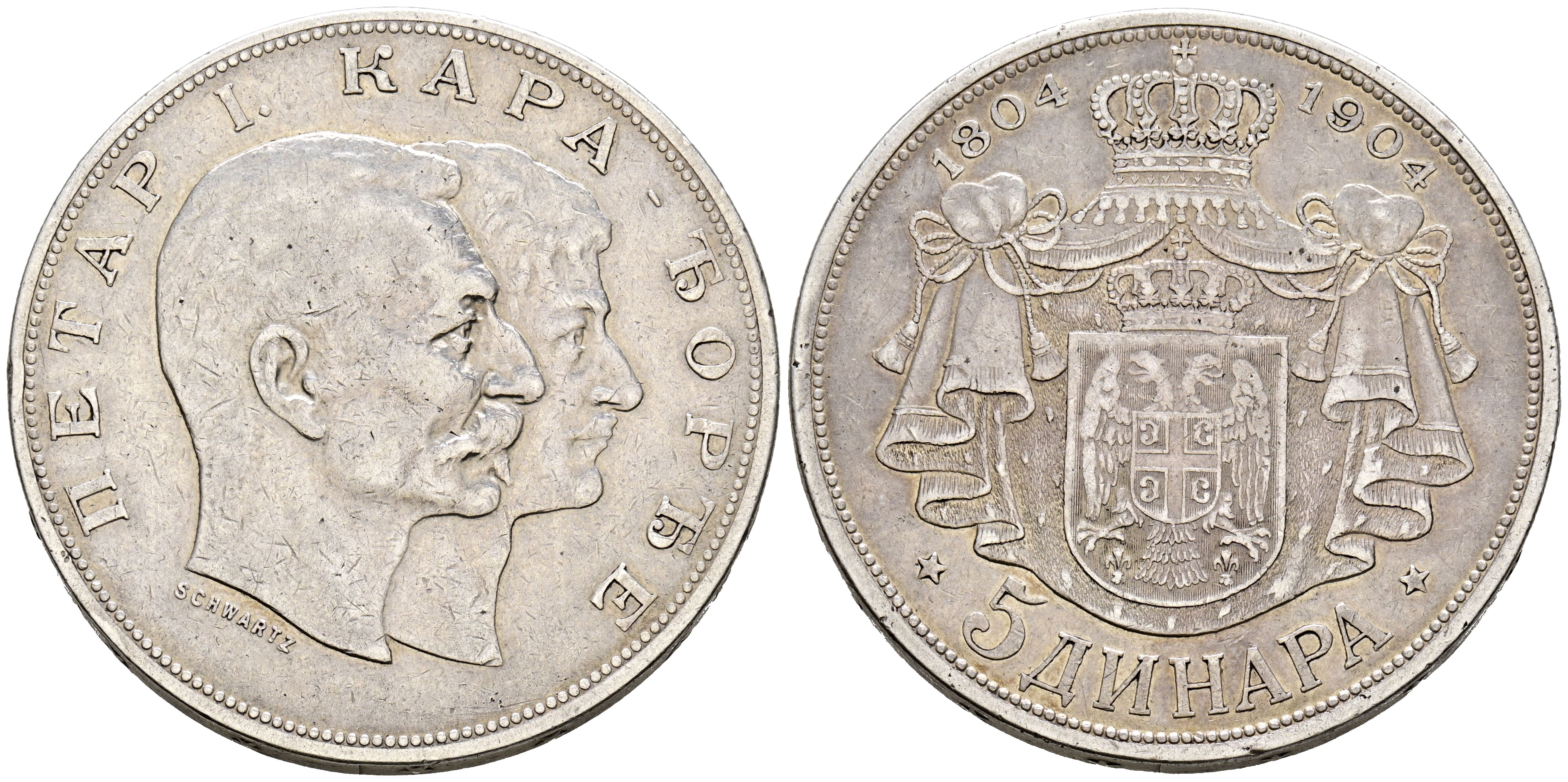 SERBIA. 5 Dinara. (Ar. 24,88g/37mm). 1904. Centenario de la Dinastía Karadordevic. (Km#27). MBC.