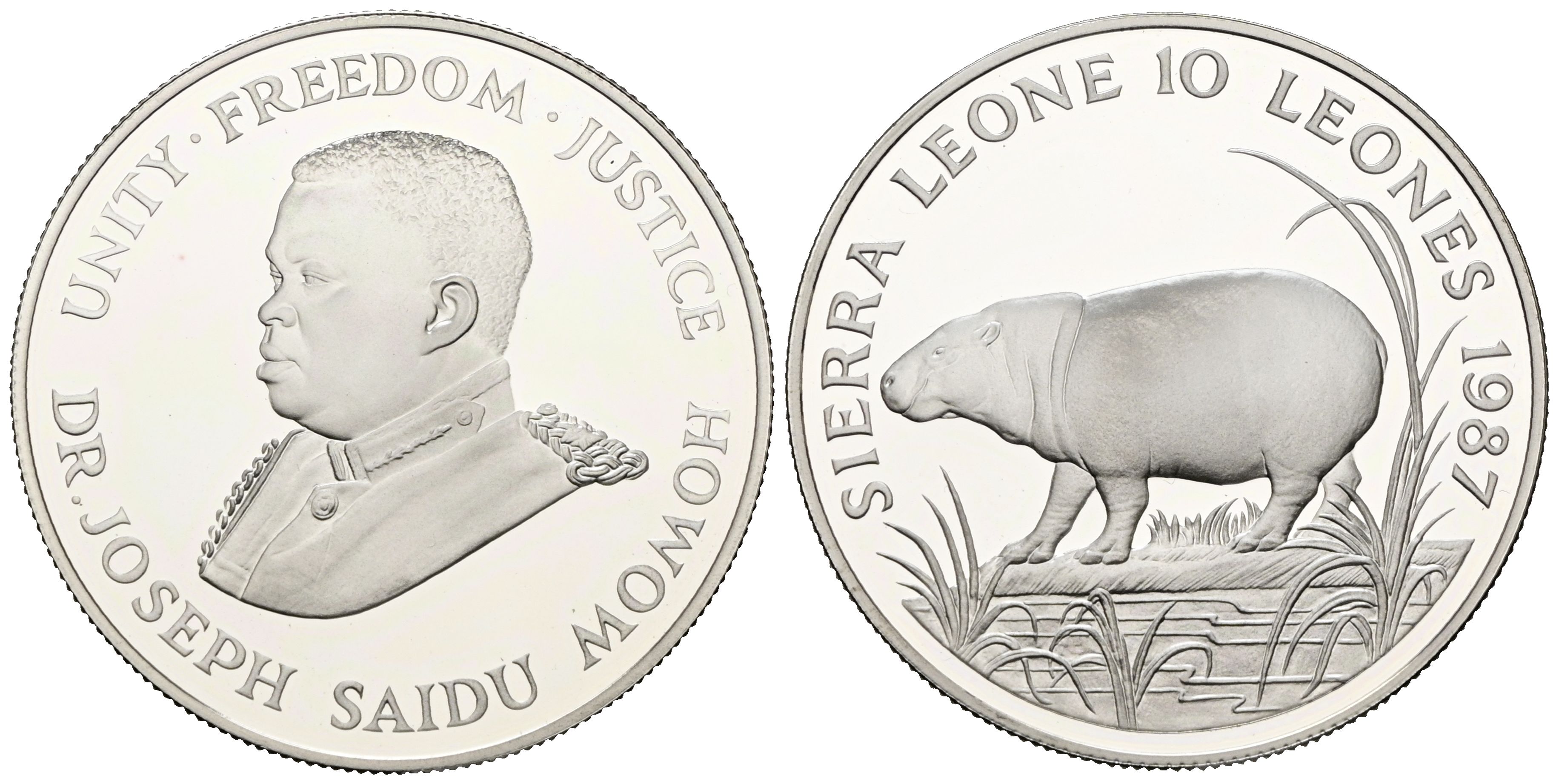 SIERRA LEONA. 10 Leones. (Ar. 28,20/39mm). 1987. Vida salvaje: Hipopótamo. (Km#41) PROOF.