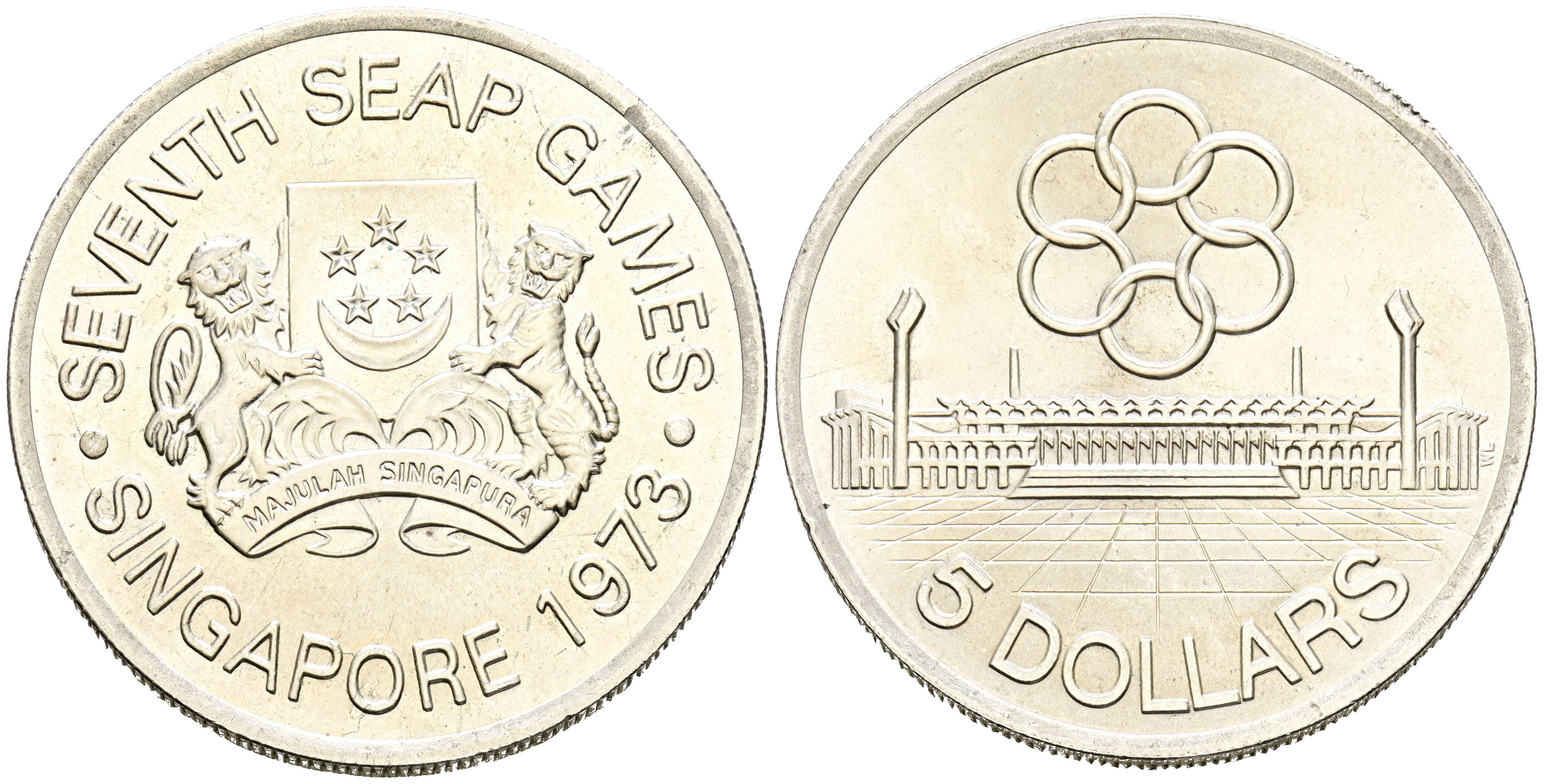 SINGAPUR. 5 Dollars. (Ar. 25,10g/38mm). 1973. VII Juegos del Sudeste Peninsular Asiático. (Km#10). EBC+. Ligero golpe en listel del anverso.