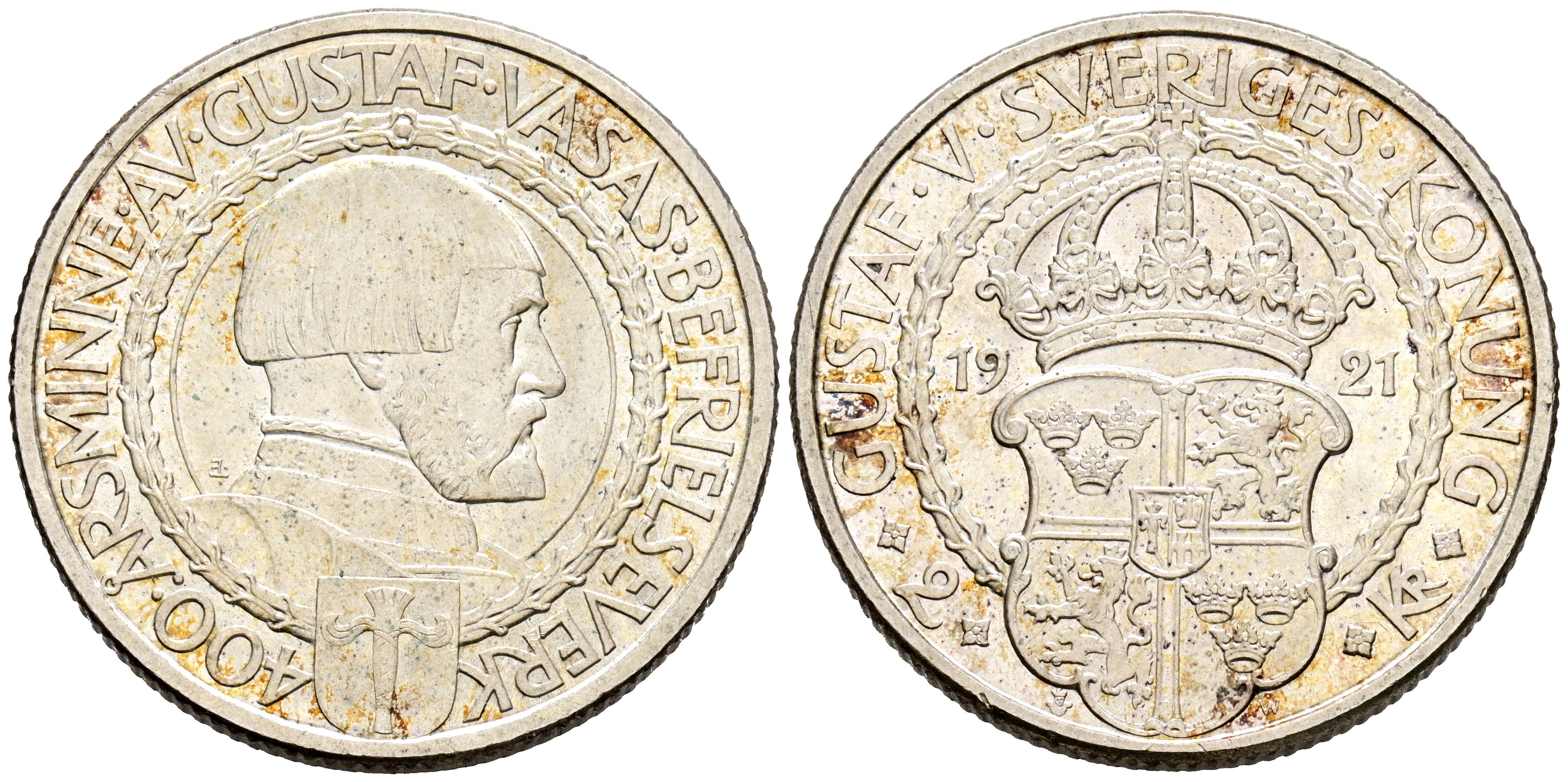 SUECIA. 2 Coronas. (Ar. 15,01g/31mm). 1921. 400º Aniversario de la Guerra de Liberación. (Km#799). EBC.