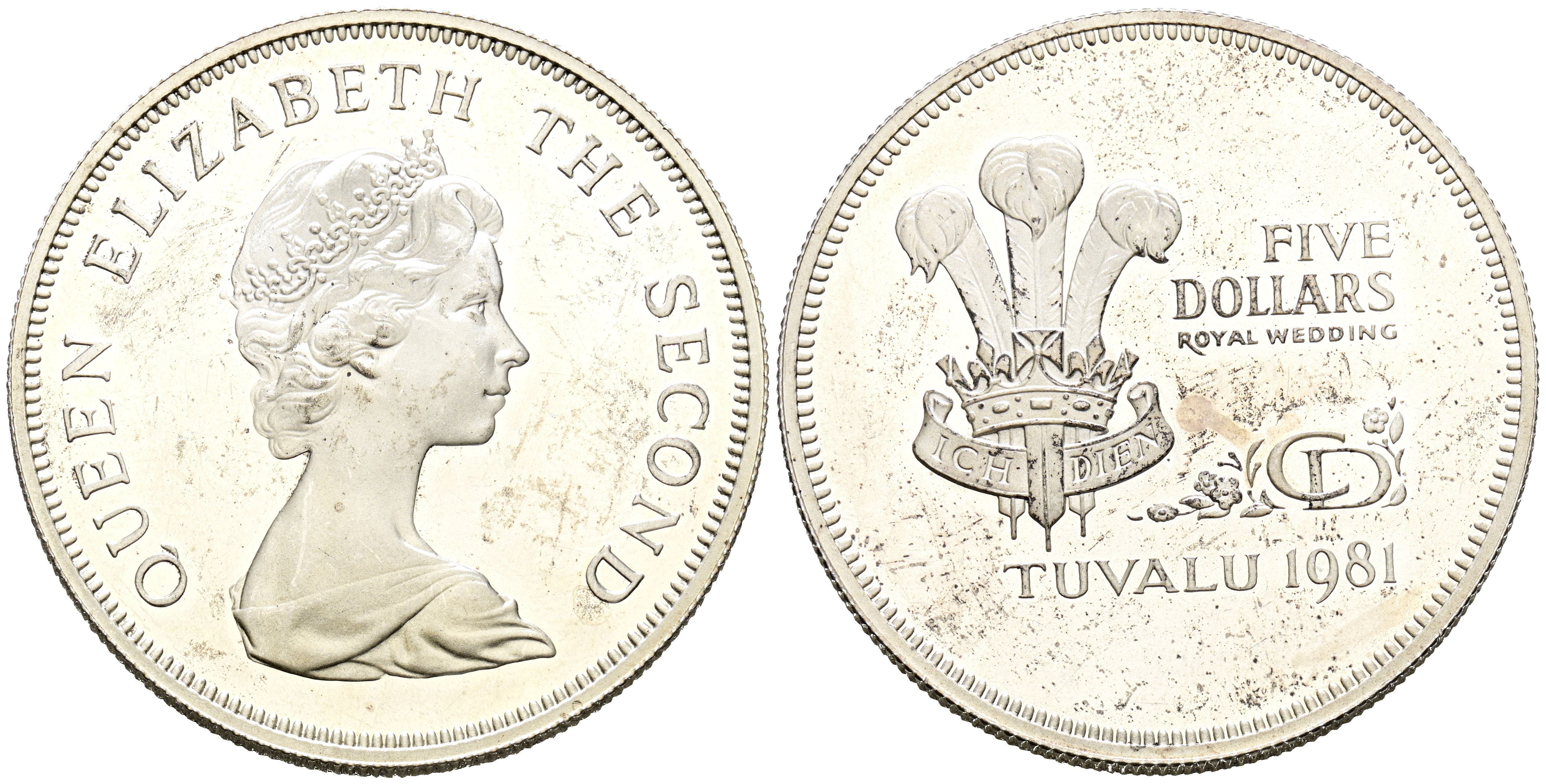 TUVALU. 5 Dollars. (Ar. 28,25g/39mm). 1981. Boda Real Príncipe Carlos y Diana de Gales. (Km#2). PROOF. Leves rayitas.