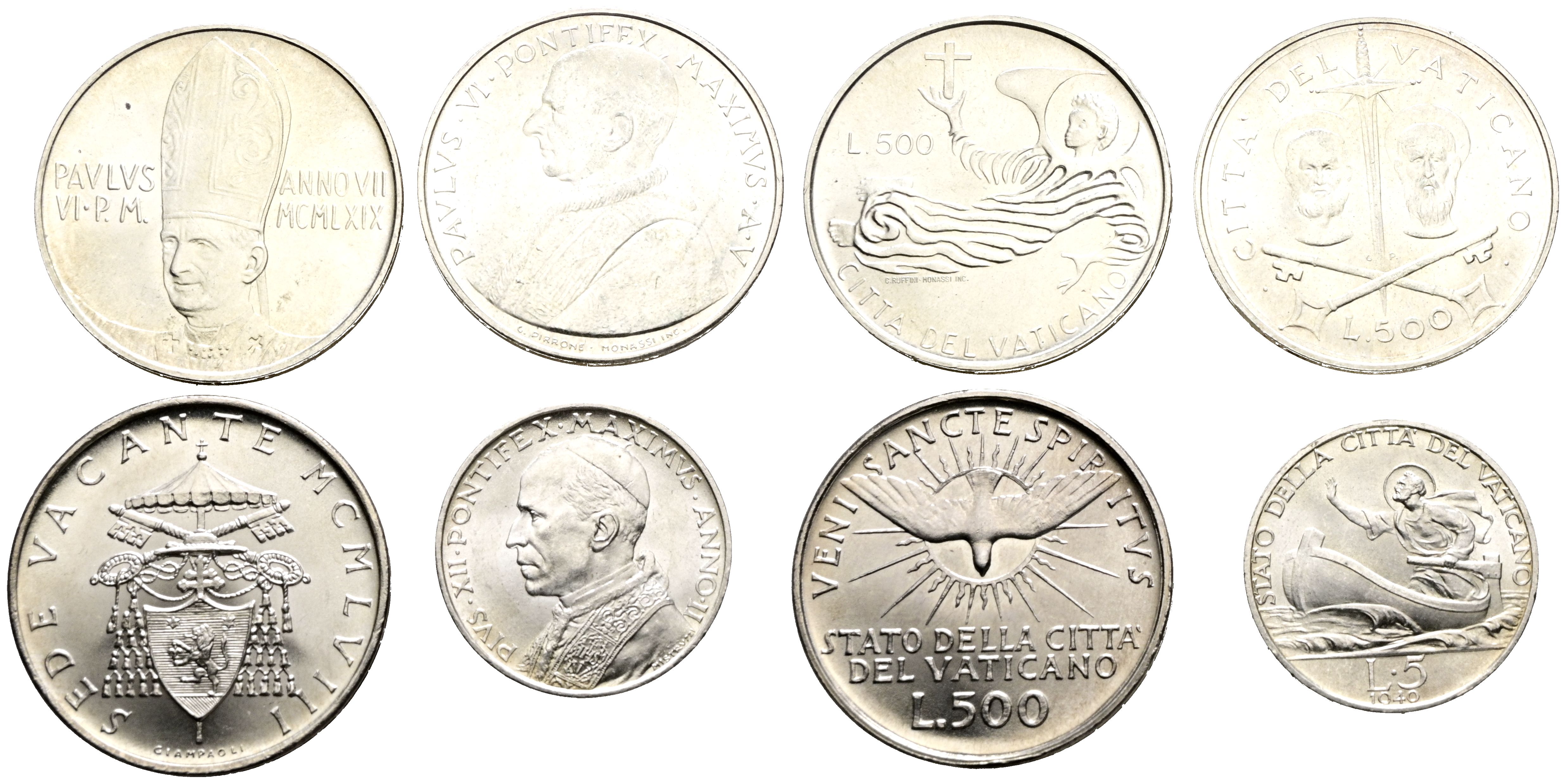 VATICANO. Magnífico conjunto de 4 monedas de plata de 5 (1) y 500 Liras (3) acuñadas entre 1940 y 1969. Extraordinarias calidades de todas las piezas. A EXAMINAR.