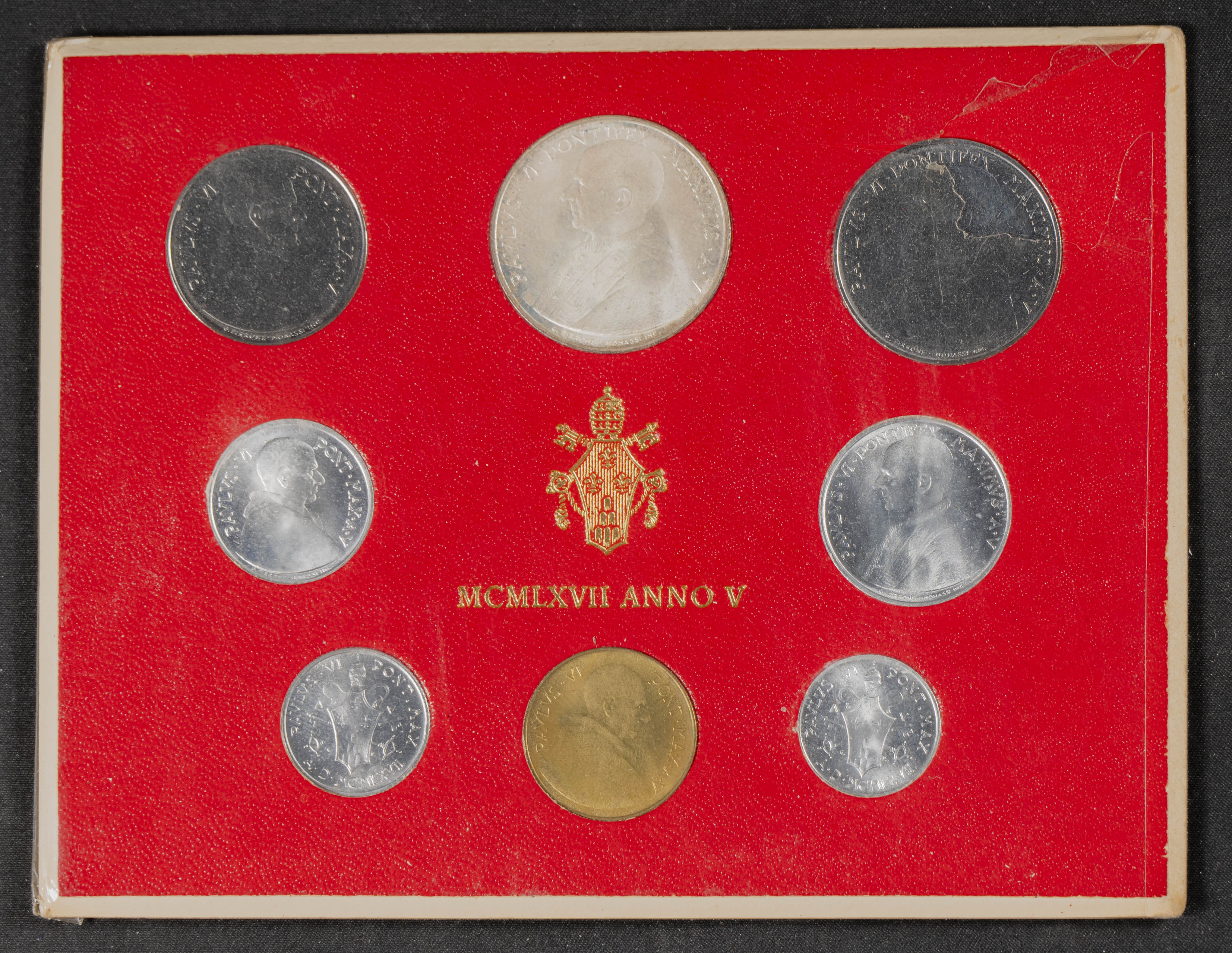 VATICANO, Pablo VI. Serie de 1, 2, 5, 10, 20, 50, 100 y 500 Liras. 1967 (Año V). (KMS70). 8 monedas en estuche oficial. SC.