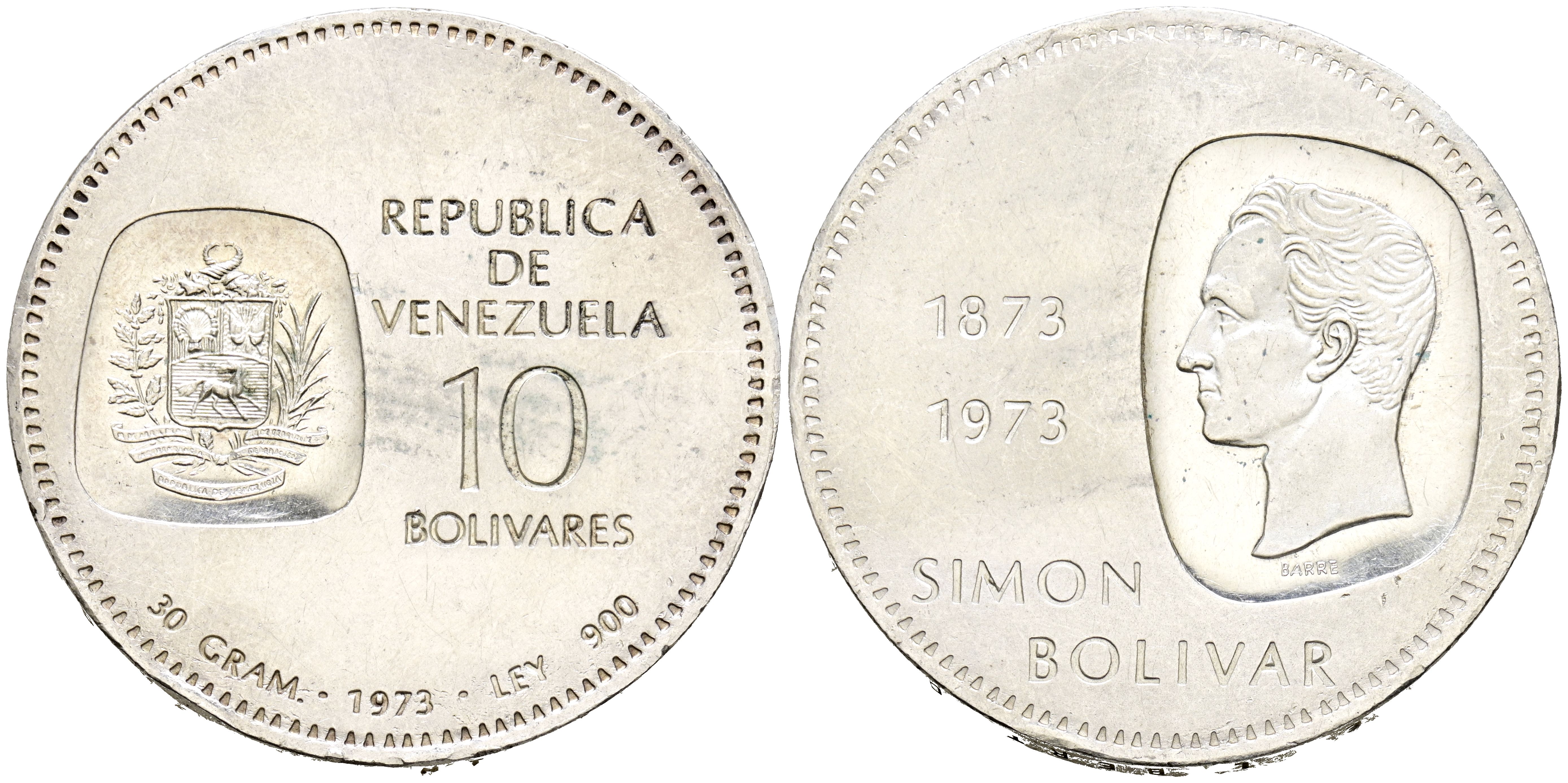 VENEZUELA. 10 Bolívares. (Ar. 30,41g/39mm). 1973. Centenario de la efigie de Simón Bolivar en la moneda (1873-1973). (Km#45). EBC. Leves rayitas.
