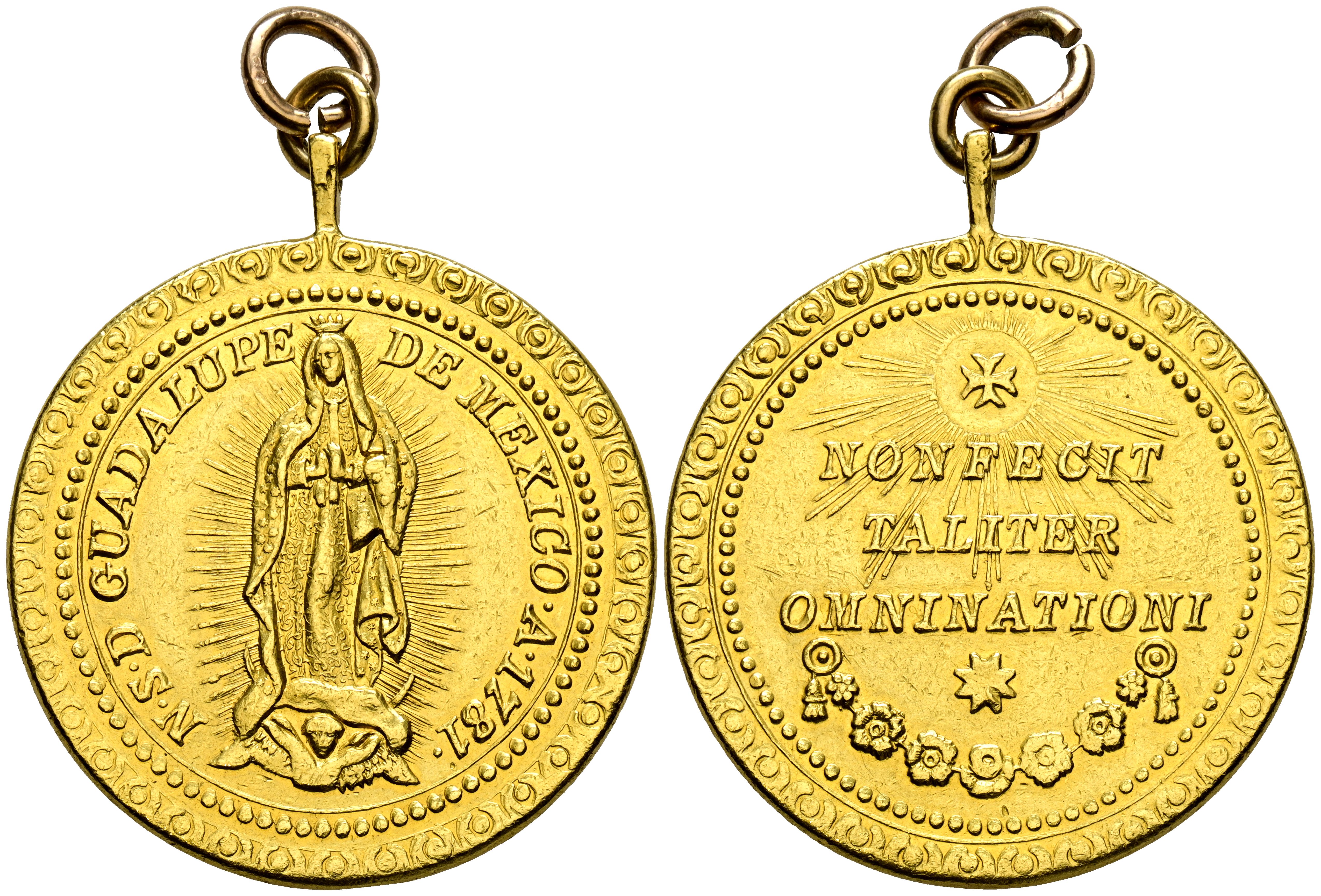 MÉXICO. Virgen de Guadalupe. (Au. 29,88g/36mm). En anverso figura la fecha de 1781 (no hemos encontrado un ejemplar tan antiguo como éste; a nuestro entender nos parece una pieza que podría encajar perfectamente con la época). Oro de 0,900 milésimas. Con argolla de época. MBC+. Escasa. A EXAMINAR.