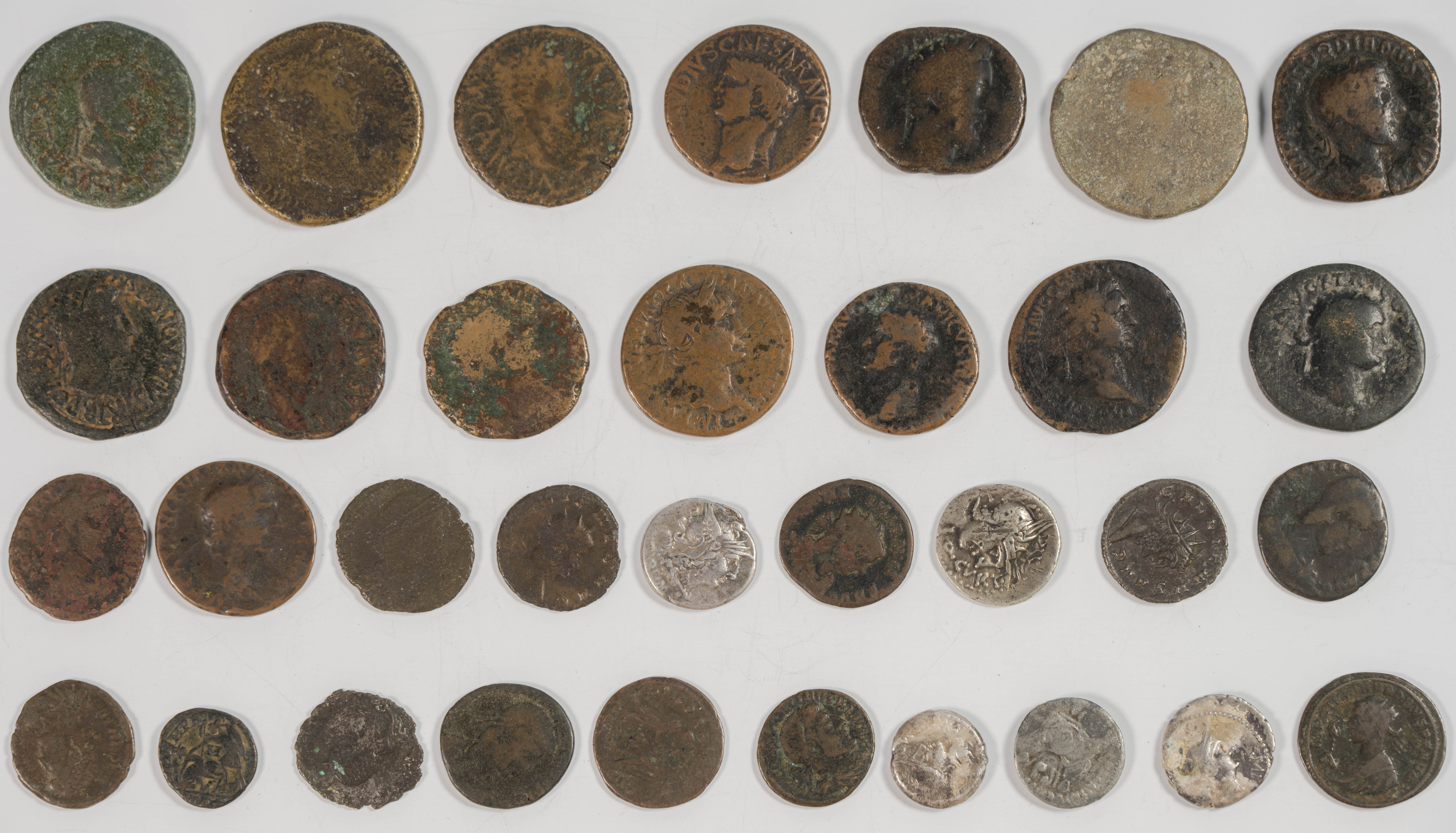 REPUBLICA E IMPERO ROMANO. Interesante conjunto formado por 33 monedas que abarcan desde la república hasta el bajo imperio. A destacar, la amplísimas variedad de emperadores, los cinco denarios y una considerable cantidad de Ases. Diferentes módulos, medidas y calidades. A EXAMINAR.