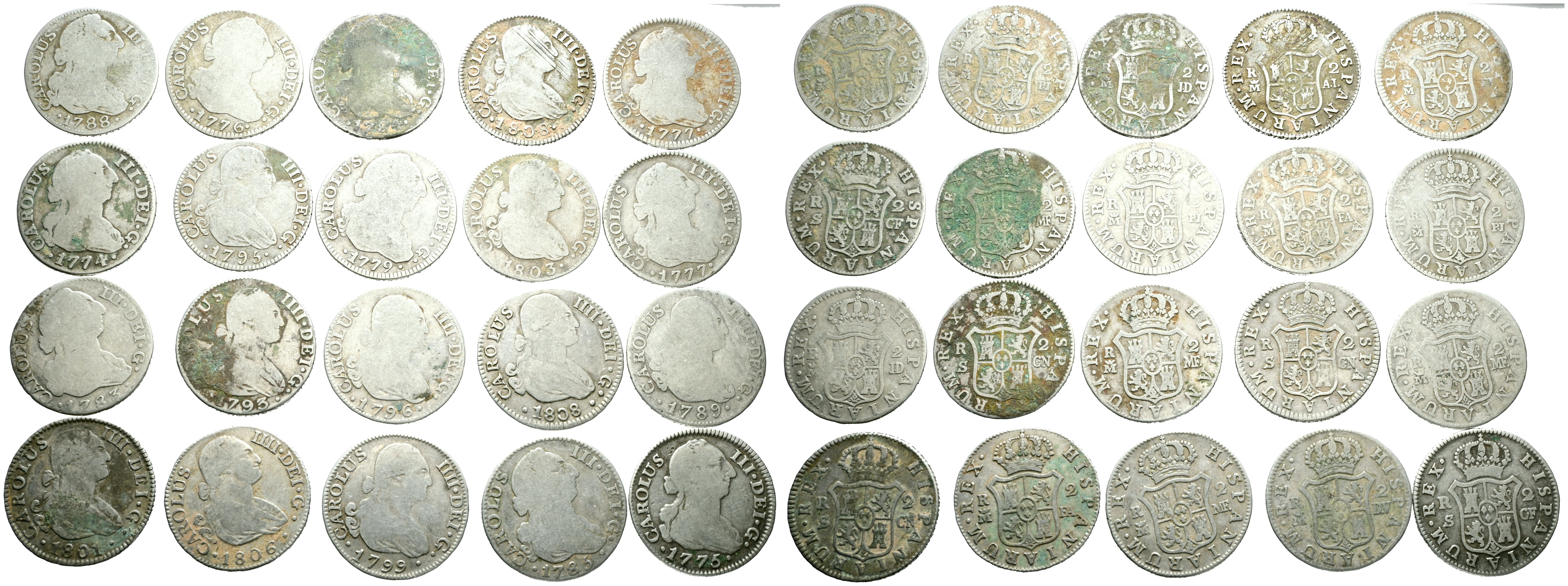 MONARQUÍA ESPAÑOLA. Conjunto de 20 monedas de 2 Reales acuñados por Carlos III y Carlos IV en las cecas de Madrid y Sevilla. Ninguna pieza repetida. Gran variedad de fechas. Diferentes estados de conservación. A EXAMINAR.