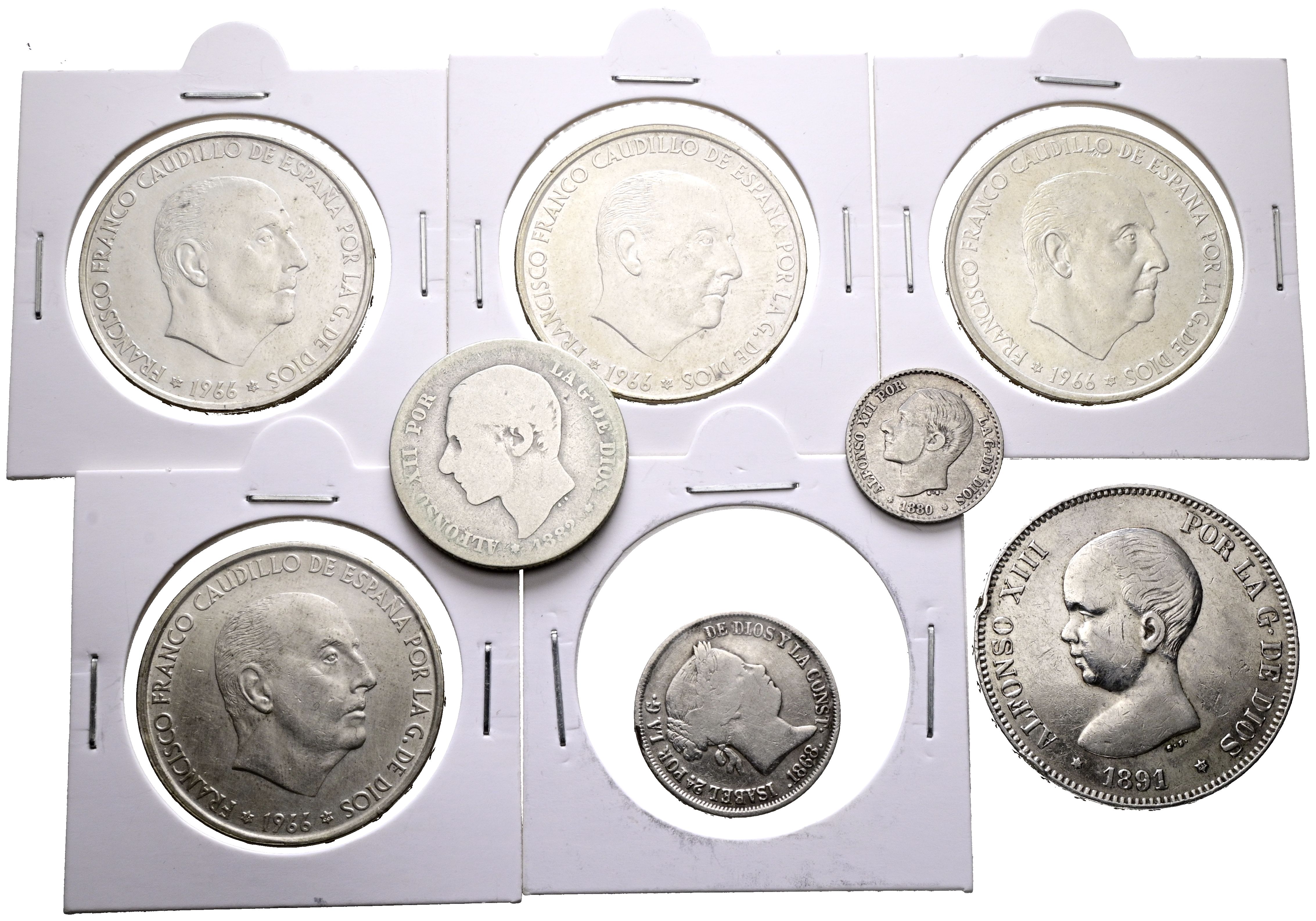 ESPAÑA. Conjunto de 8 piezas en plata de los periodos de la Monarquía Española (1), Centenario de la Peseta (2) y Estado Español (4). 5 de las monedas tipo Duro. Diferentes estados de conservación. A EXAMINAR.