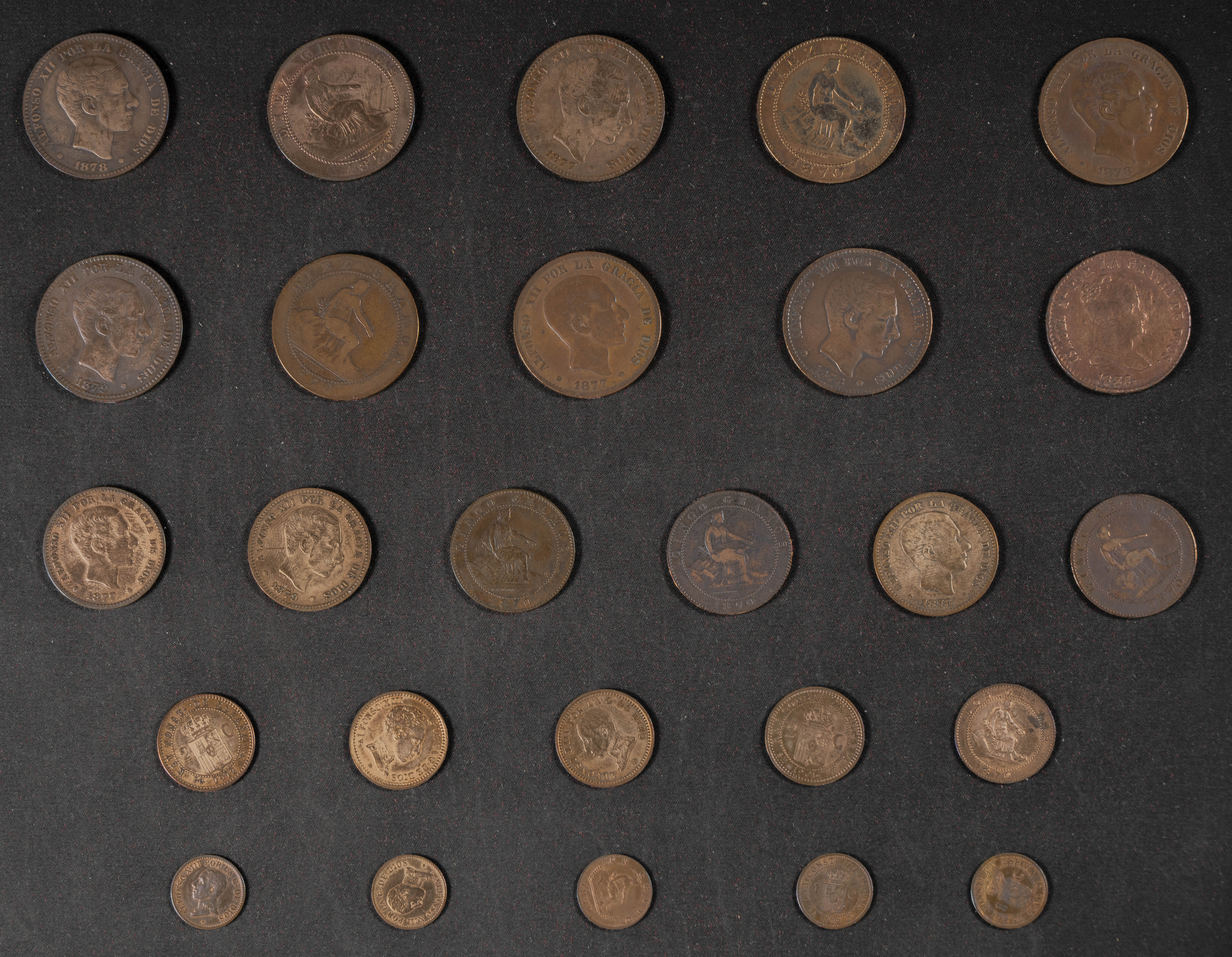 CENTENARIO DE LA PESETA. Interesante conjunto de 26 cobres acuñados en diferentes módulos durante el Gobierno Provisional y reinados de Alfonso XII y Alfonso XIII. Sin apenas piezas repetidas. Diferentes estados de conservación. A EXAMINAR.