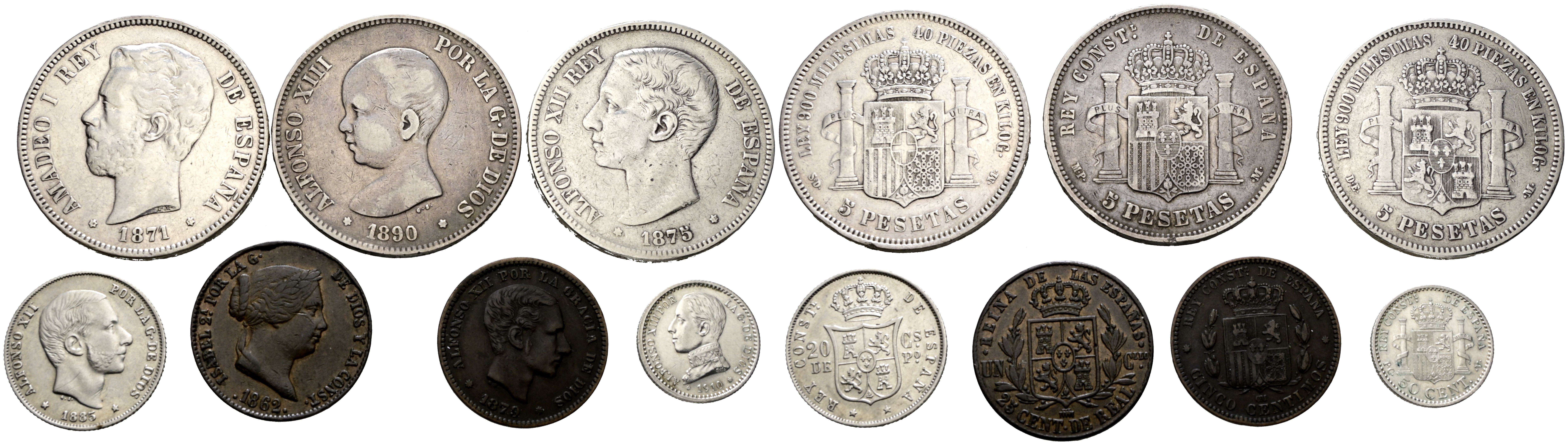 CENTENARIO DE LA PESETA. Interesante conjunto de 7 piezas (5 de ellas en plata) de diferentes módulos, incluido el de 5 Pesetas, con variedad e fechas y estados de conservación. Incluye un bonito cobre de Isabel II. A EXAMINAR.