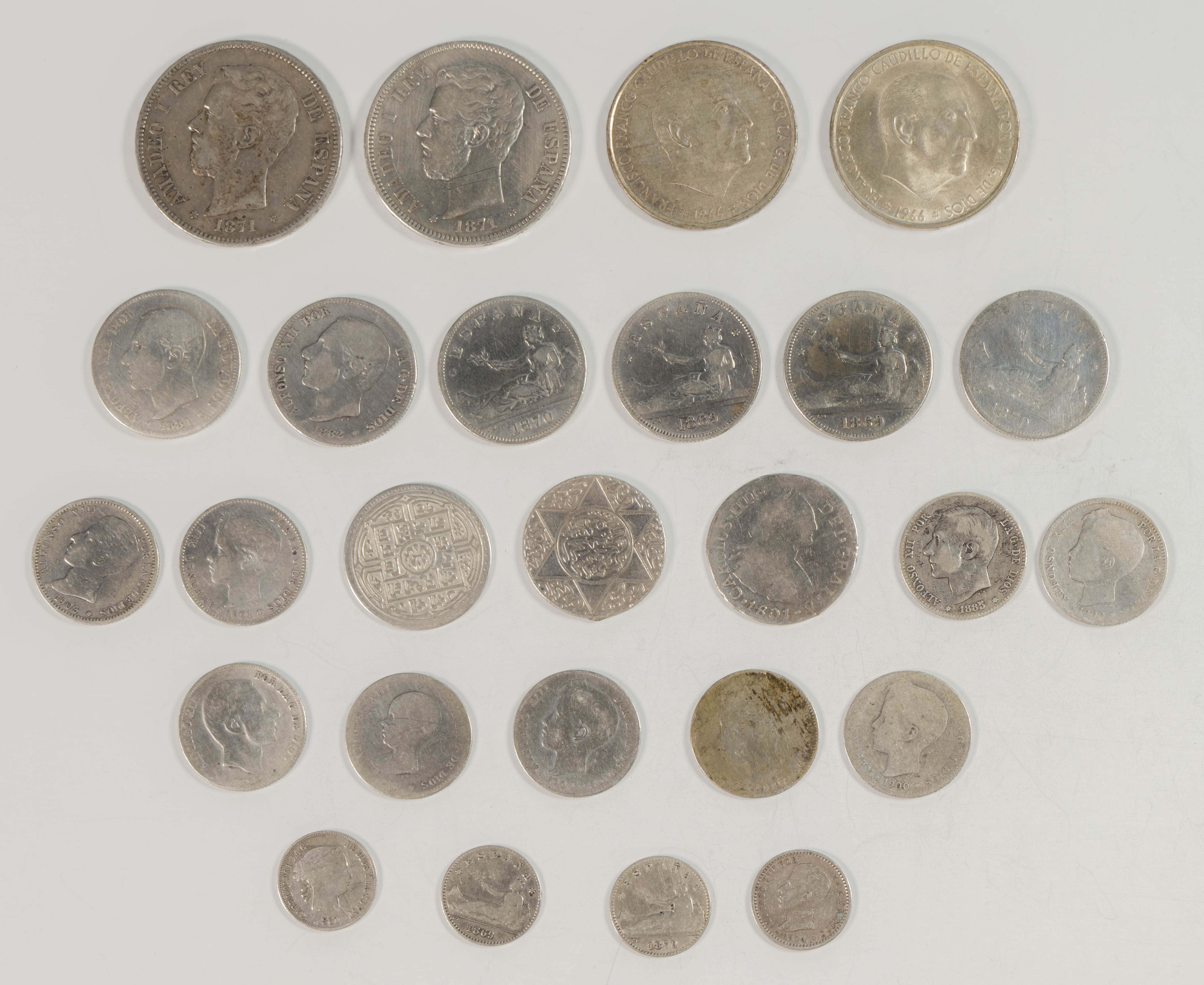 ESPAÑA. Interesante conjunto formado por 26 monedas de plata fundamentalmente acuñadas durante el periodo del Centenario de la Peseta. Incluye ejemplares, también, del periodo de la Monarquía Española y Estado Español. El conjunto se completa con dos piezas de origen árabe. Gran diversidad de módulos (incluyendo tipo duro), fechas así como estados de conservación. A EXAMINAR.