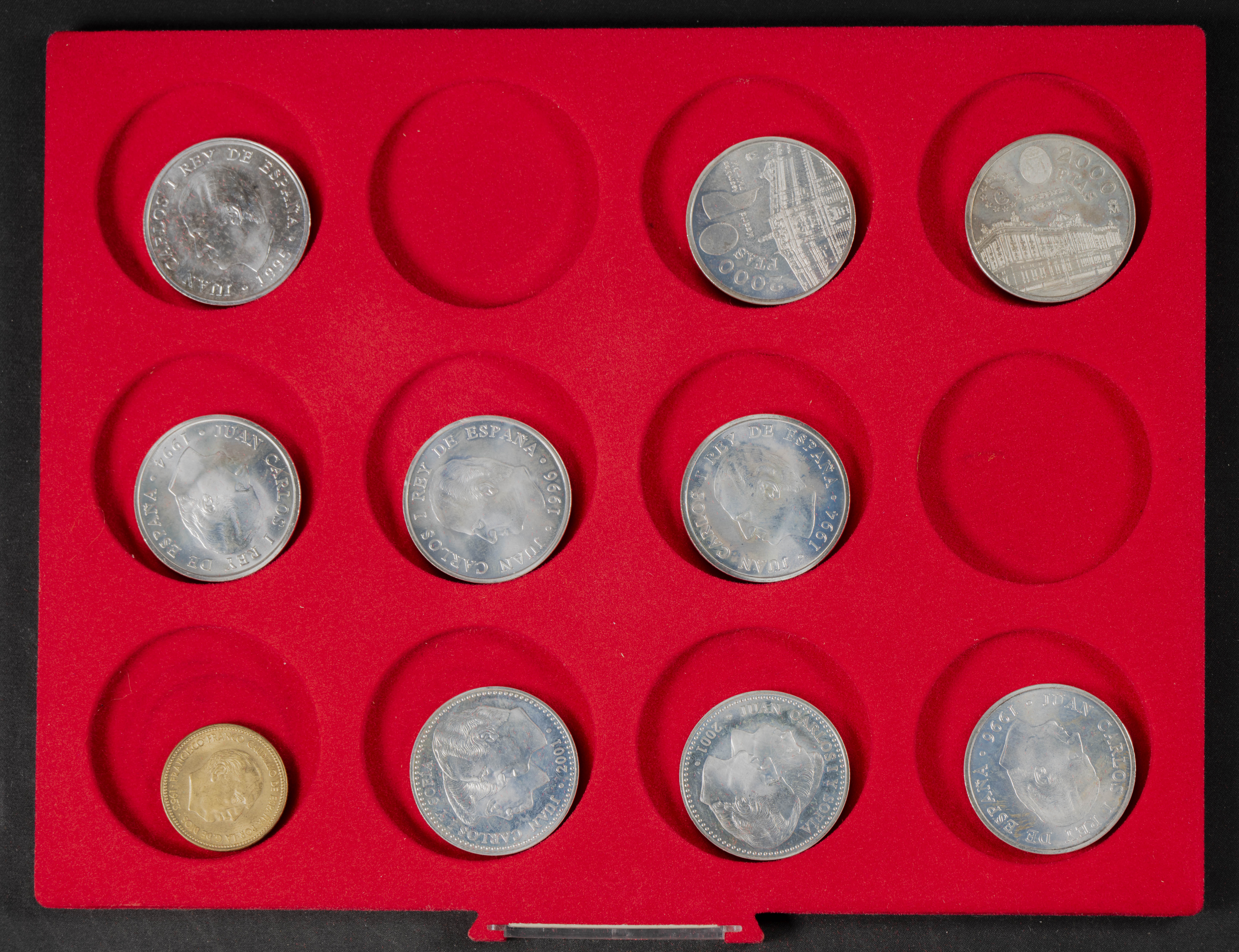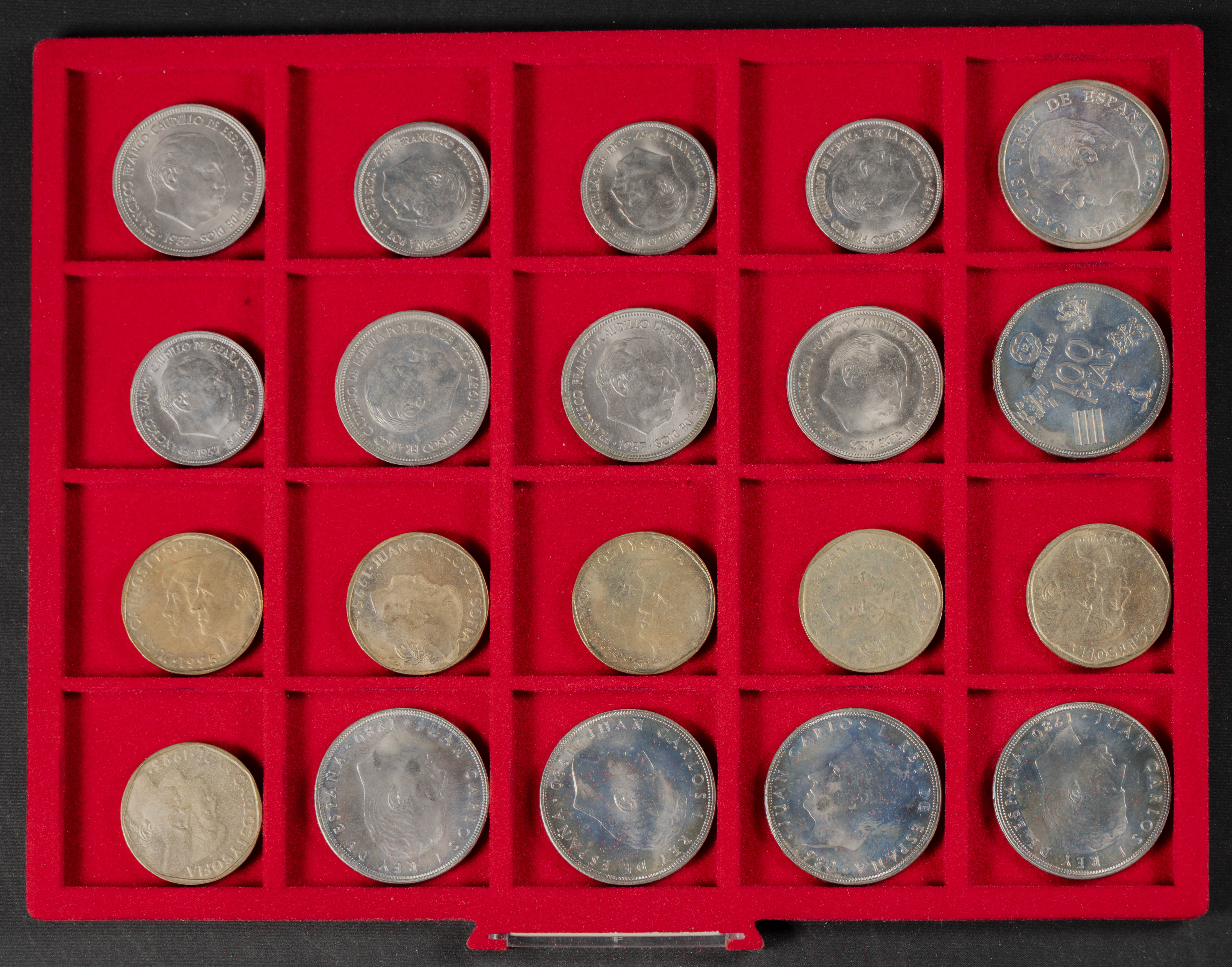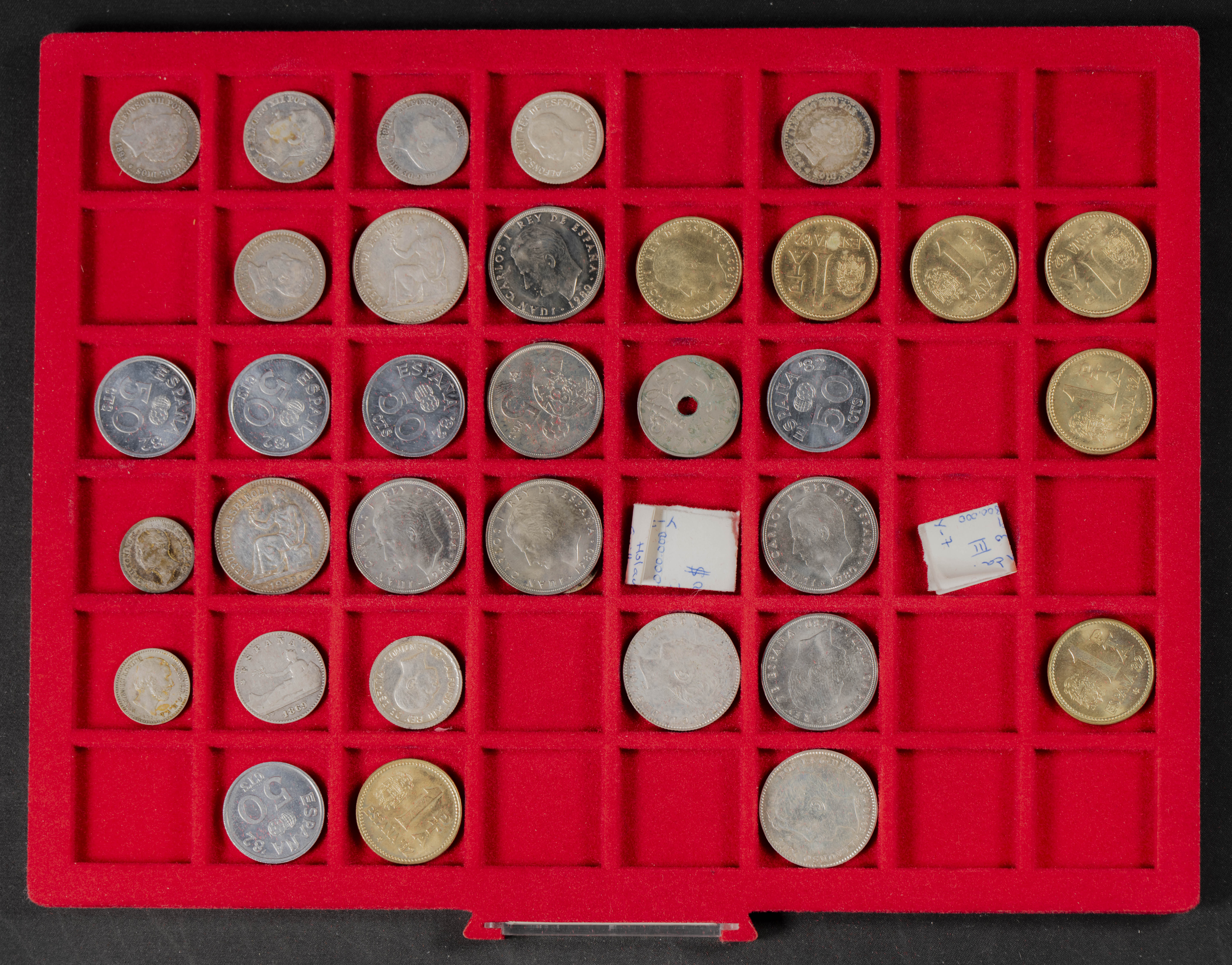 ESPAÑA. Interesante conjunto, expuesto en dos monetarios, compuesto por decenas de piezas acuñadas entre los periodos del Centenario de la Peseta y el Reinado de Juan Carlos I. El conjunto incluye un buen número de piezas en plata así como varias carteras. Diferentes estados de conservación. IMPRESCINDIBLE EXAMINAR.
