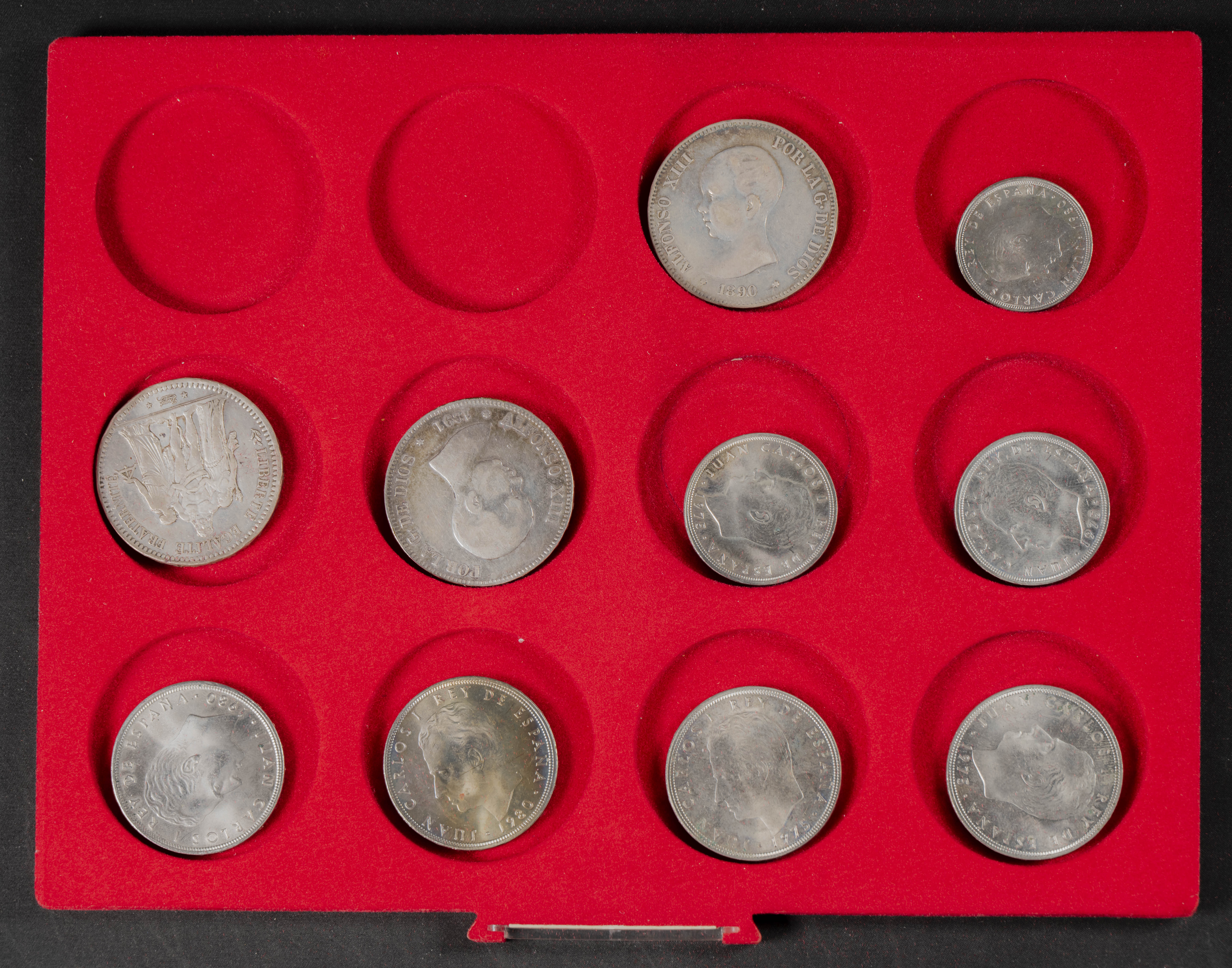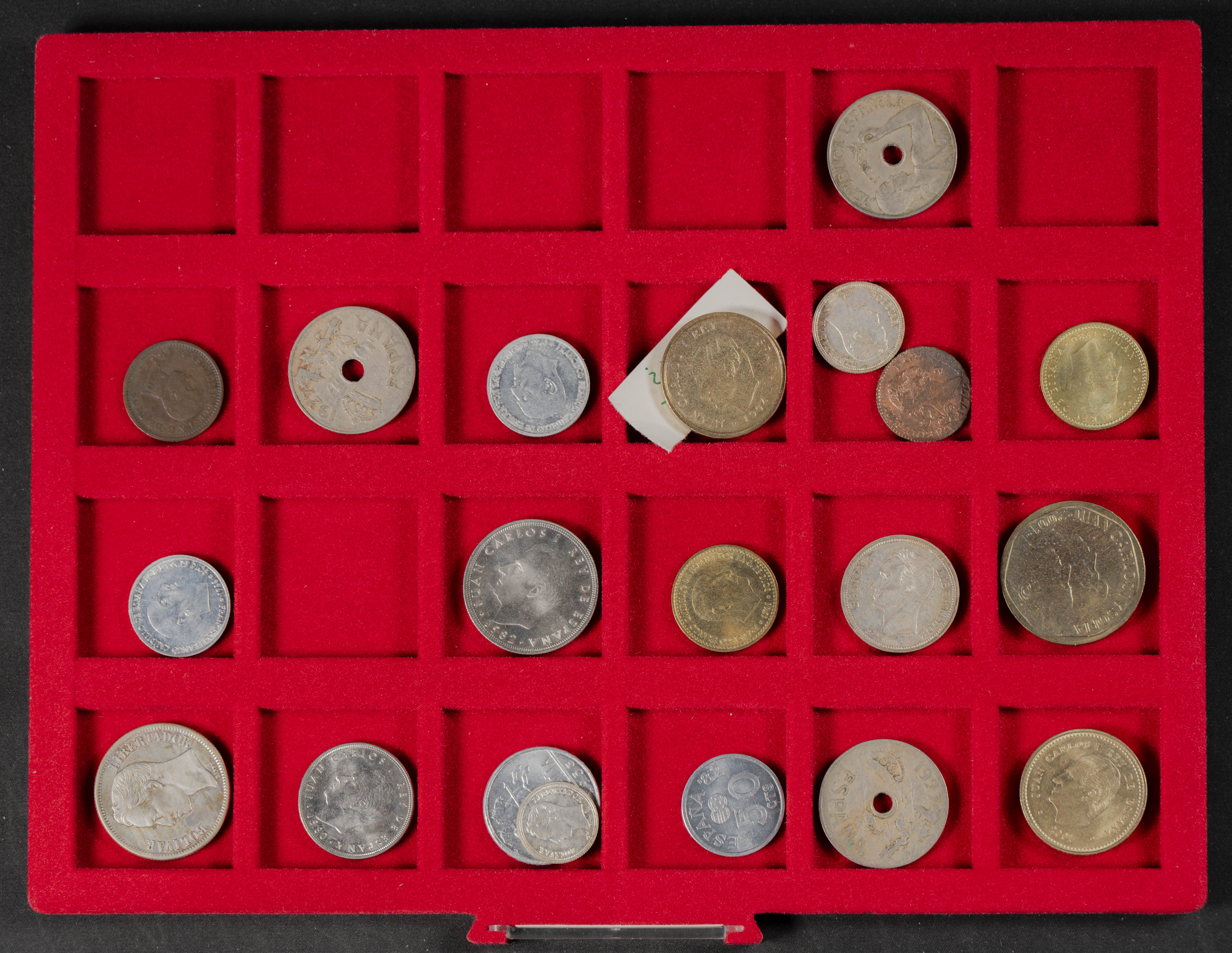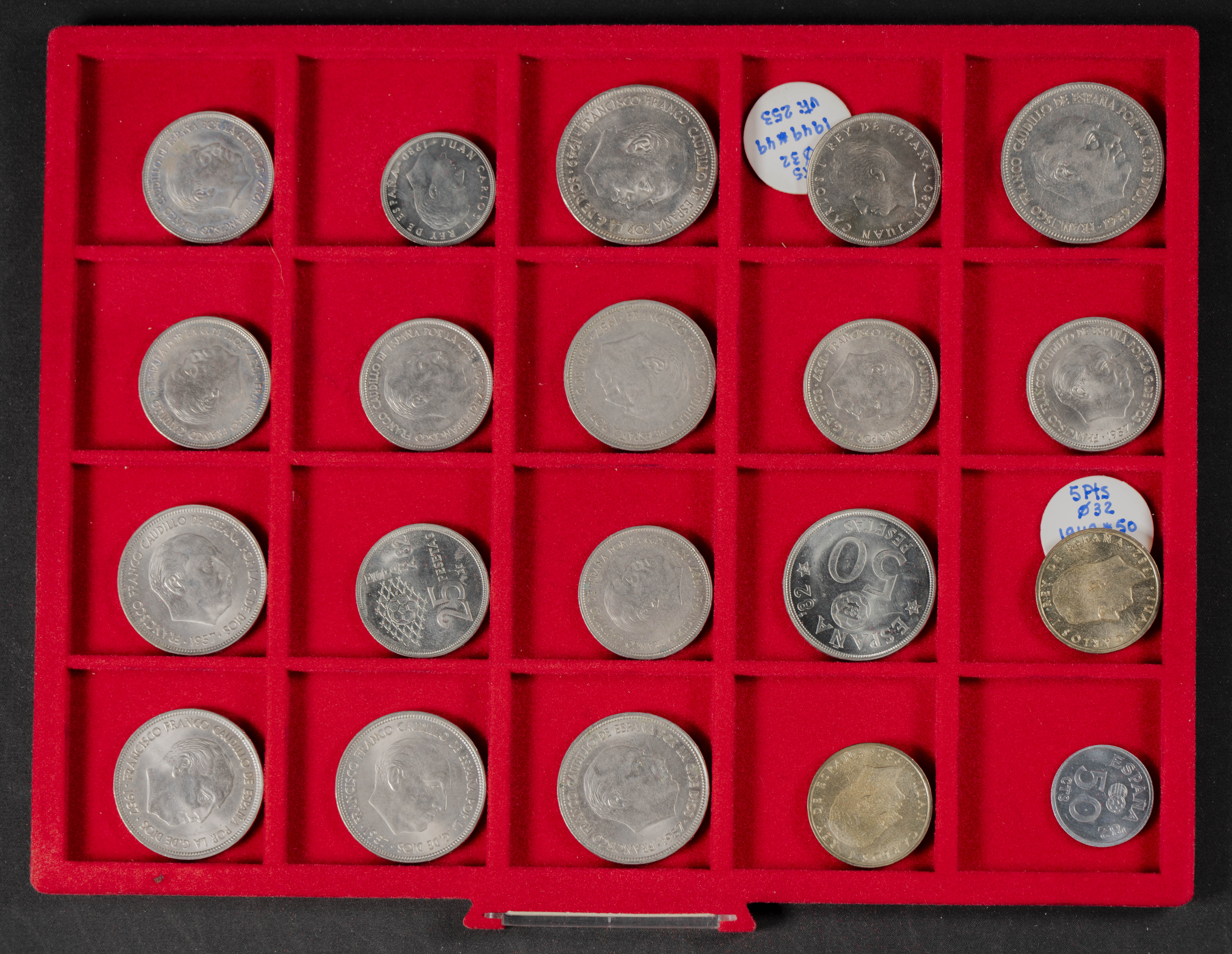 ESPAÑA. Interesante conjunto, expuesto en dos monetarios, compuesto por decenas de piezas acuñadas entre los periodos del Centenario de la Peseta y el Reinado de Juan Carlos I. El conjunto incluye un buen número de piezas en plata así como varias carteras. Diferentes estados de conservación. IMPRESCINDIBLE EXAMINAR.