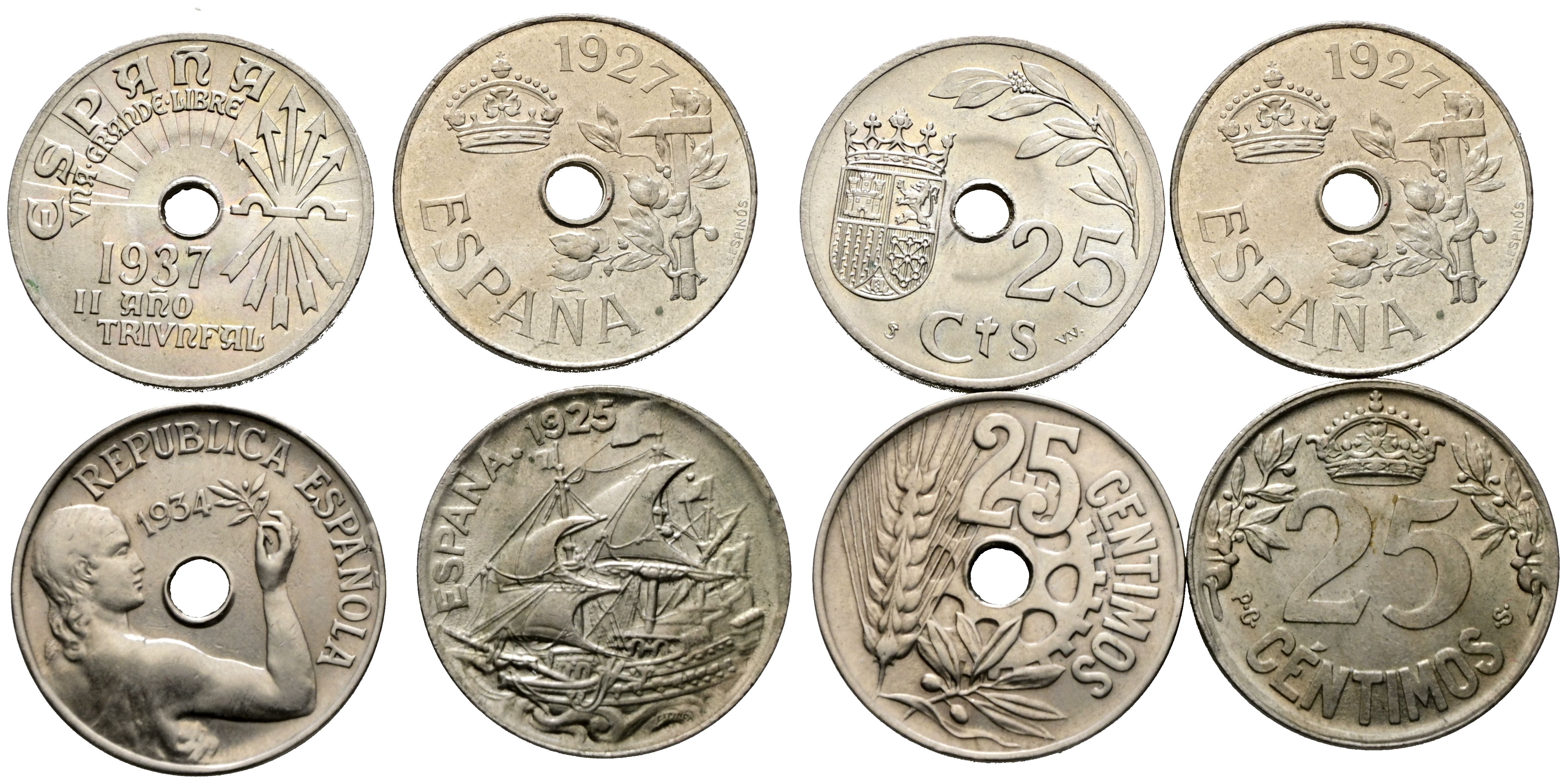 ESPAÑA. Precioso conjunto de 4 piezas de 25 Céntimos acuñados entre 1925 y 1937. Todas diferentes. Alto grado de conservación general, entre EBC y SC.