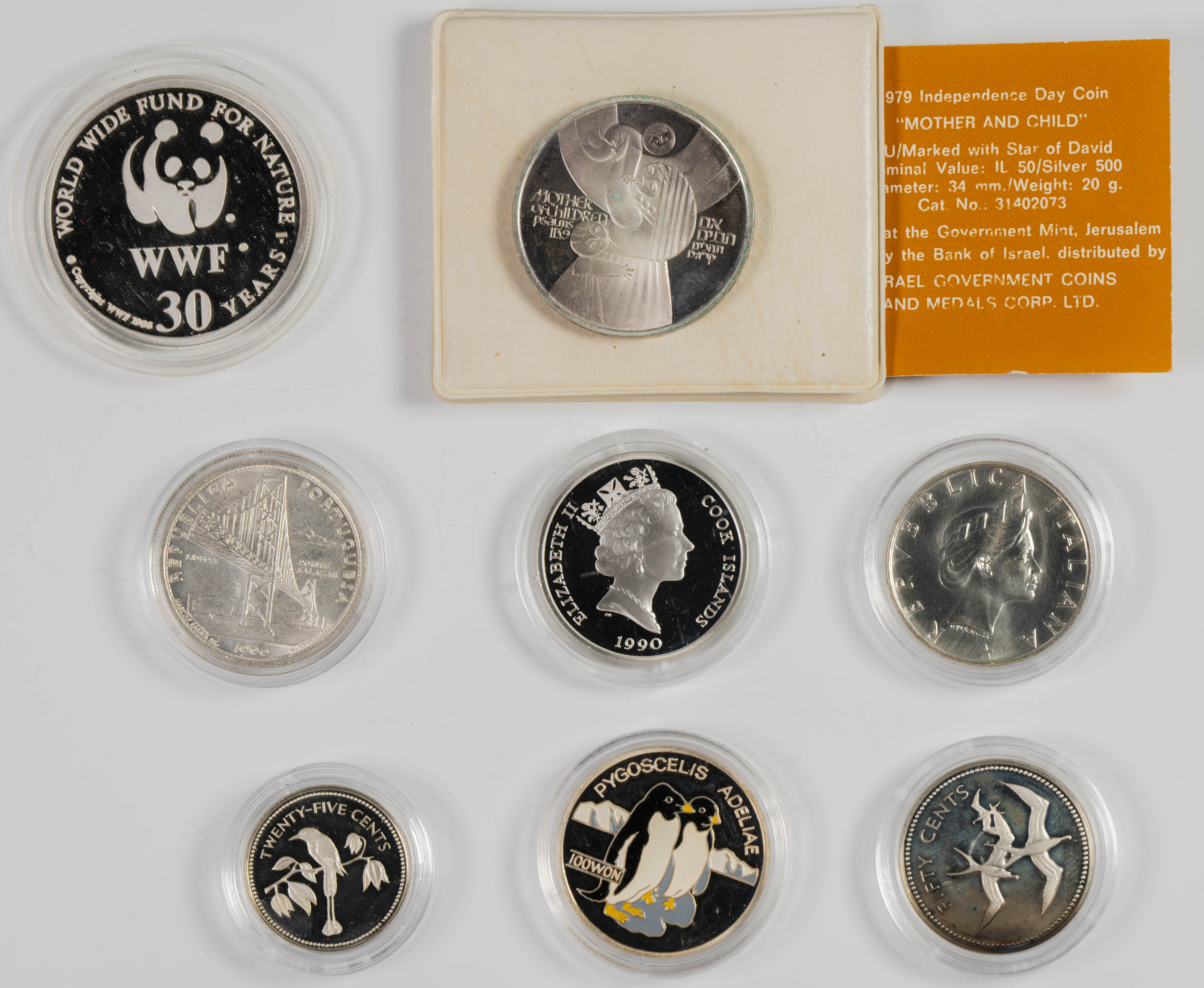 MONEDAS EXTRANJERAS. Interesante conjunto de 8 piezas en plata: 7 monedas y 1 medalla conmemorativa en acabados PROOF y BU, además de una coloreada acuñadas en Portugal, Italia, Israel, Corea del Norte, Islas Cook y Belice. Diferentes módulos. Excelentes estados de conservación de todas las piezas. A EXAMINAR.