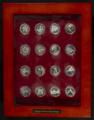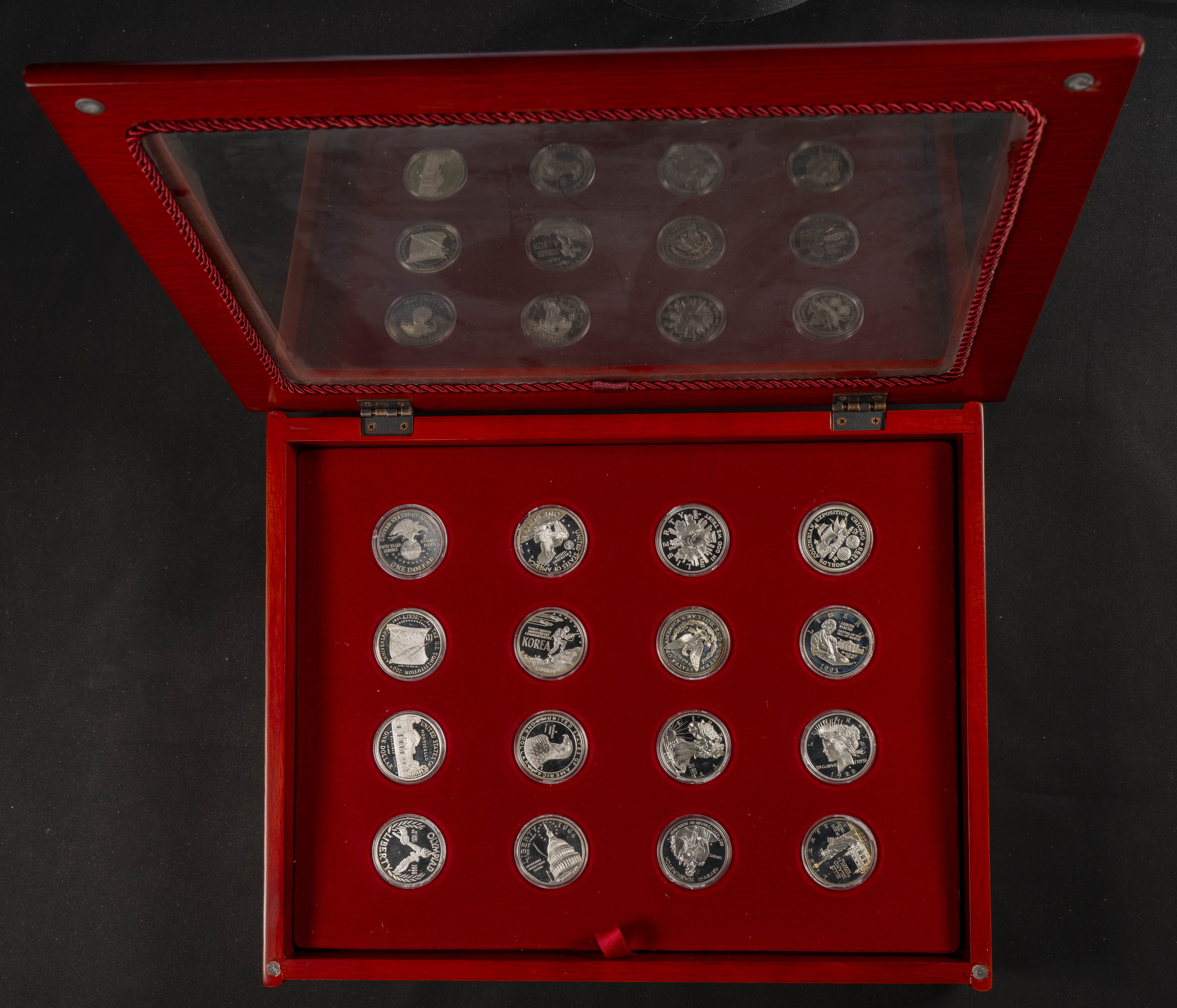 ESTADOS UNIDOS. Estuche original en madera compuesto por 16 monedas en plata de la colección "Historia del Dólar de plata americano". Peso medio por moneda 13,50g. PROOF. Incluye cápsulas.