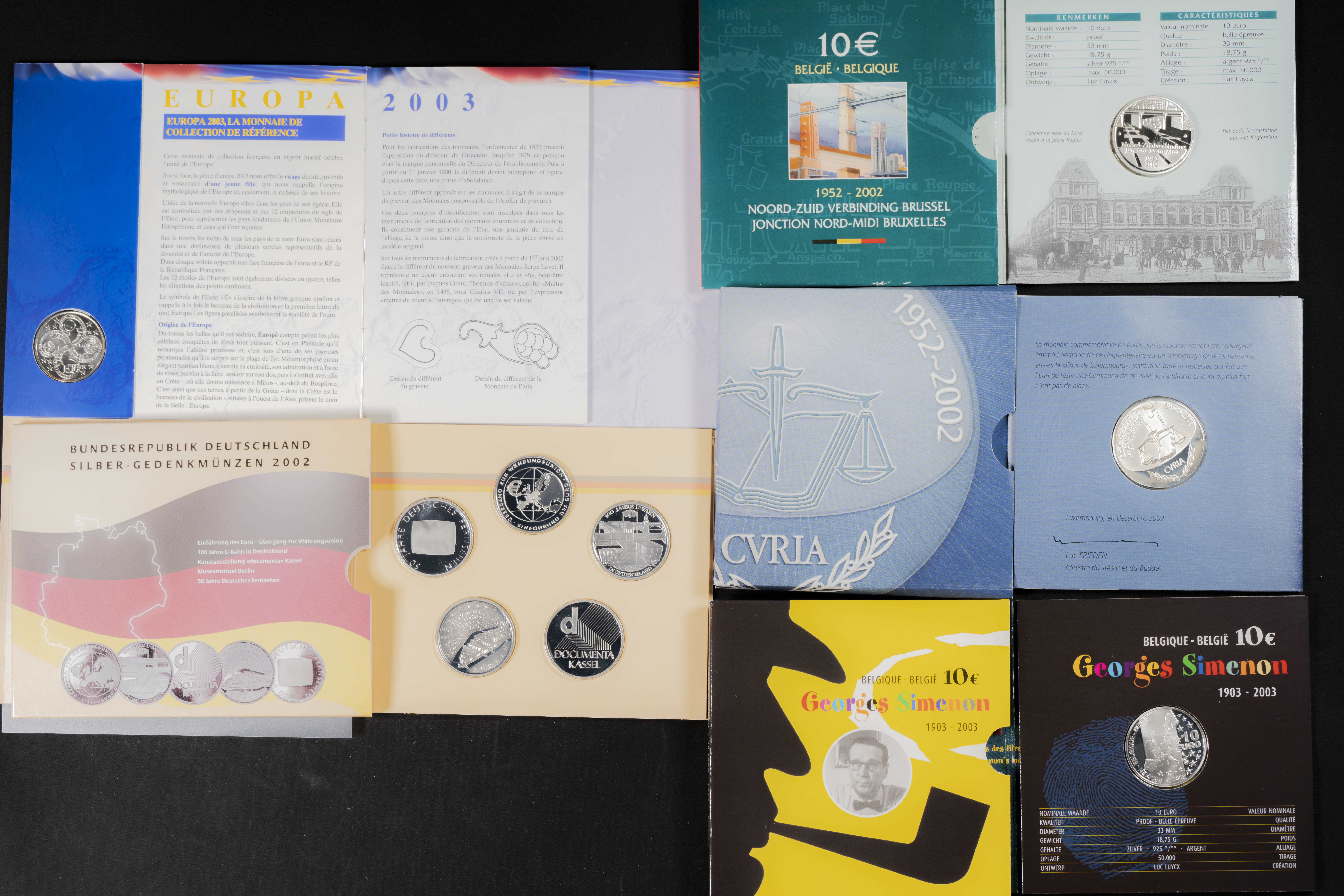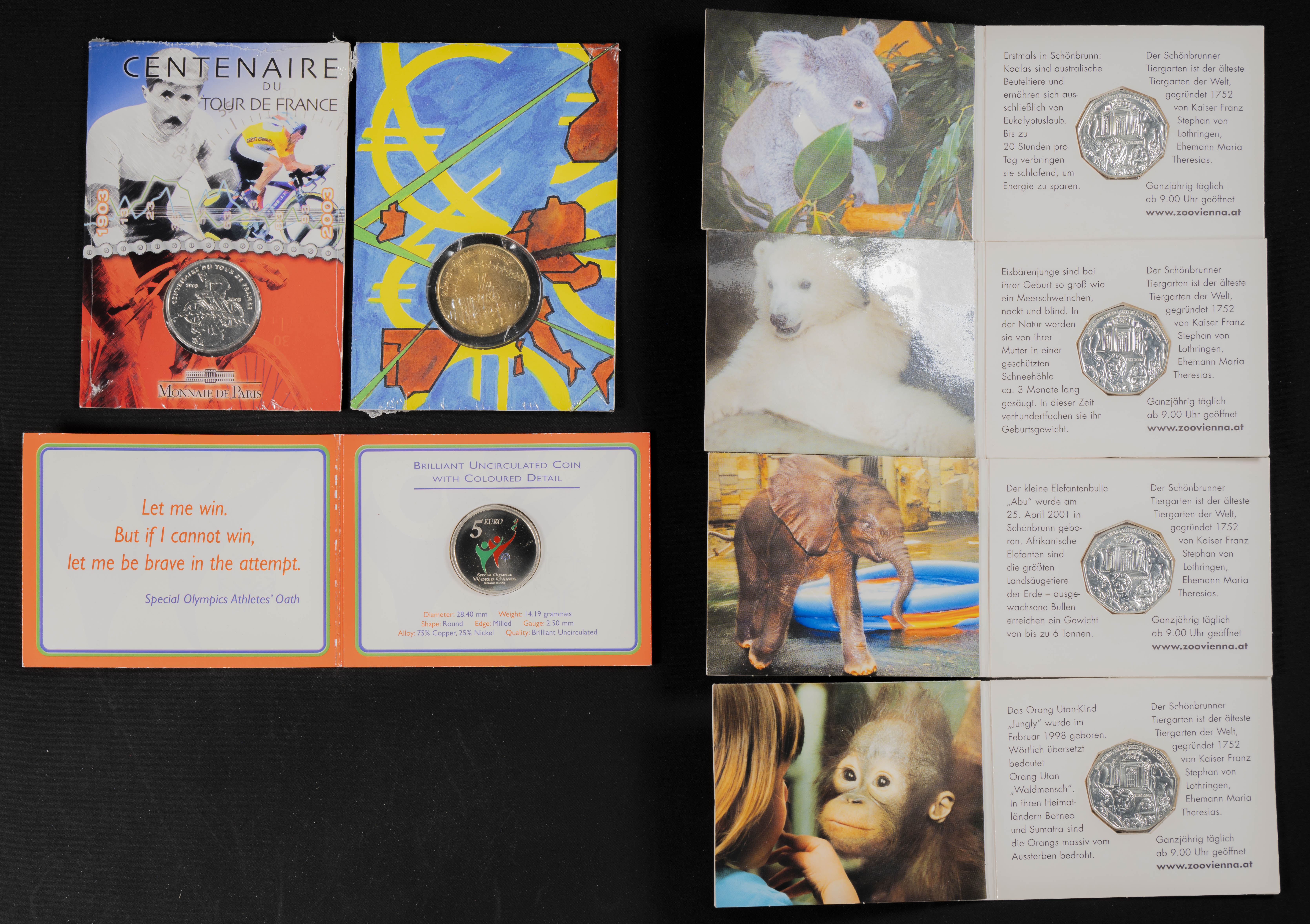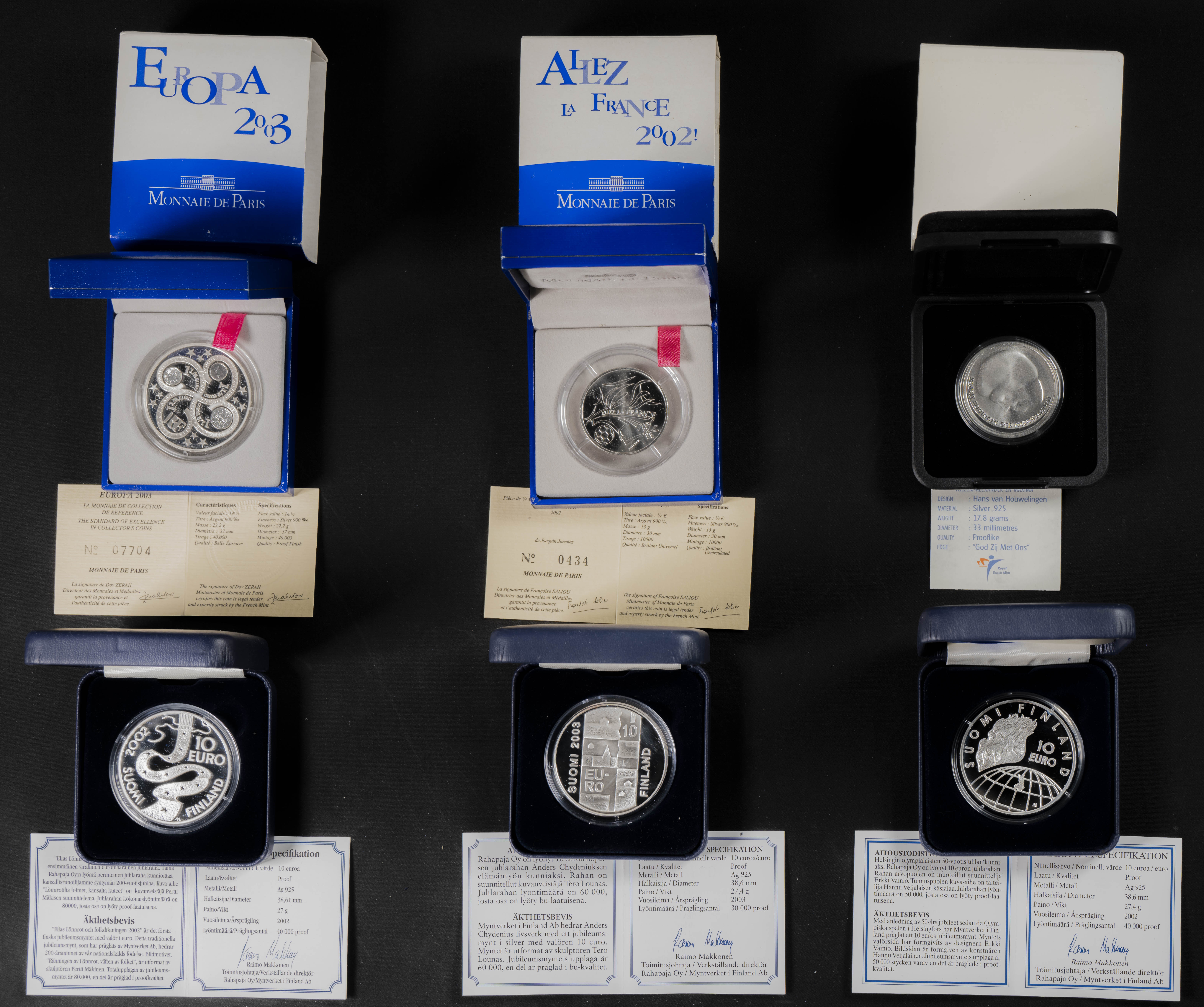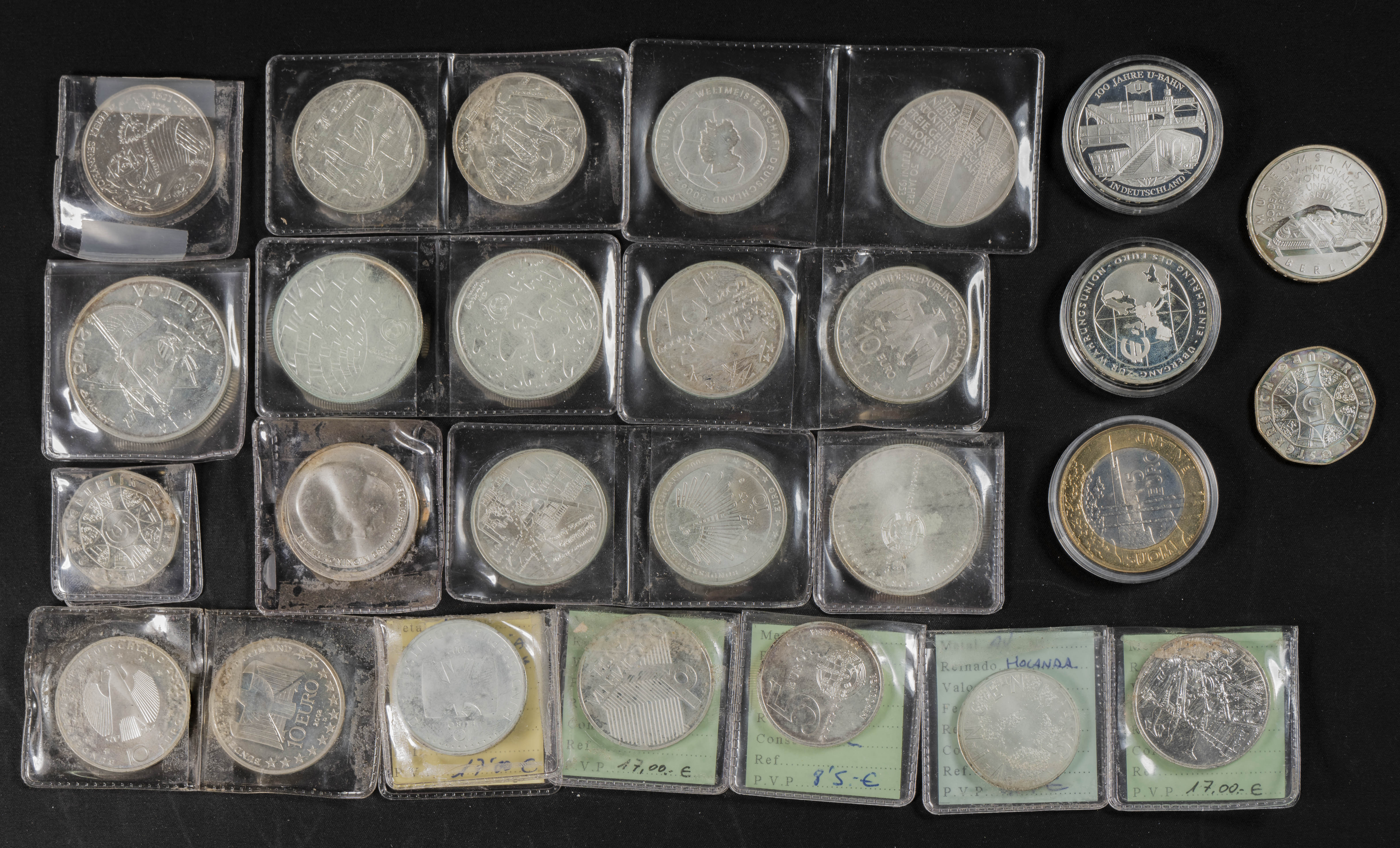 MONEDAS EXTRANJERAS. Interesante conjunto de aproximadamente 45 monedas conmemorativas, muchas de ellas en plata, con diferentes valores de Euros y variadas temáticas. Incluye un buen número de estuches, sets y cápsulas. Magnífica conservación general. A EXAMINAR.