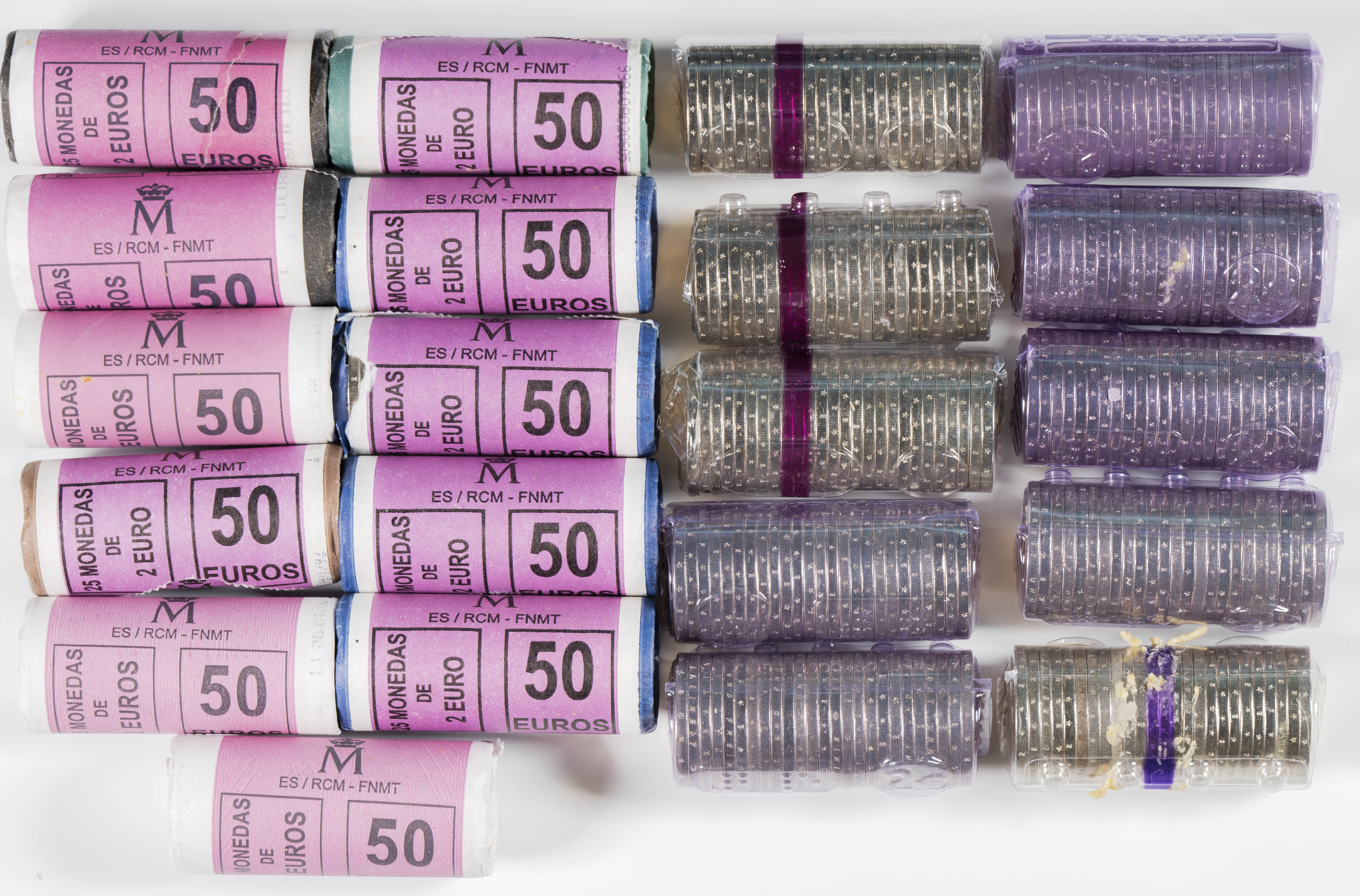 EUROS. Conjunto de 21 cartuchos de monedas de 2 Euros, de los países: Alemania (1), España (17), Francia (2) e Irlanda (1). Diferentes fechas y motivos de acuñación. A EXAMINAR.