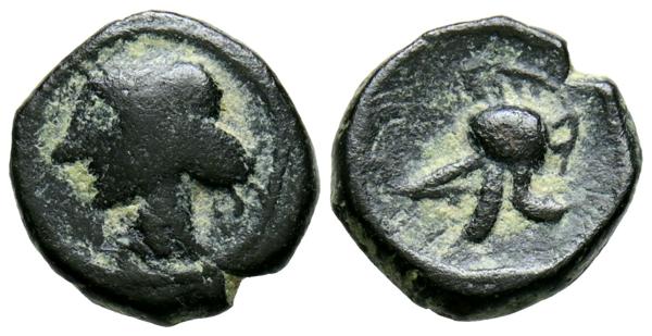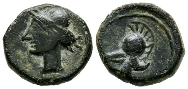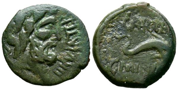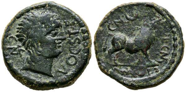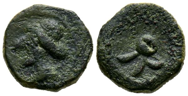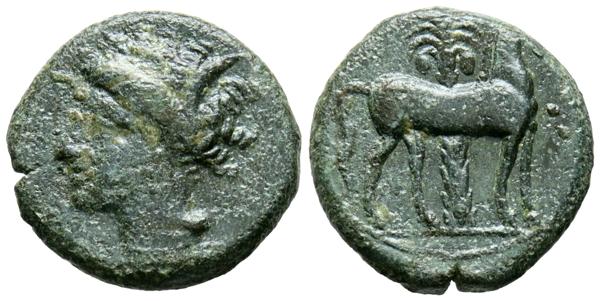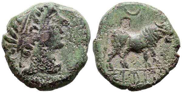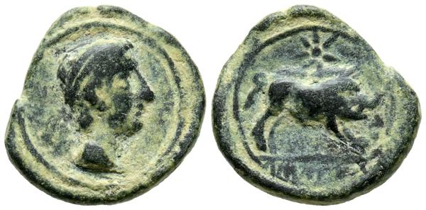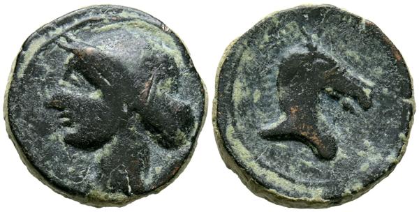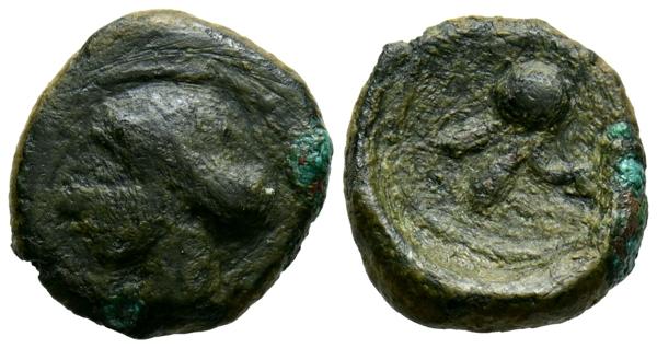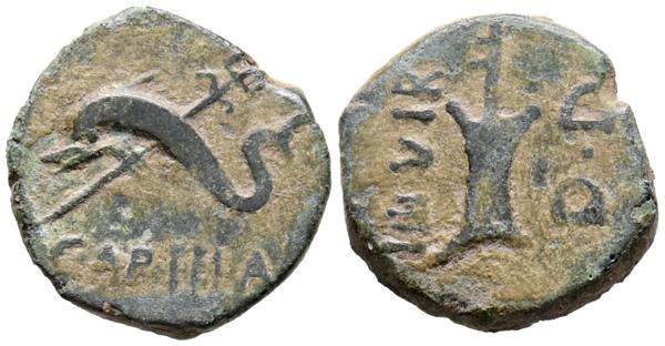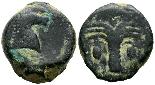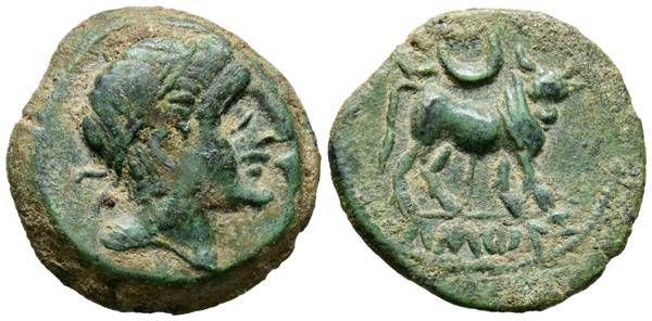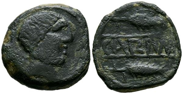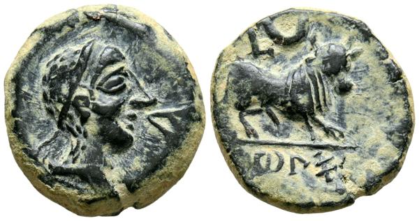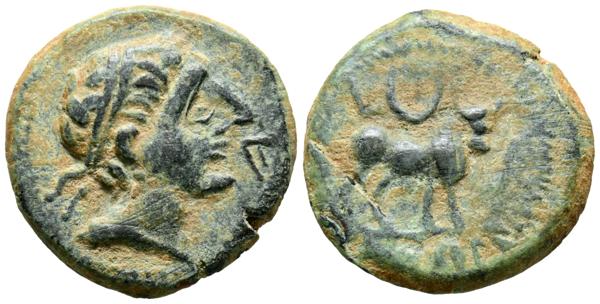 CASTULO (Cazlona, Jaén). Semis. (Ae. 9,13g/23mm). 180 a.C. (FAB-728). Anv: Cabeza masculina diademada a derecha, alrededor leyenda: CN VOC STFR. Rev: Toro a derecha, encima: CN y creciente, delante: CN FVL CN F, en exergo leyenda ibérica: CaSTeLe. MBC-.