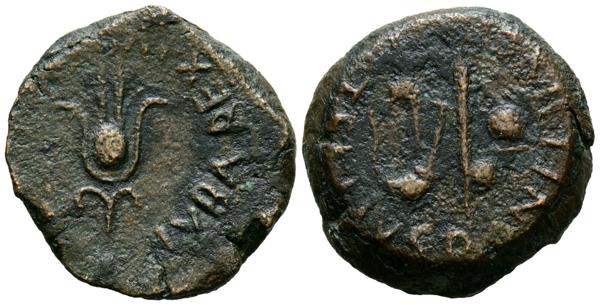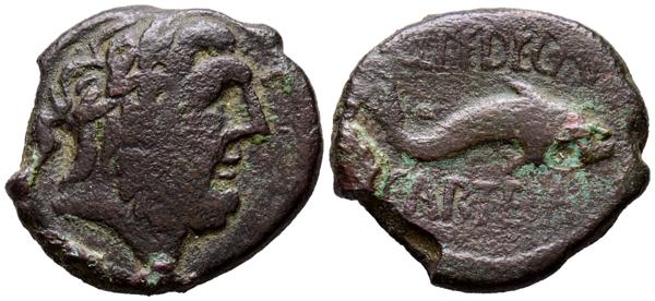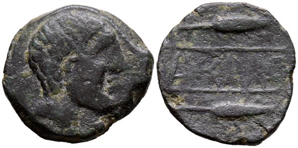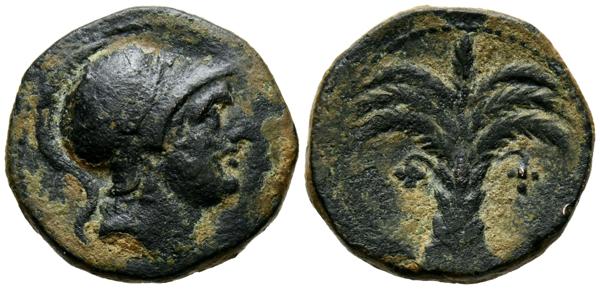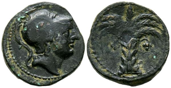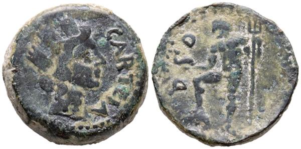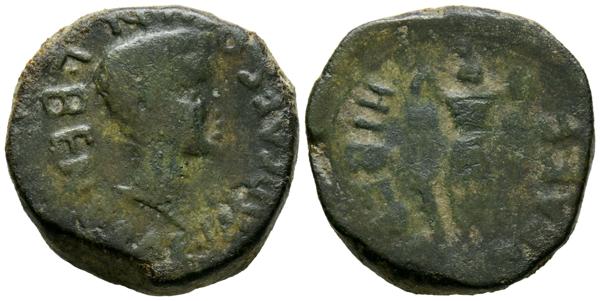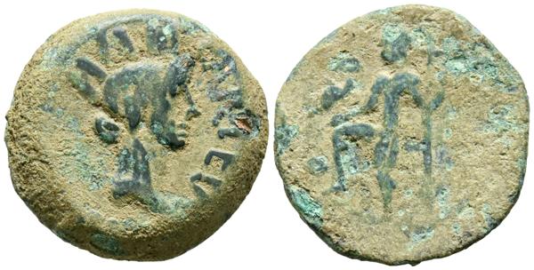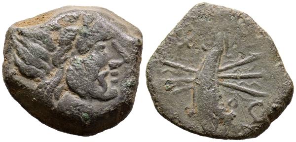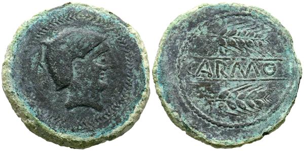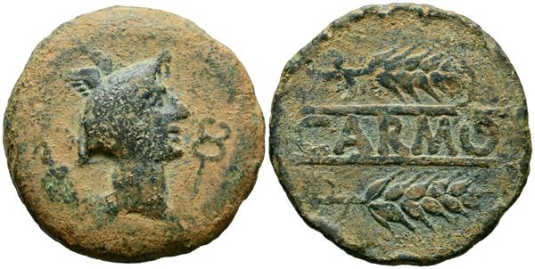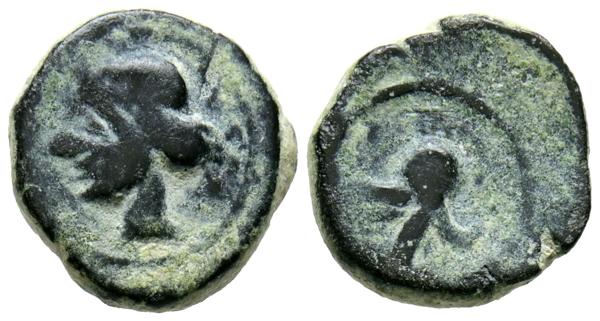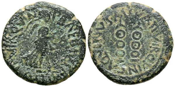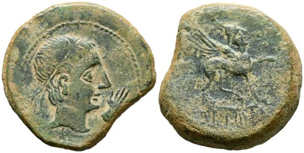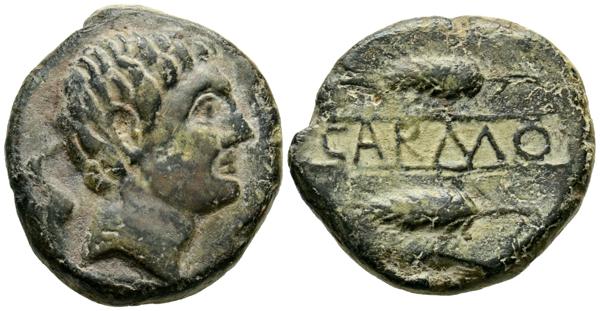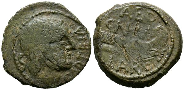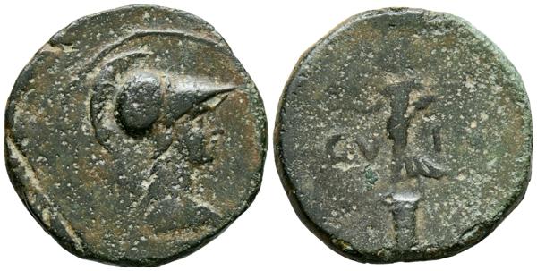 CASTULO (Cazlona, Jaén). Semis. (Ae. 9,13g/23mm). 180 a.C. (FAB-728). Anv: Cabeza masculina diademada a derecha, alrededor leyenda: CN VOC STFR. Rev: Toro a derecha, encima: CN y creciente, delante: CN FVL CN F, en exergo leyenda ibérica: CaSTeLe. MBC-.