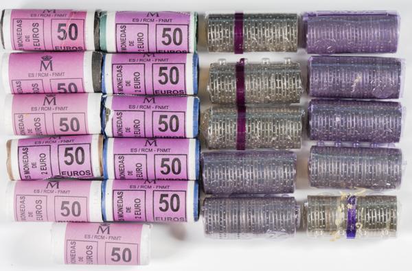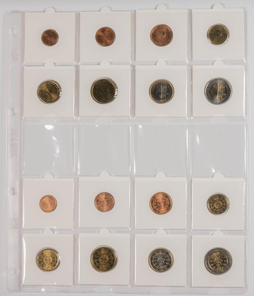 EUROS. Series completas de 15 países: Países Bajos, Portugal, España, Luxemburgo, Malta, Francia, Irlanda, Bégica, Grecia, Estonia, Italia, Alemania, Chipre, Austria y Finlandia. Diferentes fechas de acuñación incluyendo un buen número de primeras series. Total de 120 monedas en estado SC en cartoncillo y expuestas en álbum. A EXAMINAR.