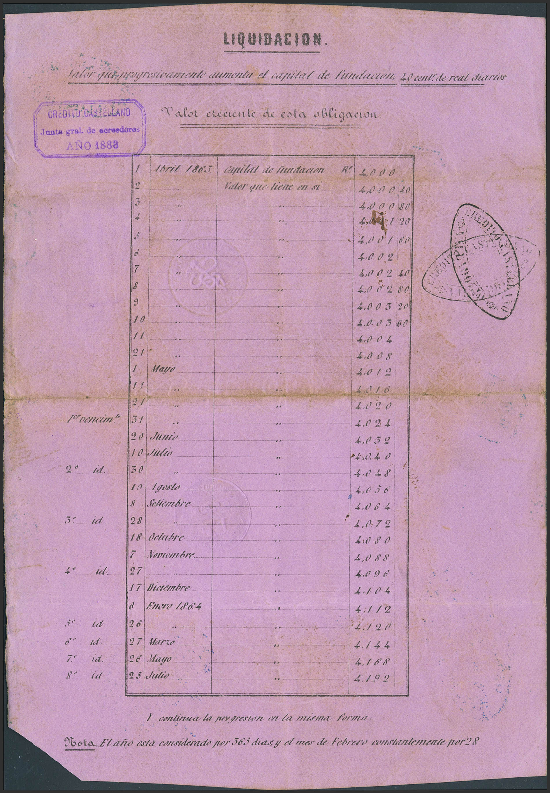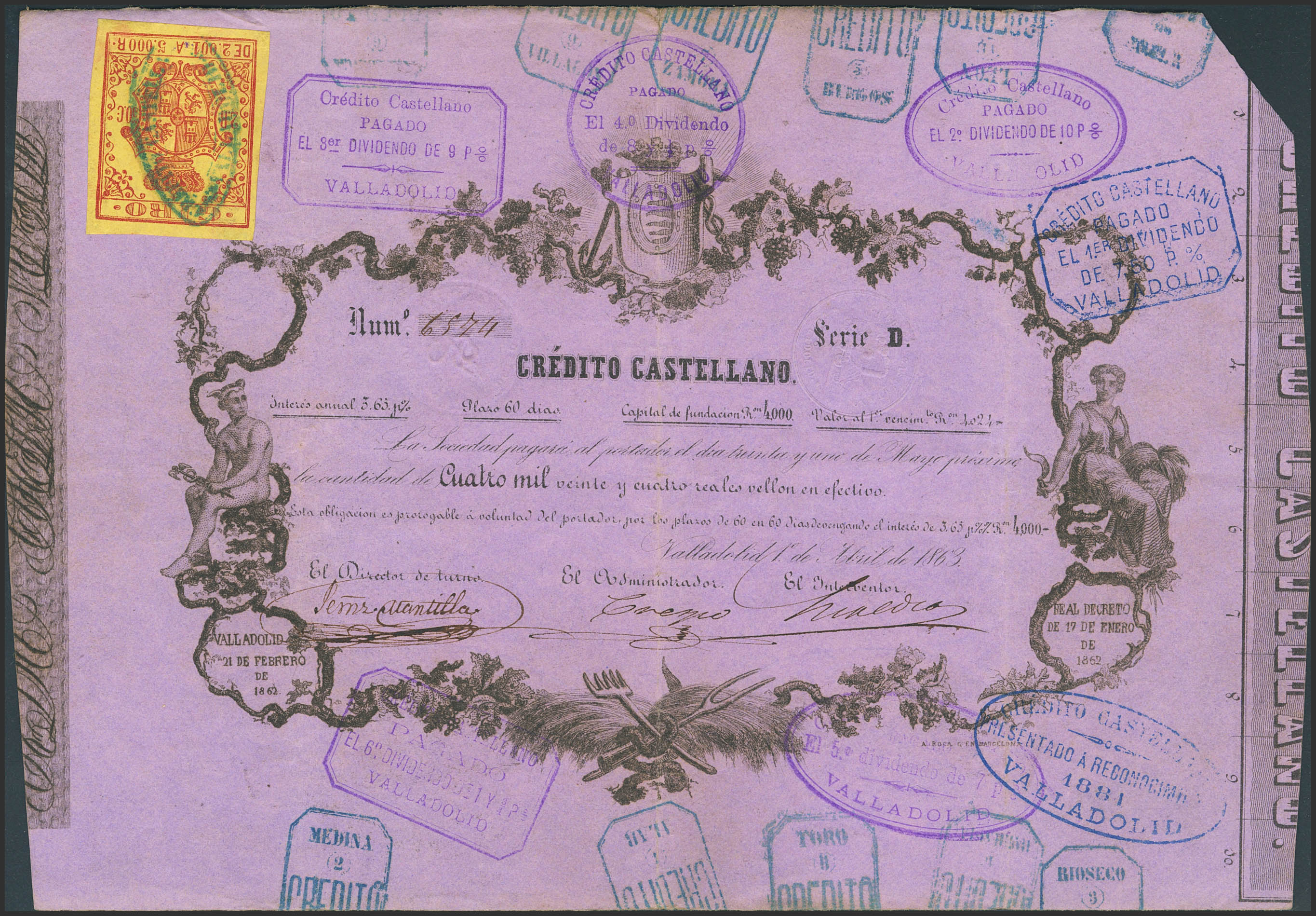CREDITO CASTELLANO. 4024 Reales de Vellón. 21 de Febrero de 1862. Serie D y diversas marcas de uso interno del Banco de Valladolid. Rarísimo, especialmente en esta excepcional calidad. Para entender mejor la contextualización de este billete recomendamos la obra "Obligaciones, vales y documentos puestos en circulación como papel moneda en España", de Don Ramón Cobo Huici. MBC+.