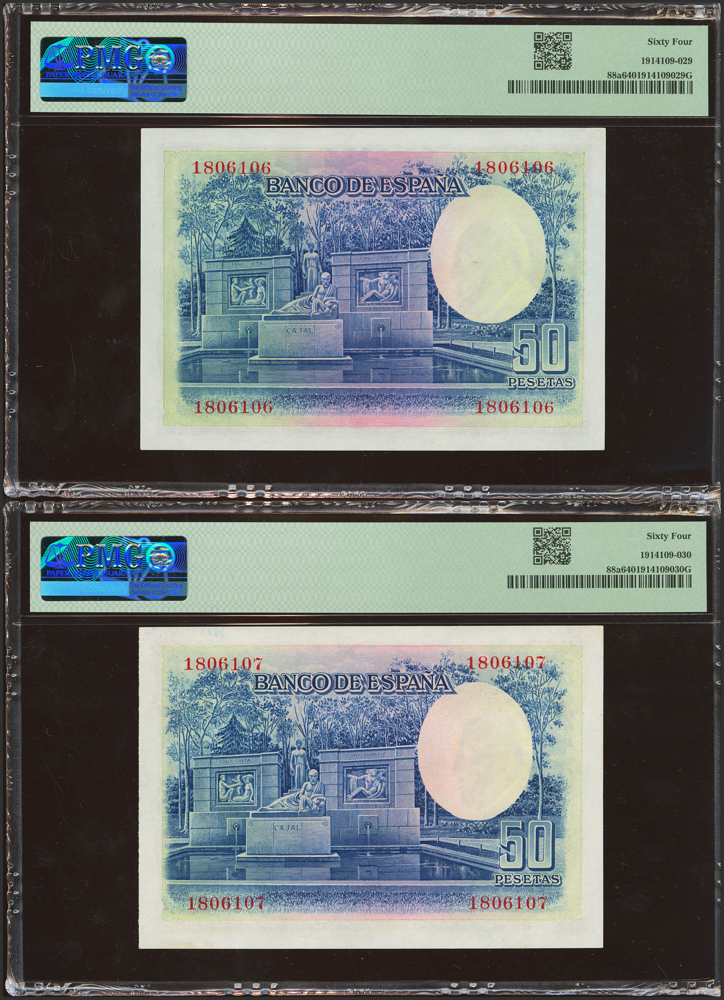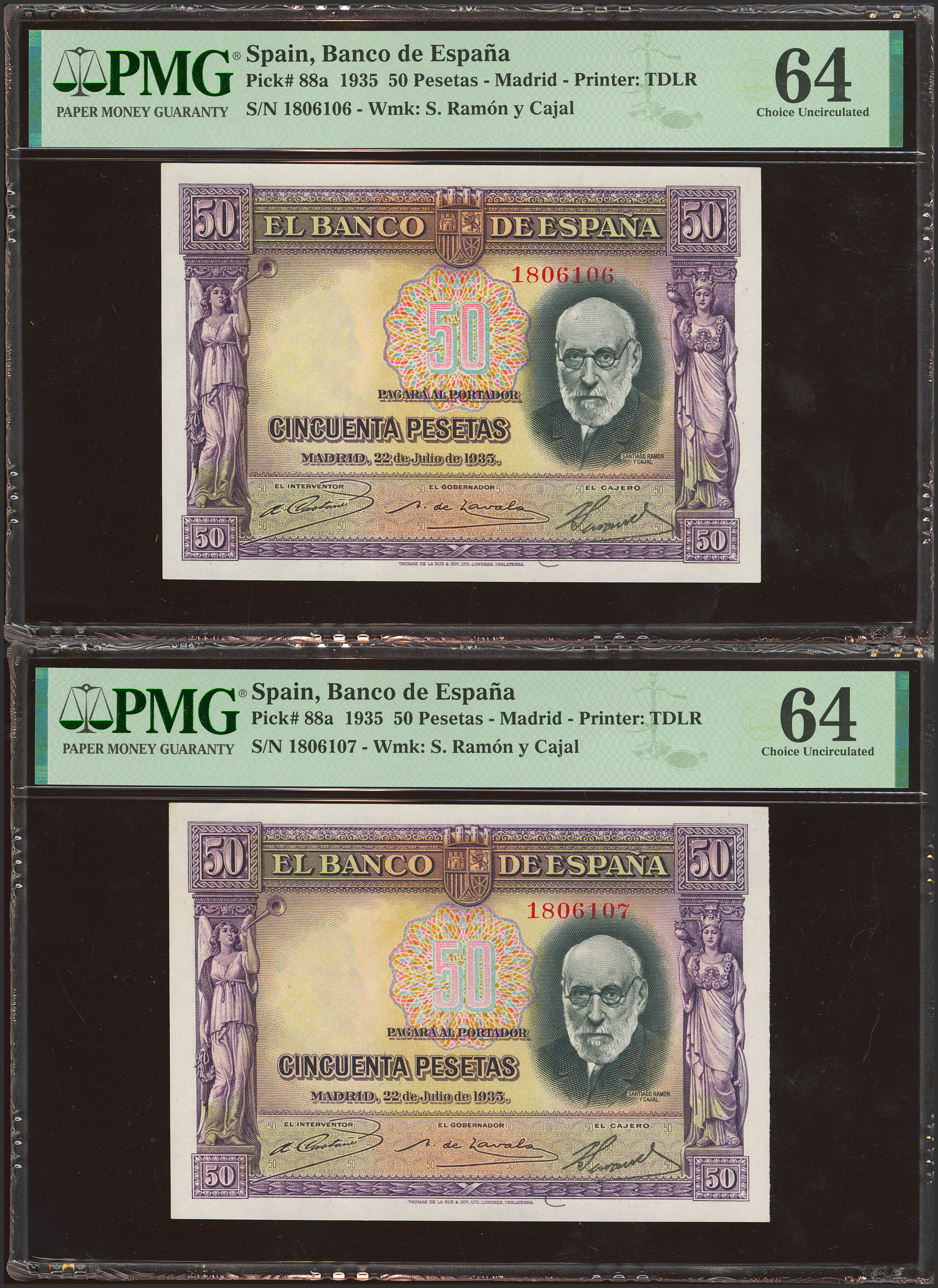 50 Pesetas. 22 de Julio de 1935. Pareja correlativa. Sin serie. (Edifil 2023: 366, Pick: 88a). SC. Encapsulados PMG64, ambos.