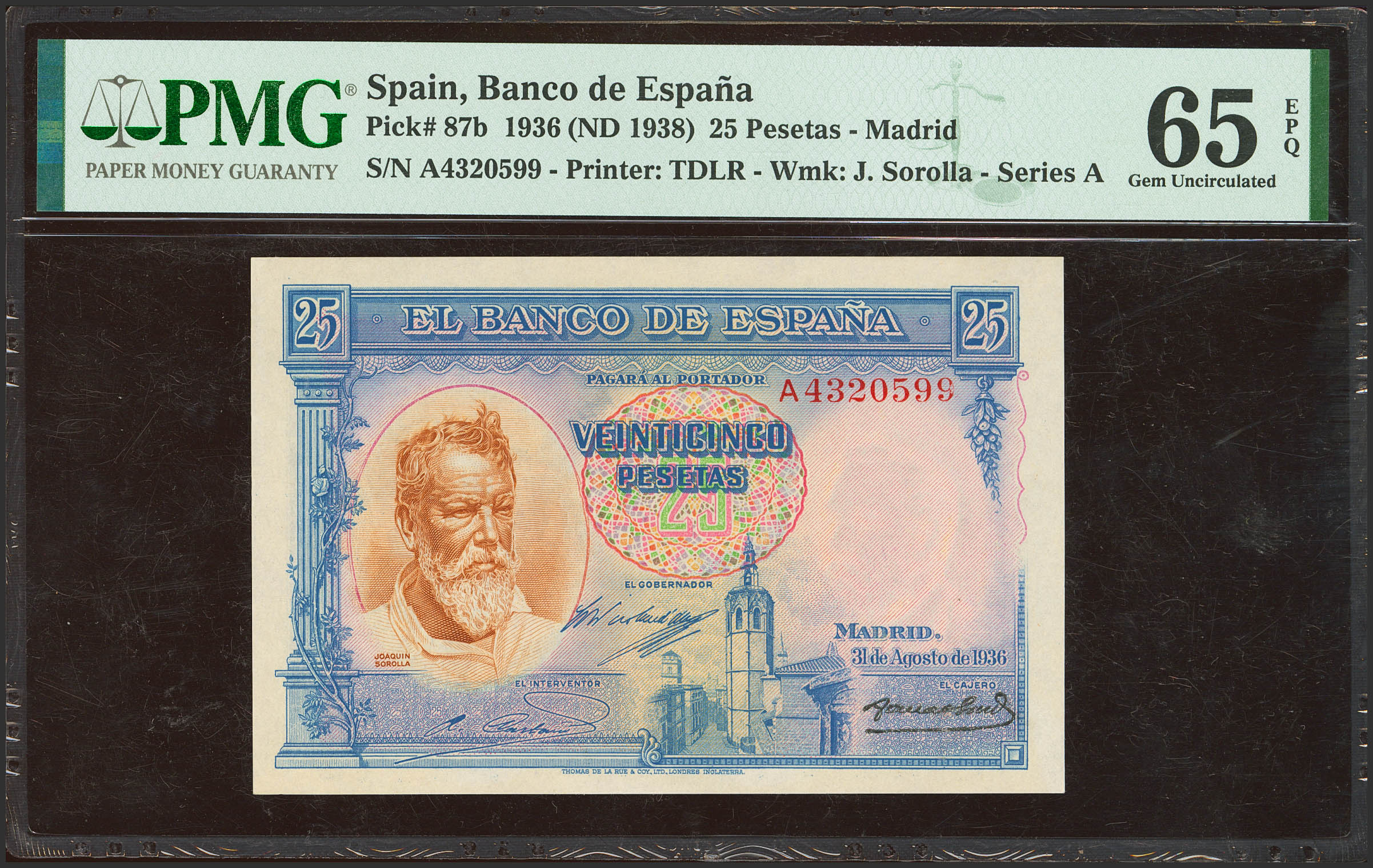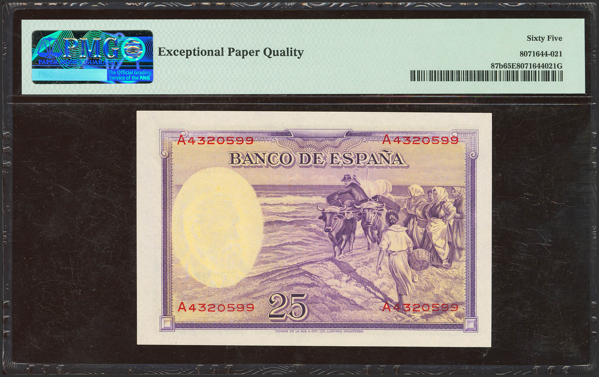 25 Pesetas. 31 de Agosto de 1936. Serie A. (Edifil 2023: 367a, Pick: 87b). Inusual en esta calidad, apresto original. SC. Encapsulado PMG65EPQ.