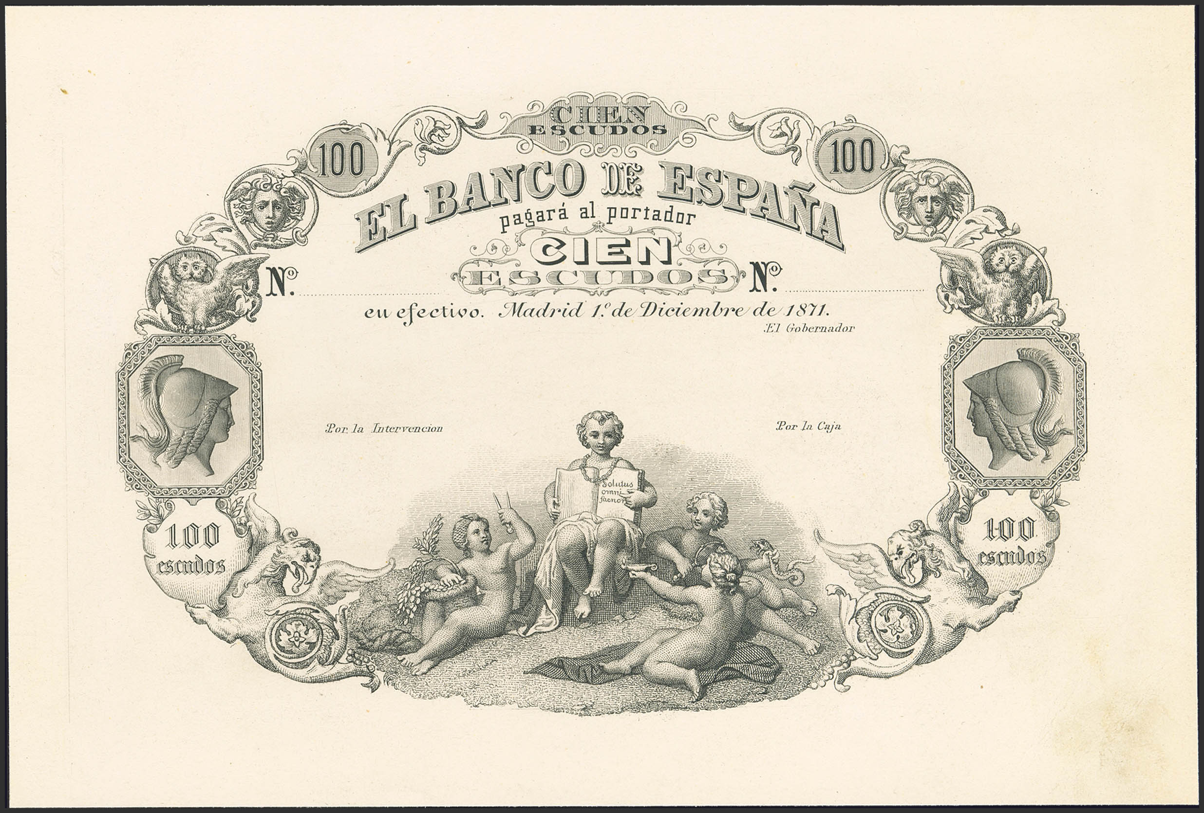 100 Escudos. 1 de Diciembre de 1871. Prueba de anverso. Sin numeración y firmas, sobre cartulina blanca, previamente montado. (Edifil 2023: 247P). Rarísimo. SC-.