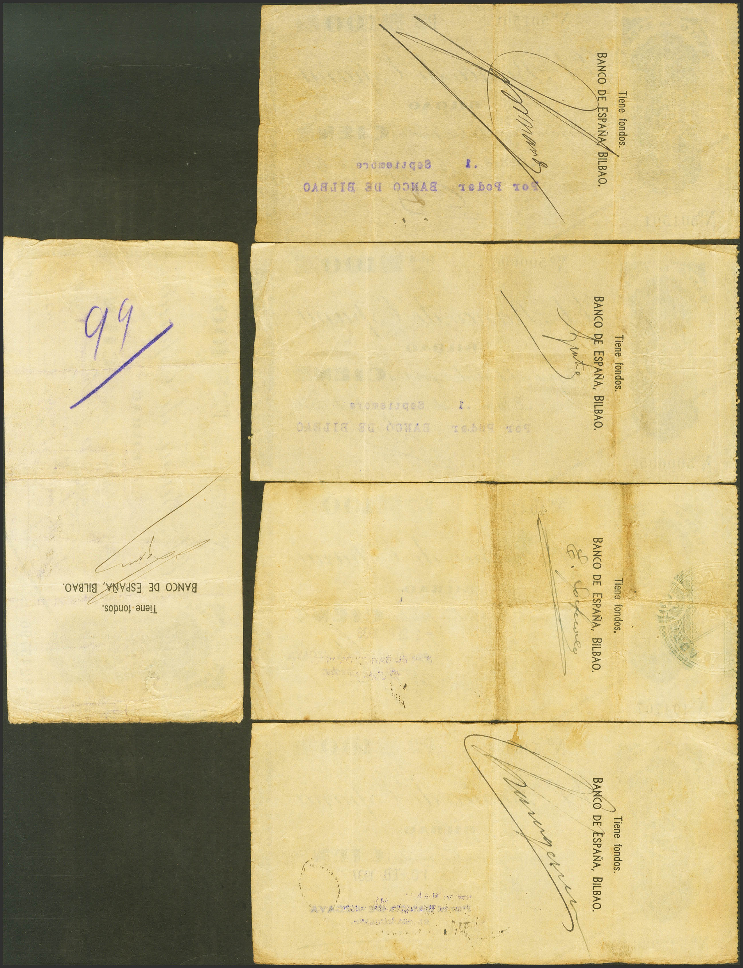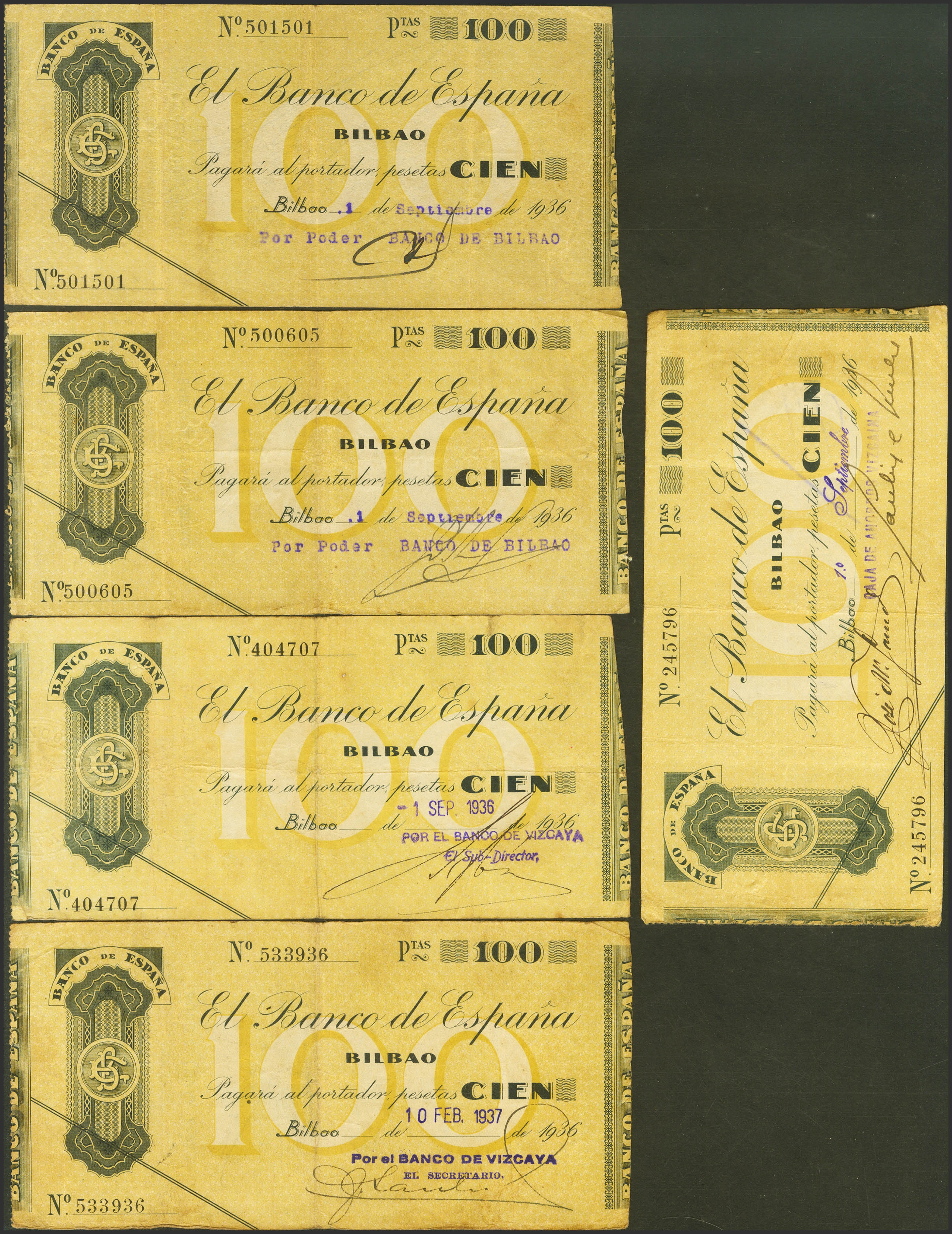 Conjunto de 5 billetes de 100 Pesetas del Banco de Bilbao, emitidos en 1936, todos ellos sin serie y con diversas antefirmas. (Edifil 2023: 371). MBC.