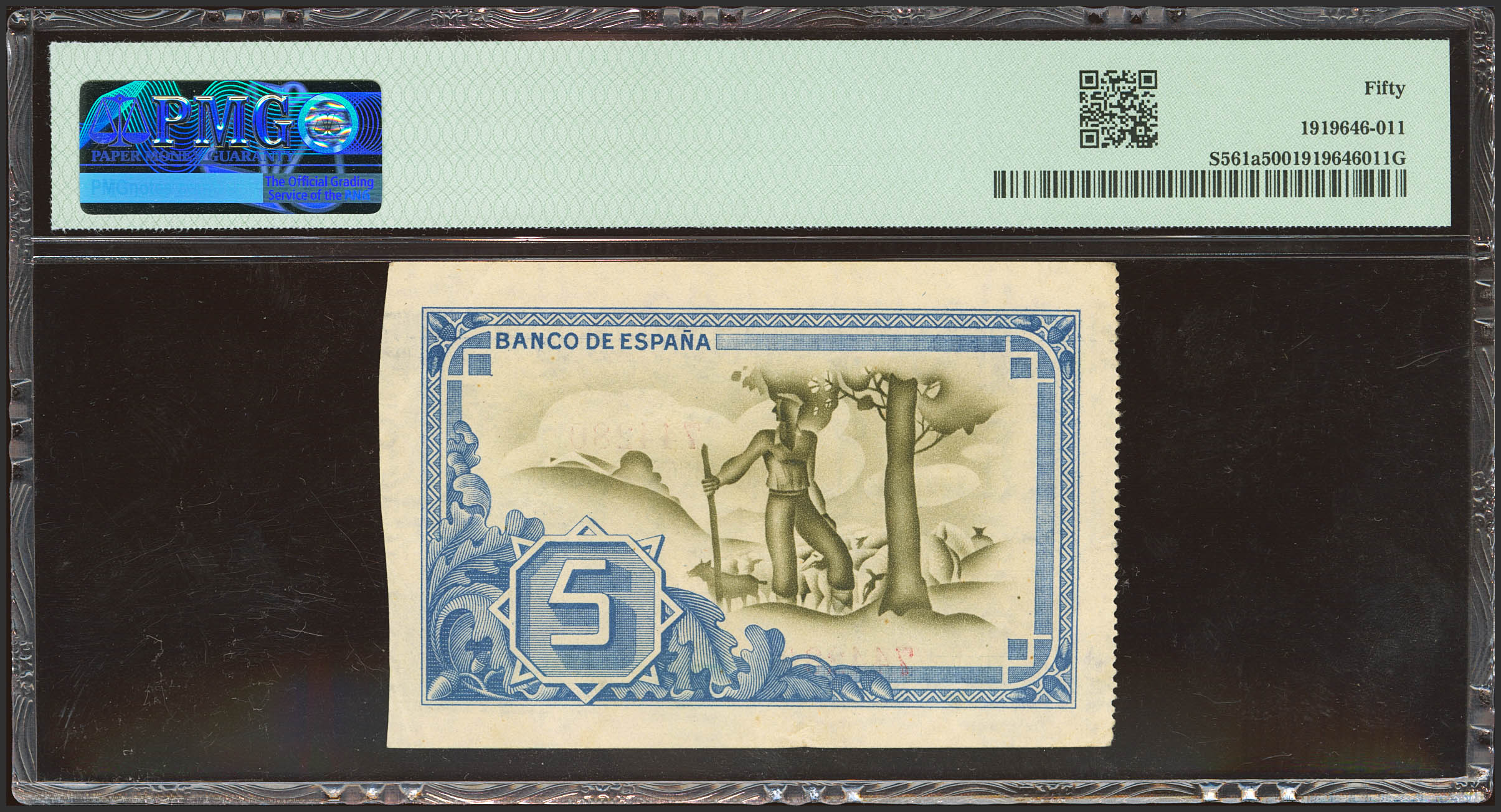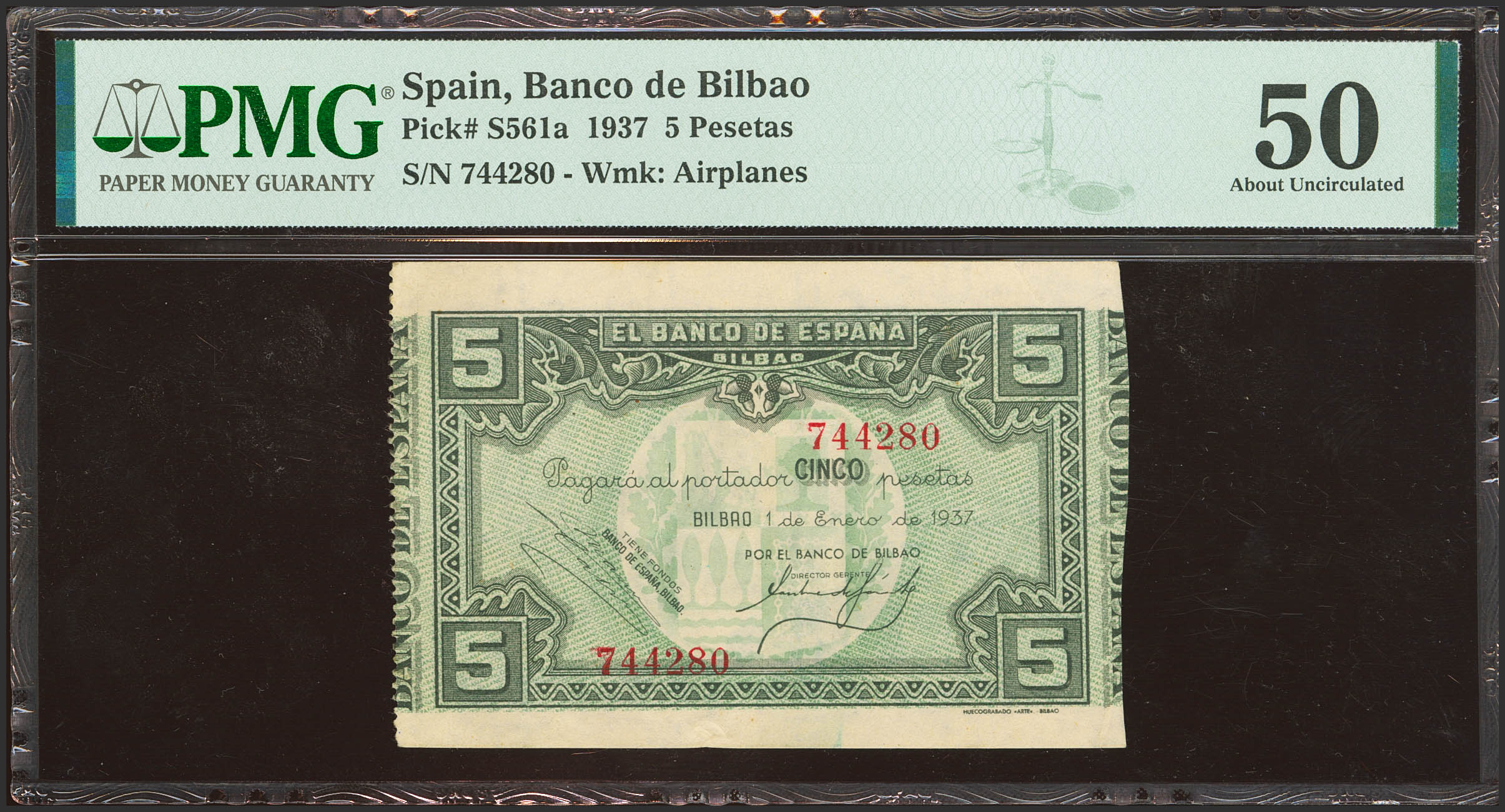 5 Pesetas. 1 de Enero de 1937. Sucursal de Bilbao, antefirma del Banco de Bilbao. Sin serie, con numeración y sin matrices. (Edifil 2023: 385c, Pick: S561a). EBC. Encapsulado PMG50.
