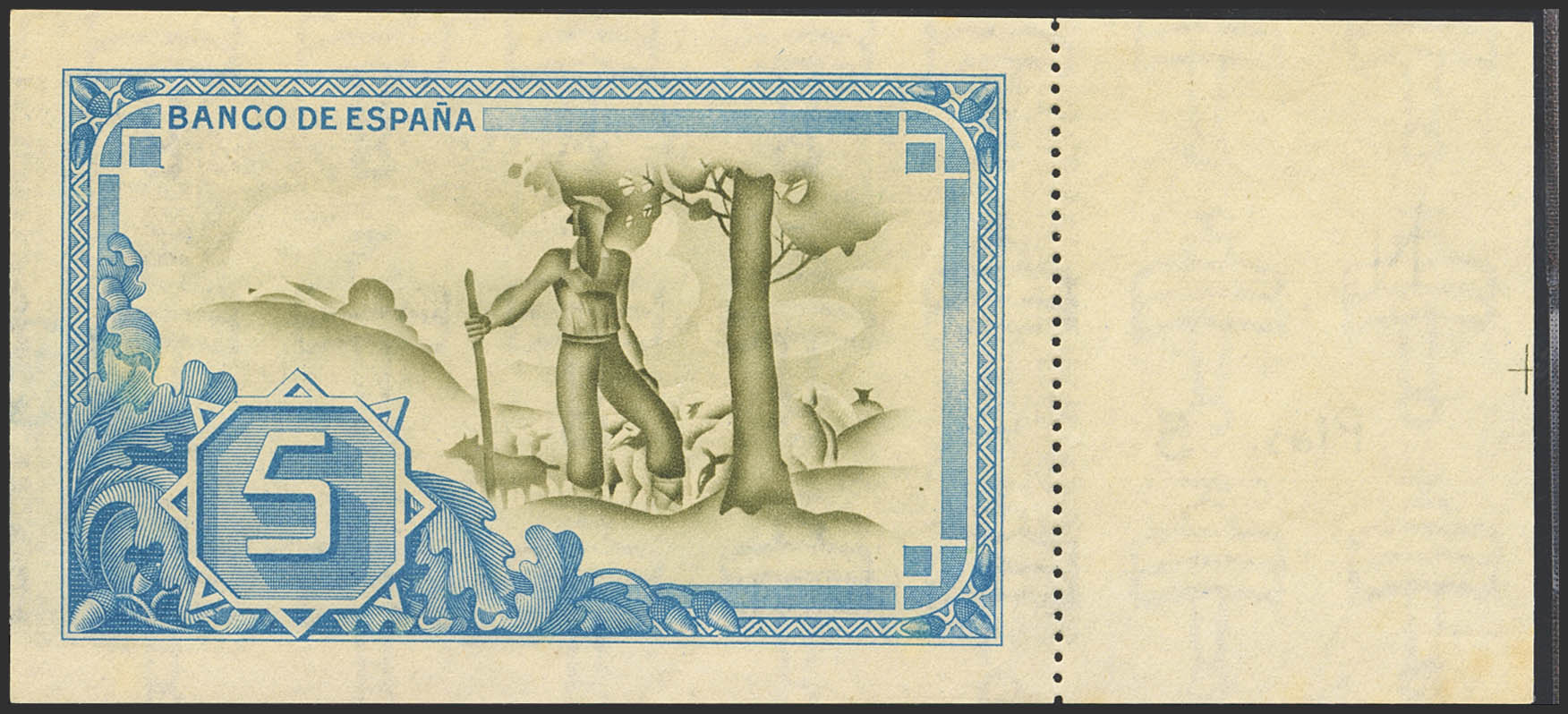 5 Pesetas. 1 de Enero de 1937. Sucursal de Bilbao, antefirma Banco de Bilbao. Sin serie y sin numeración, con la matriz a la izquierda. (Edifil 2023: 385c). Apresto original. SC--.