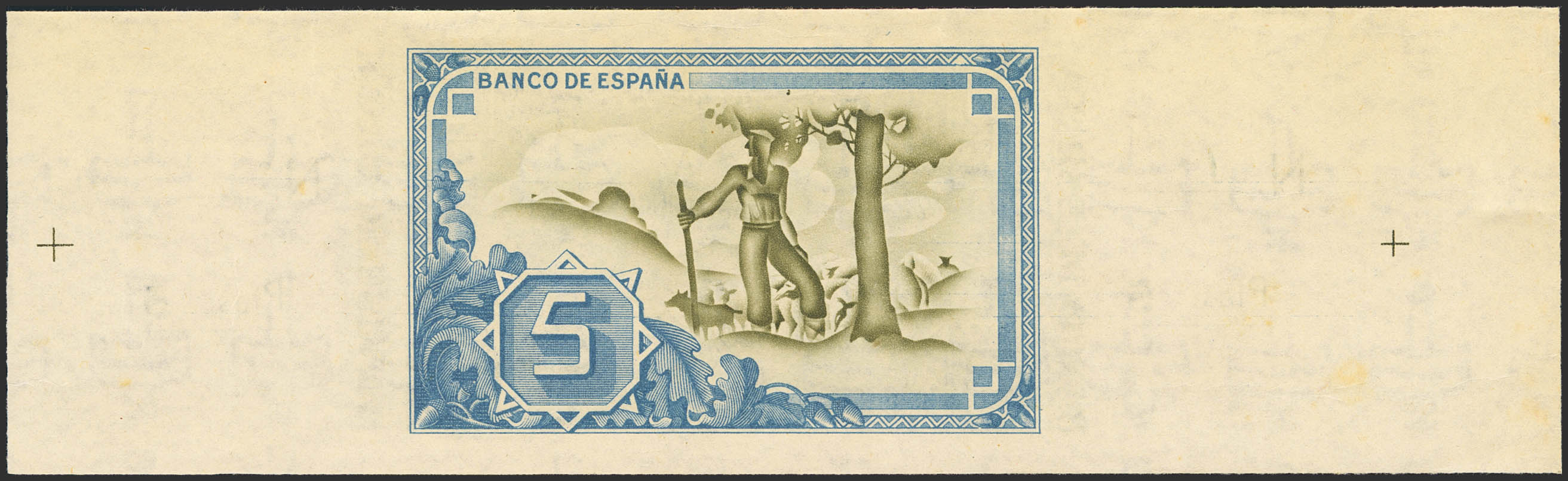 5 Pesetas. 1 de Enero de 1937. Sucursal de Bilbao, antefirma Banco Urquijo Vascongado. Serie A y sin numeración, con ambas matrices. (Edifil 2023: 386f). Manchitas típicas. SC-.