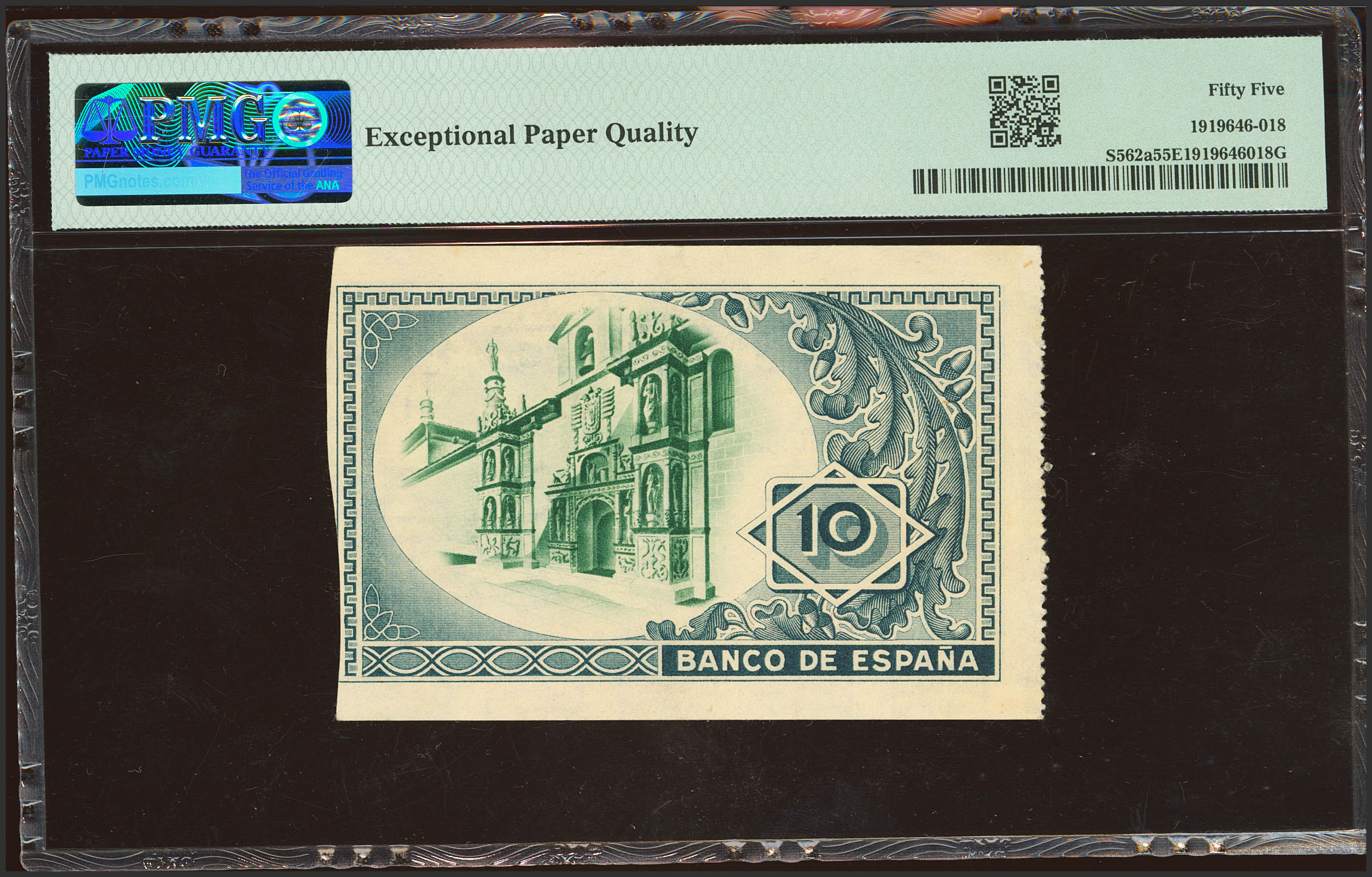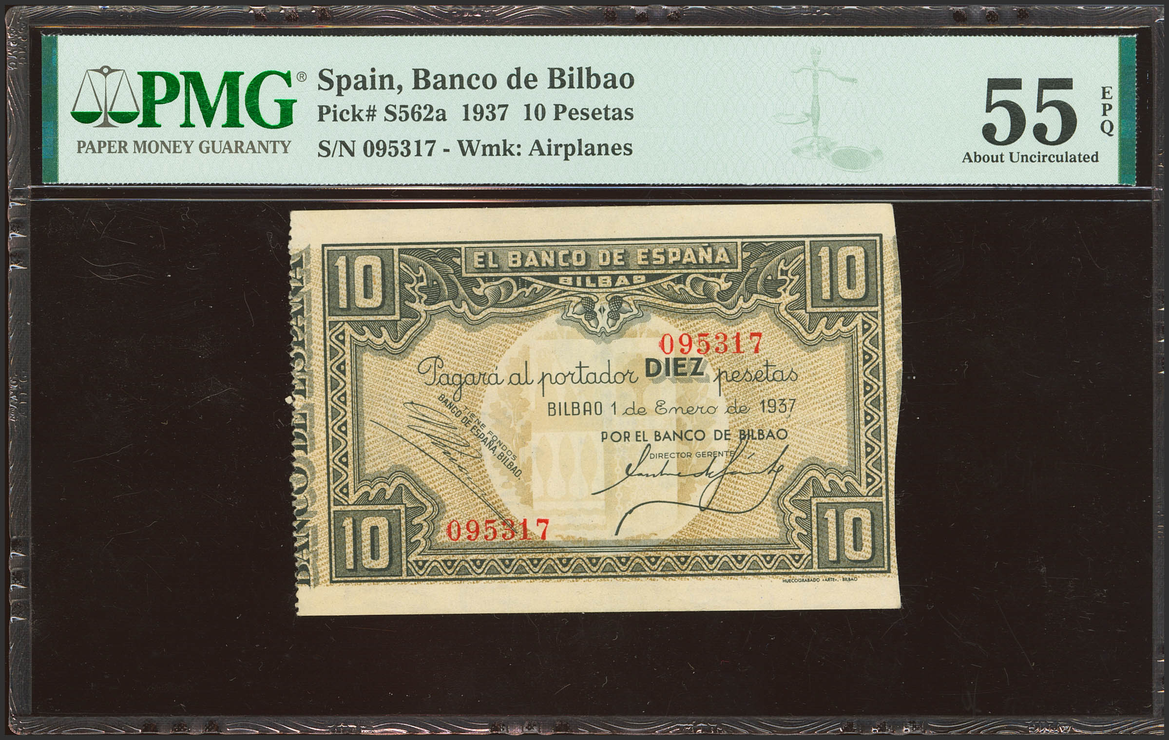 10 Pesetas. 1 de Enero de 1937. Sucursal de Bilbao, antefirma Banco de Bilbao. Sin serie, con numeración y sin matrices. (Edifil 2023: 387a). Apresto original. Encapsulado PMG55EPQ.