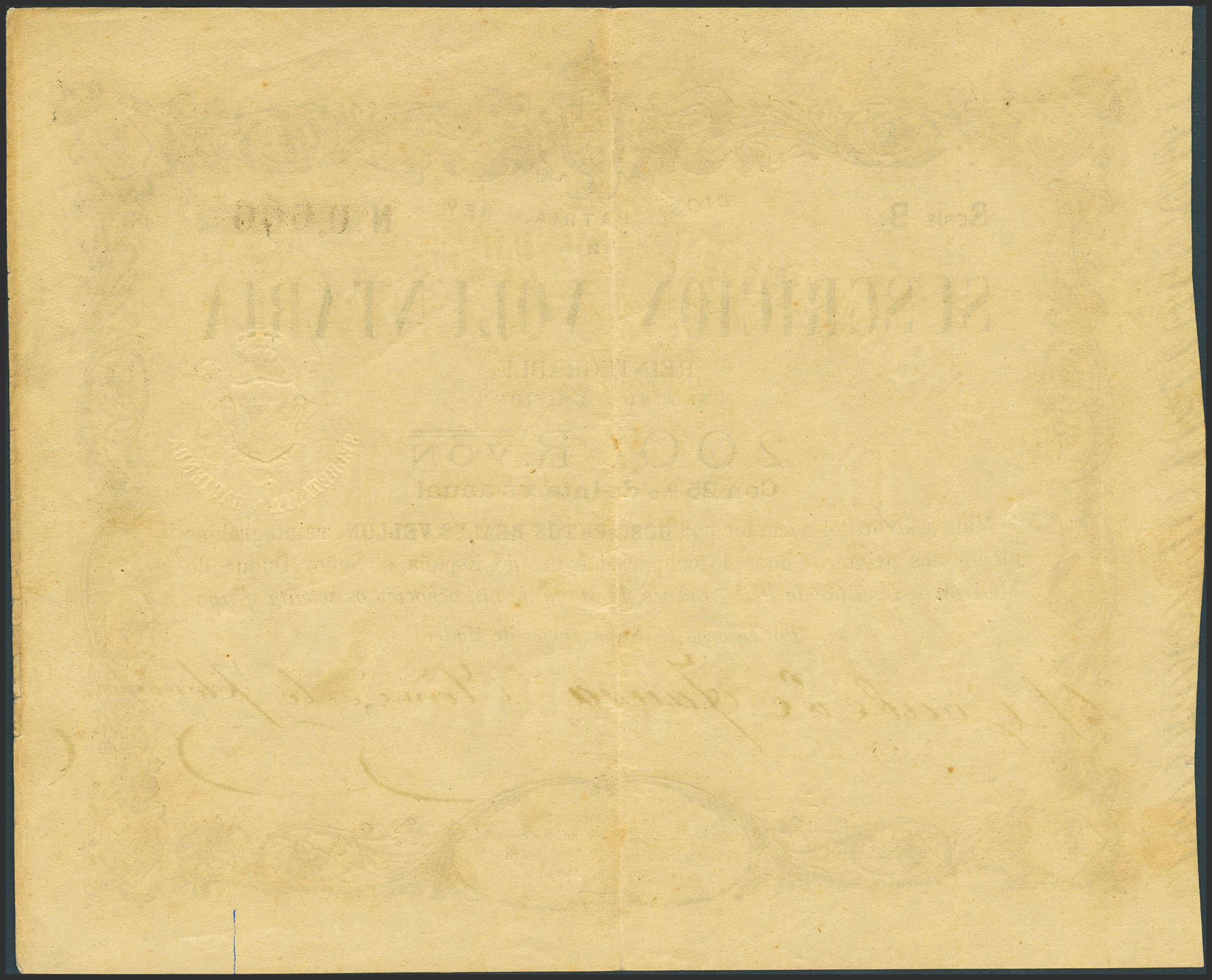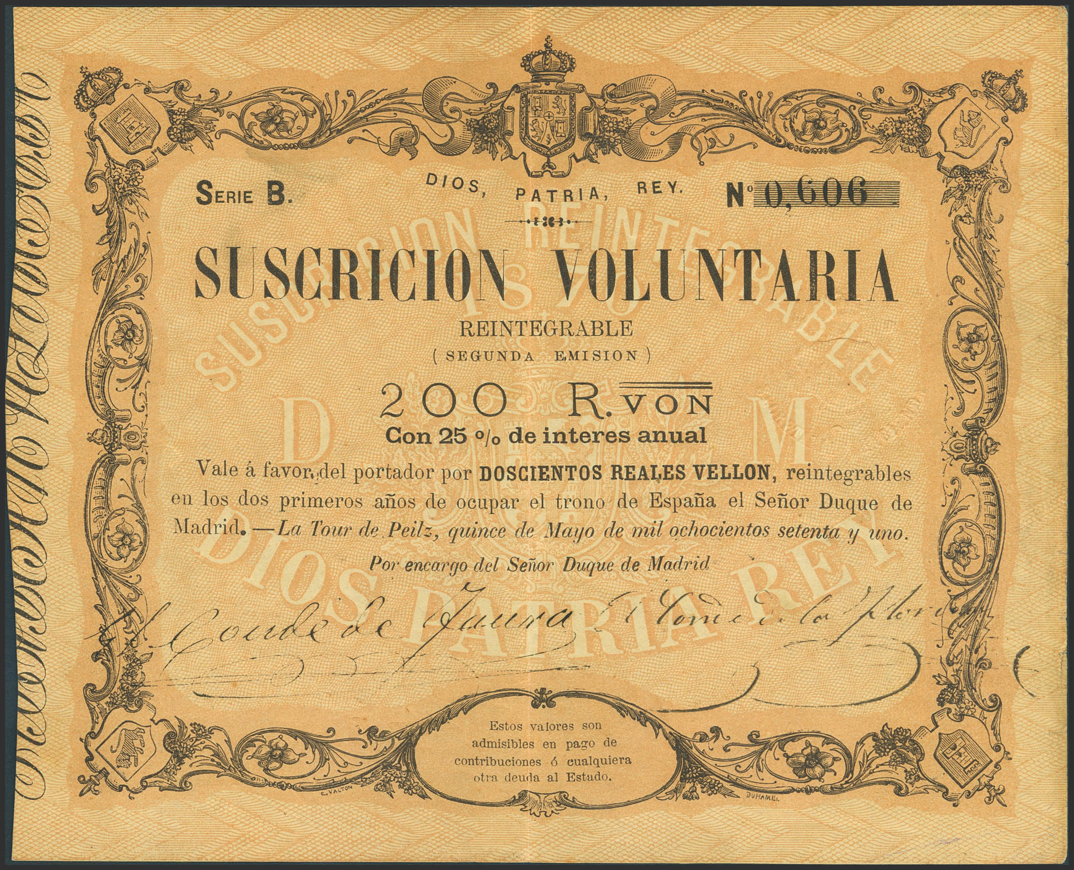 200 Reales de Vellón. 15 de Mayo de 1870. Segunda emisión de Tour de Peilz. Serie B. (Edifil 2021: 203). MBC+.