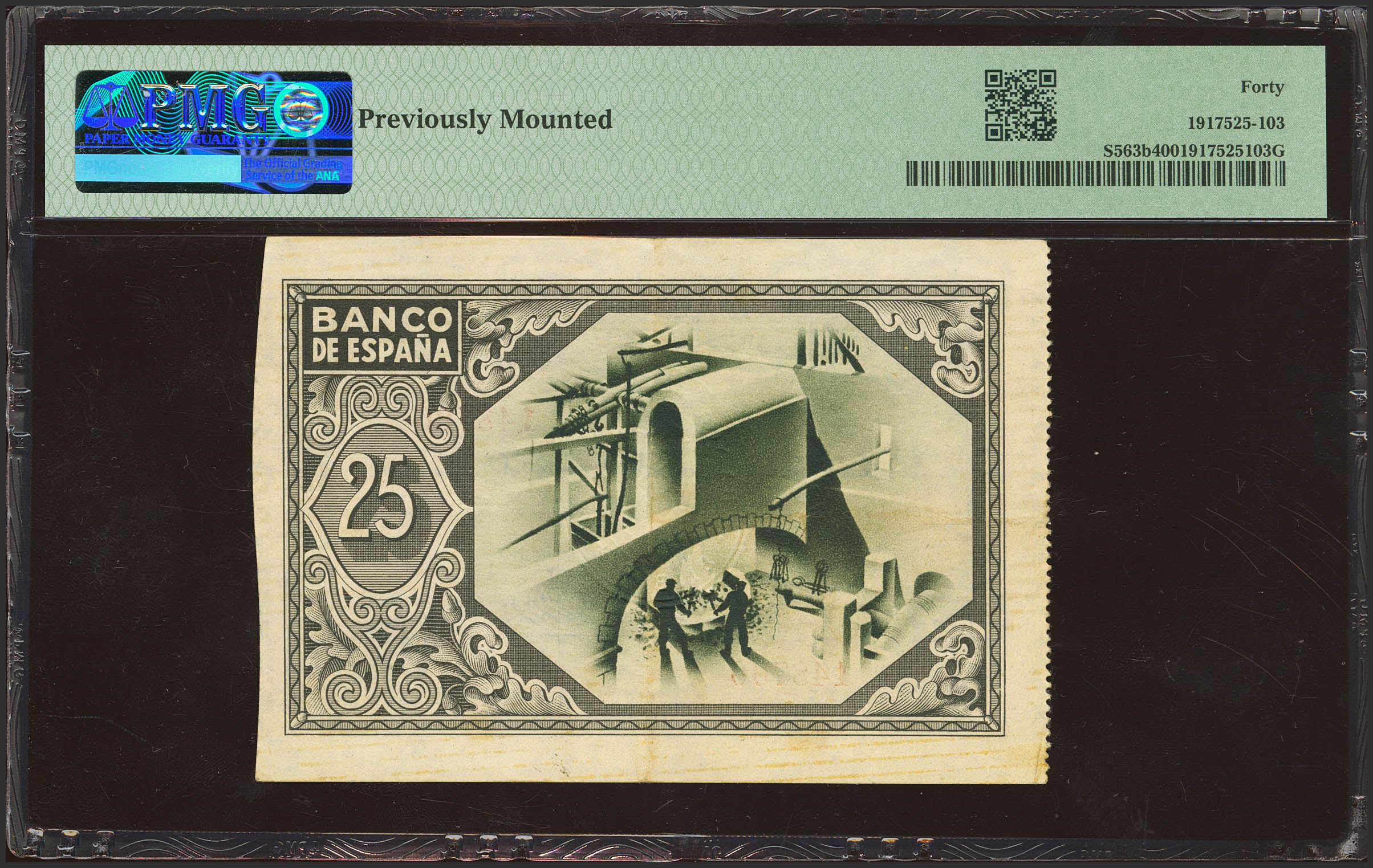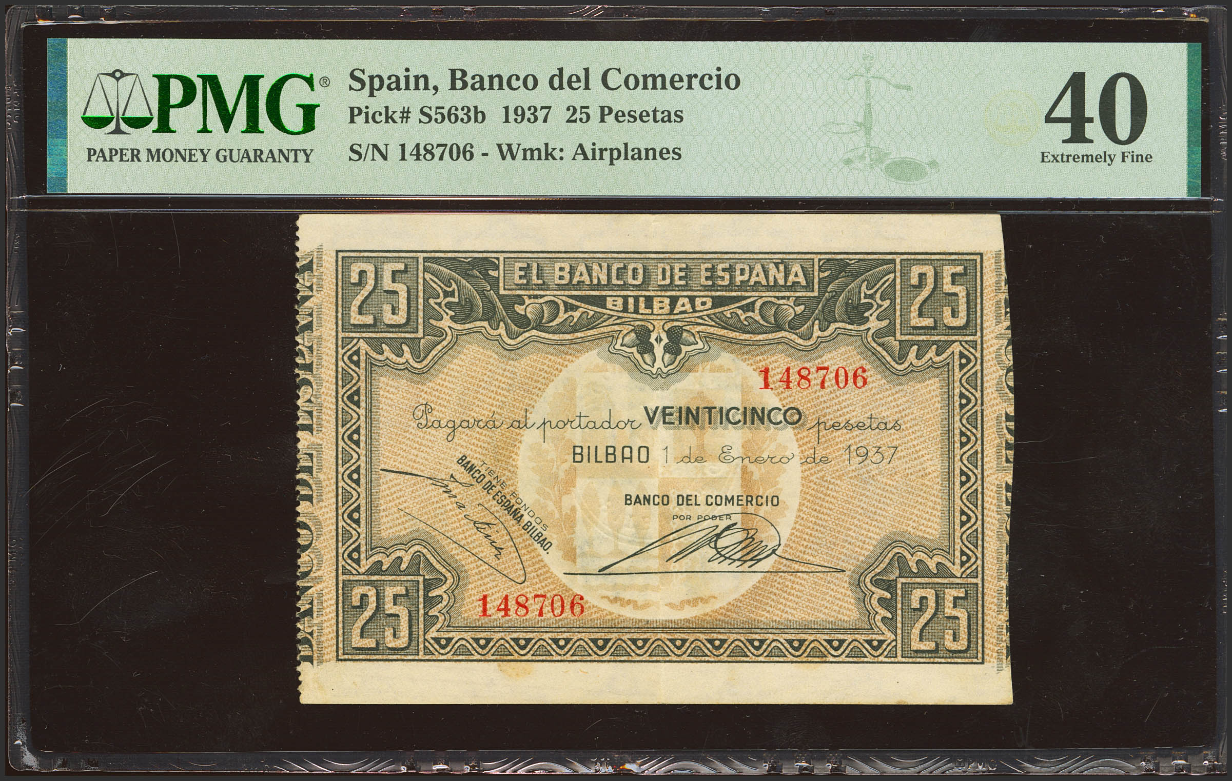 25 Pesetas. 1 de Enero de 1937. Sucursal de Bilbao, antefirma Banco del Comercio. Sin serie, con numeración y sin matrices. (Edifil 2023: 388b, Pick: S563b). EBC-. Encapsulado PMG40 (previusly mounted).