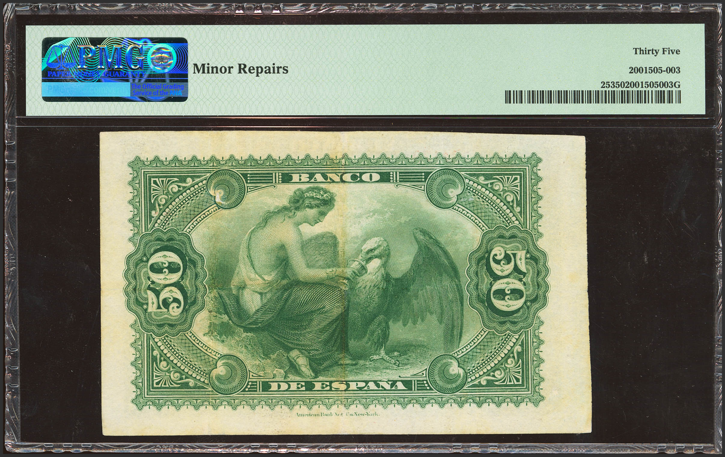 50 Pesetas. 1 de Enero de 1884. Sin serie. (Edifil 2023: 283, Pick: 25). Raro, mínimamente reparado. MBC+. Encapsulado PMG35 (minor repairs).