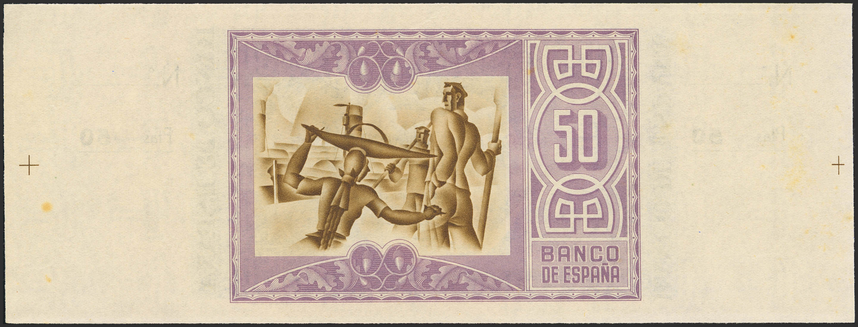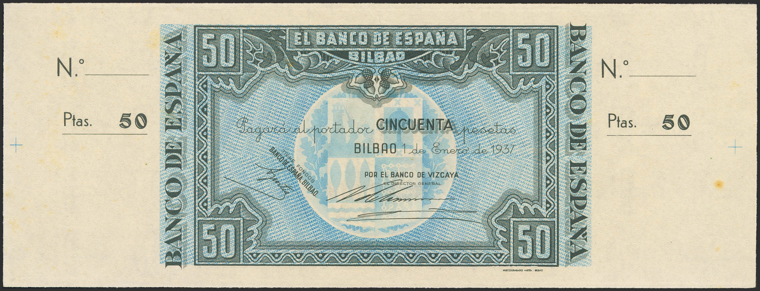 50 Pesetas. 1 de Enero de 1937. Sucursal de Bilbao, antefirma Banco de Vizcaya. Sin serie y sin numeración, con ambas matrices. (Edifil 2023: 389b). Apresto original, típicas manchitas del tiempo. SC.