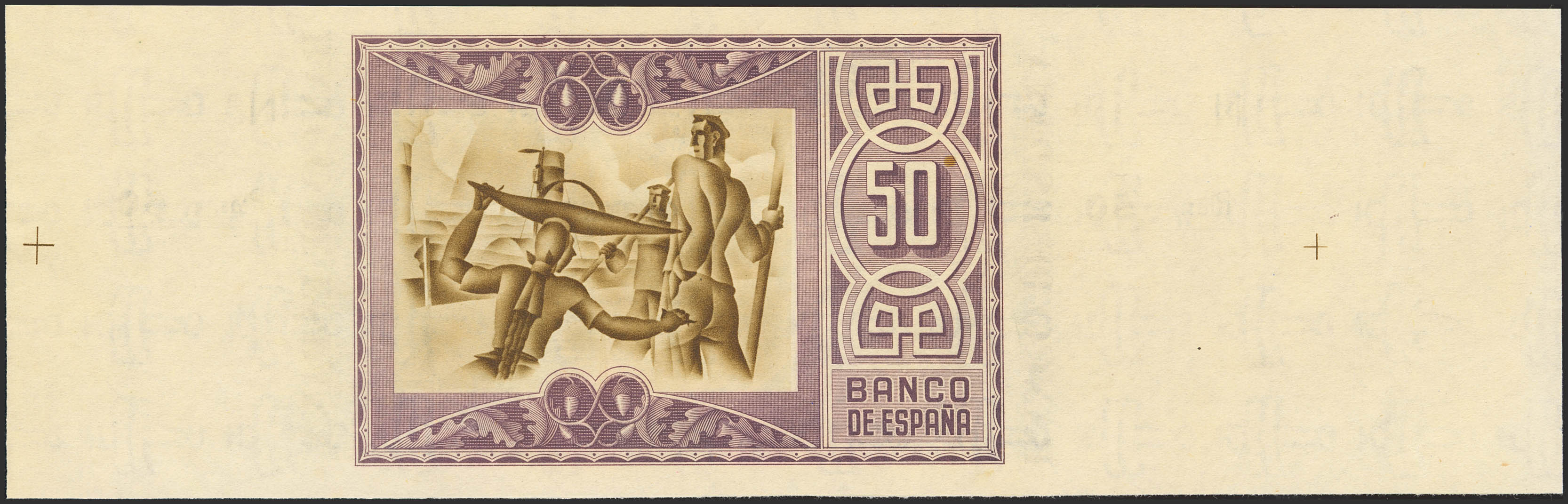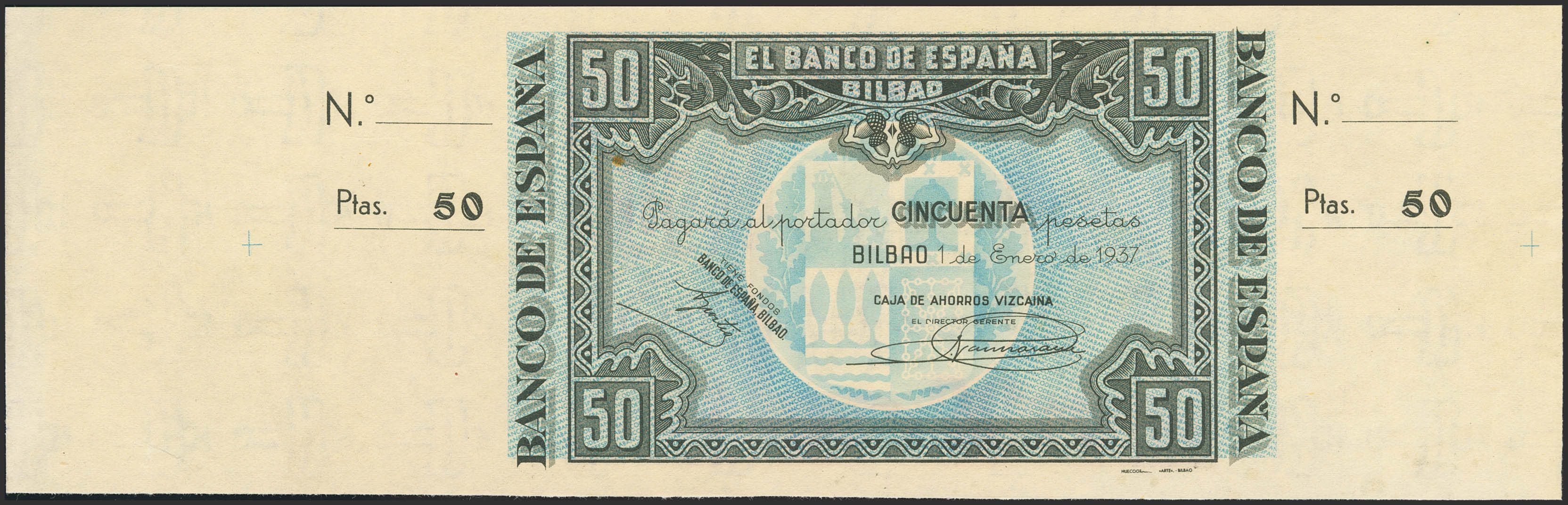 50 Pesetas. 1 de Enero de 1937. Sucursal de Bilbao, antefirma Caja de Ahorros Vizcaína. Sin serie y sin numeración, con ambas matrices. (Edifil 2023: 389f). Apresto original, puntito del tiempo. SC.